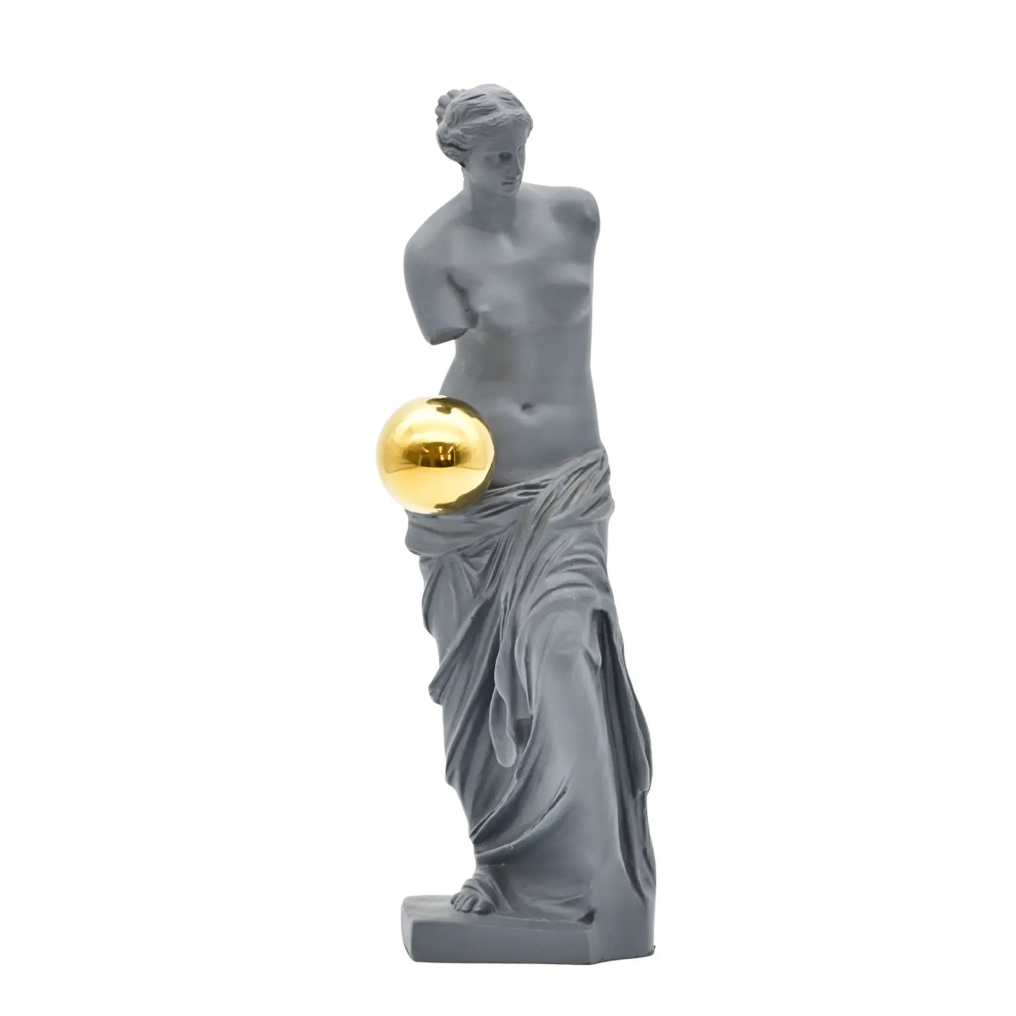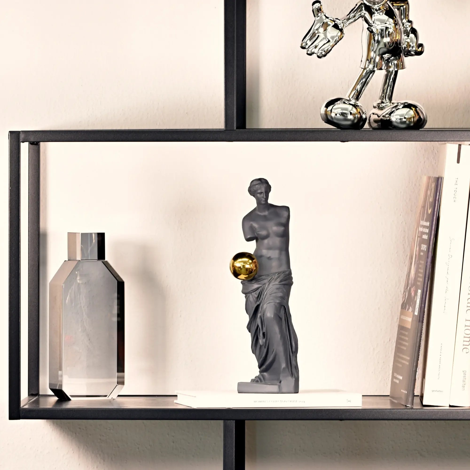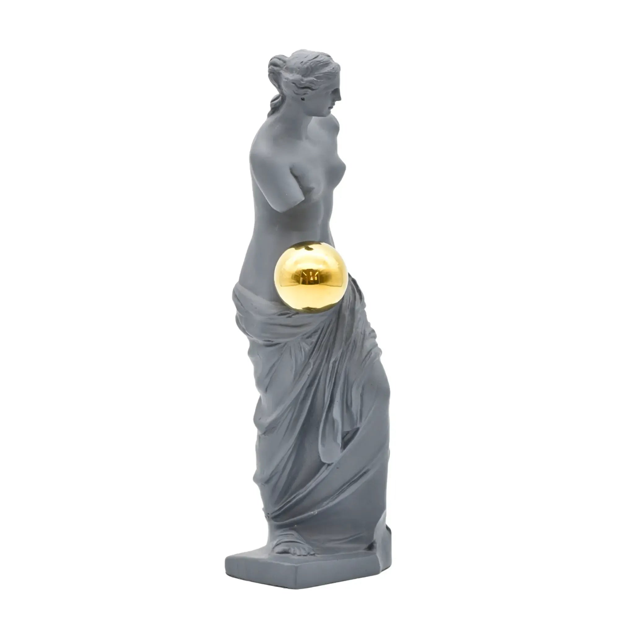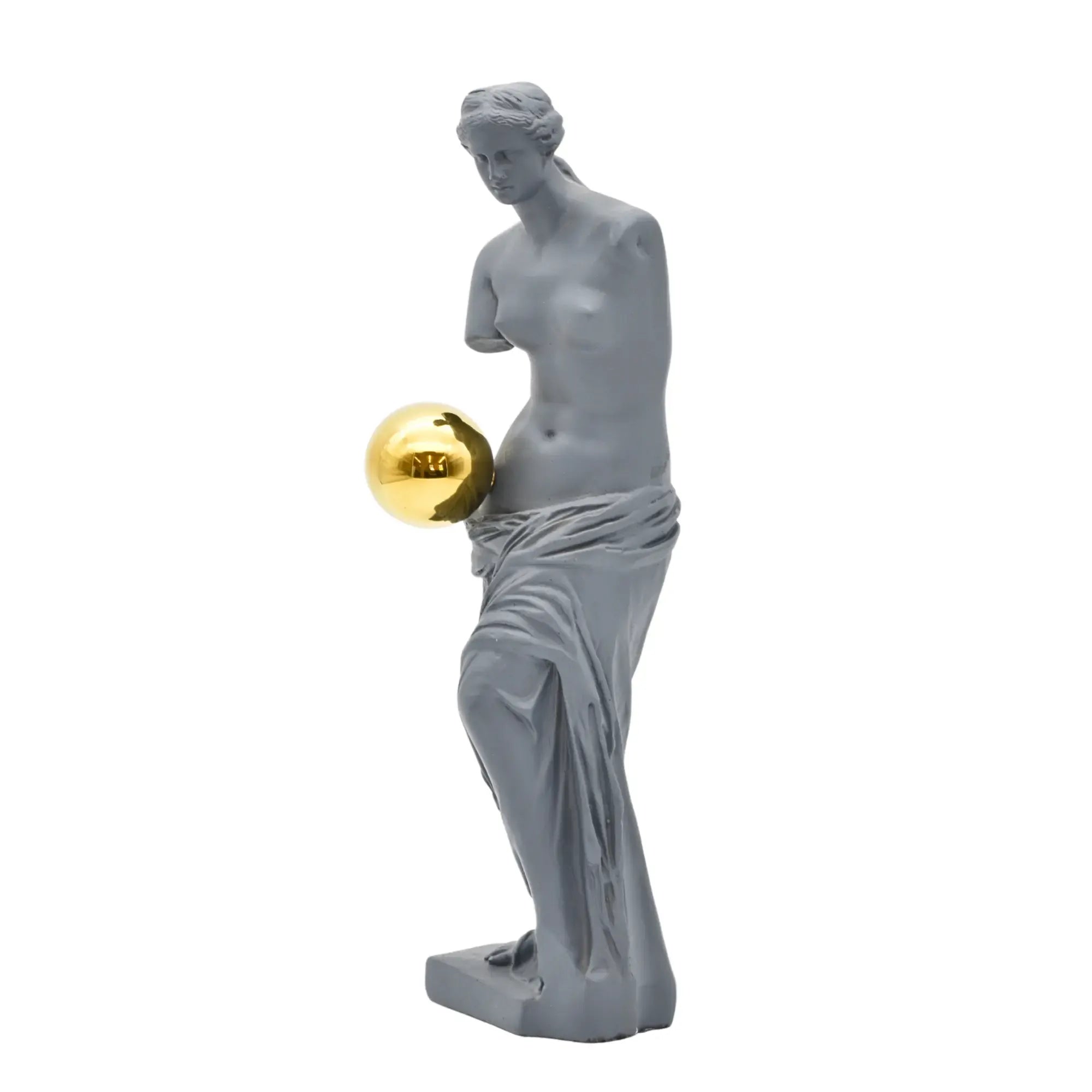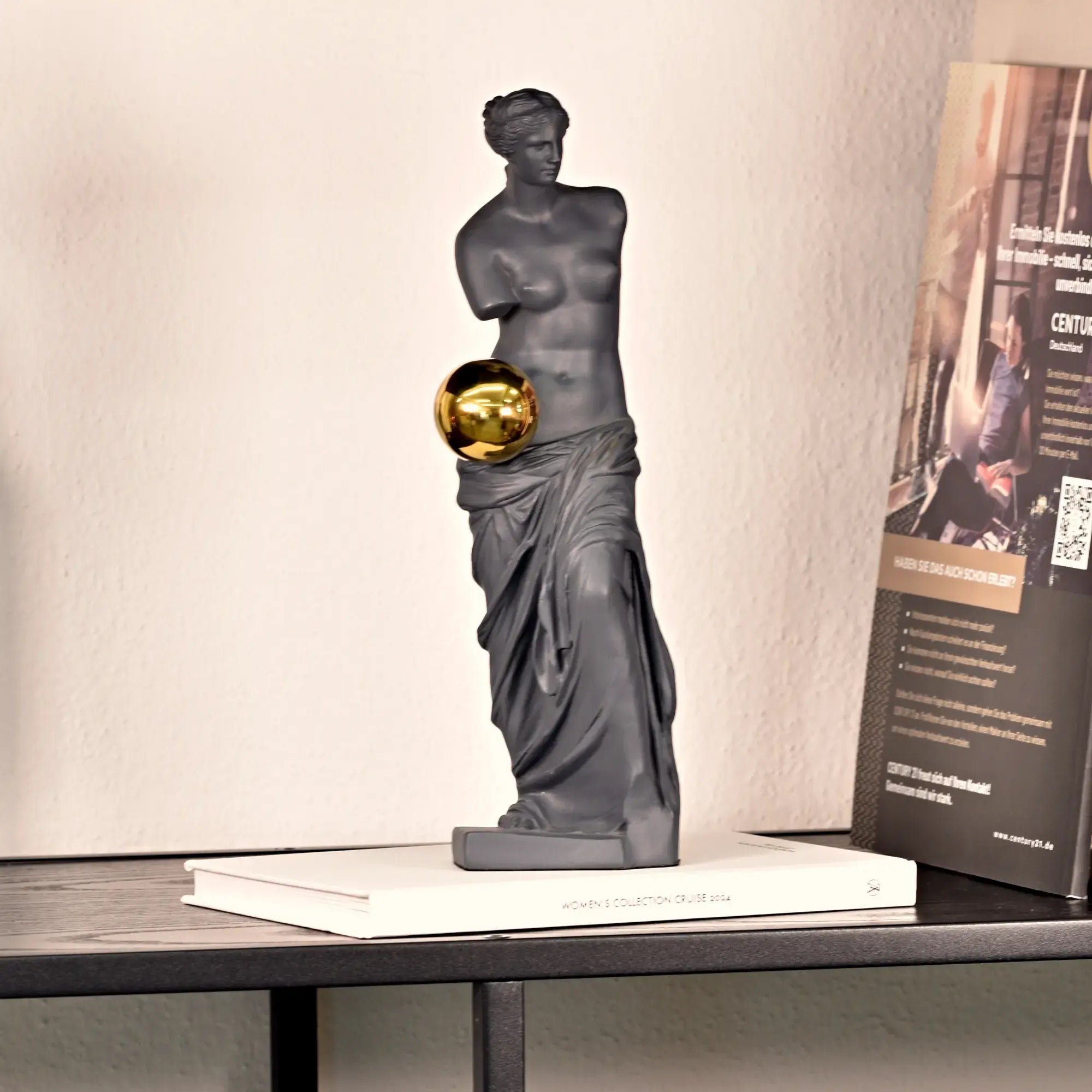 Eine elegante Hommage an die Antike trifft auf zeitgenössisches Design: Die stilisierte Frauenfigur in mattem Tiefschwarz trägt eine goldglänzende Sphäre – ein ikonischer Kontrast von Ruhe und Strahlkraft. Die reduzierte Silhouette erinnert an die klassische Ästhetik einer Aphrodite, während der spiegelnde Kugelakzent das Licht einfängt und dem Objekt eine moderne, skulpturale Präsenz verleiht.