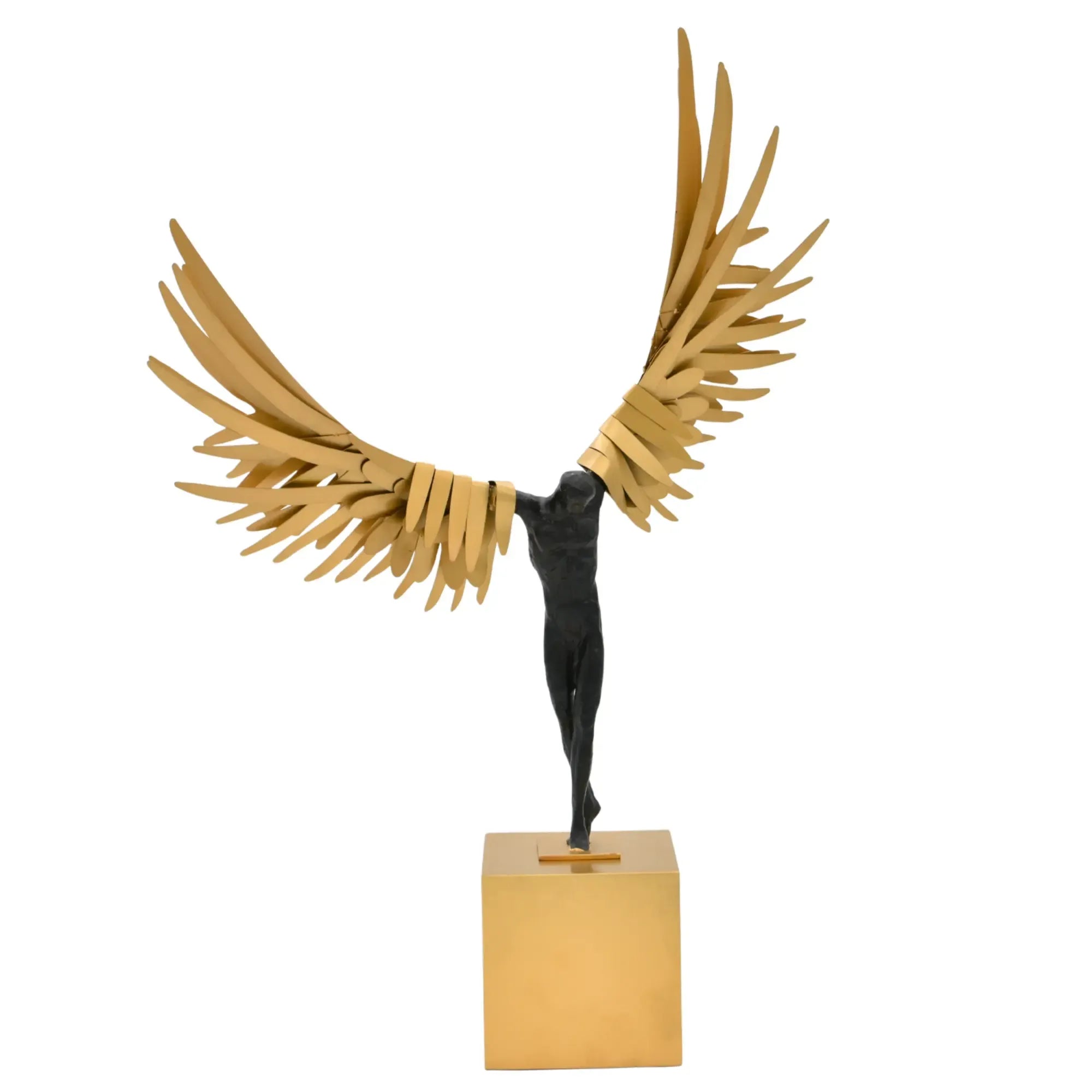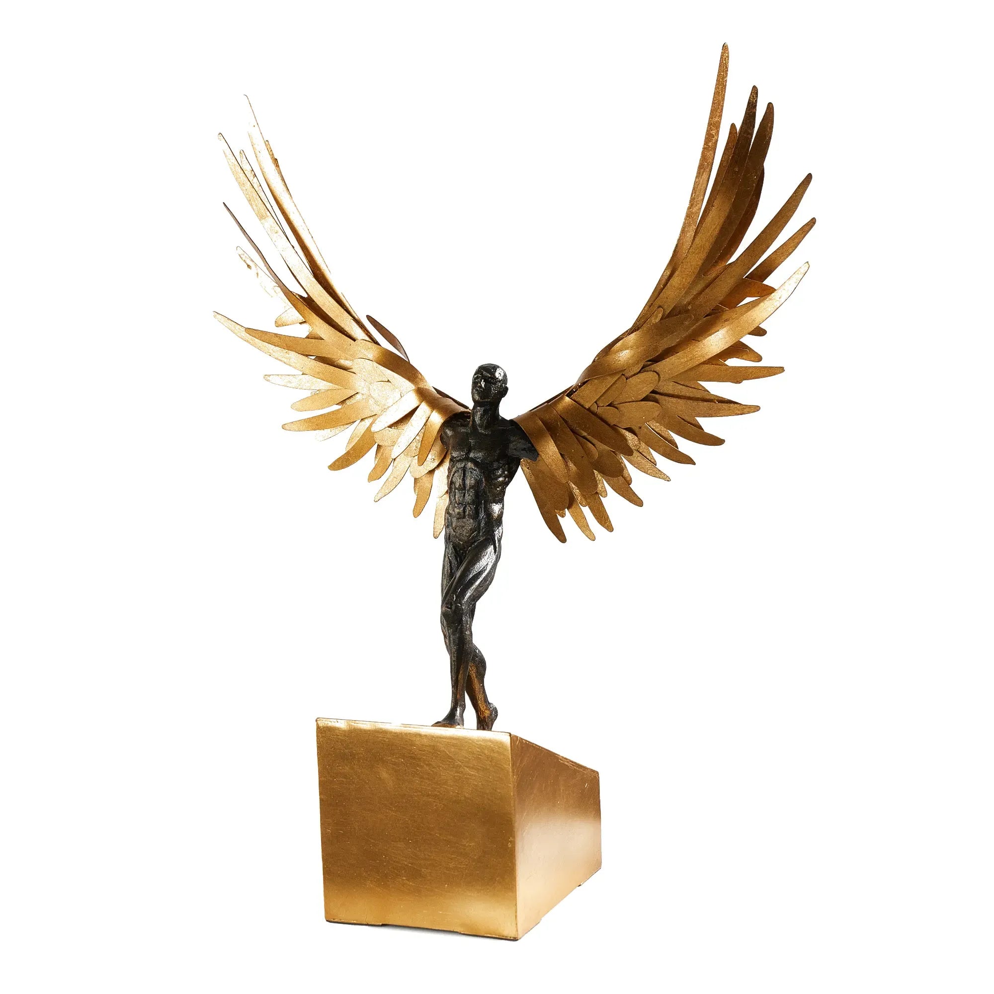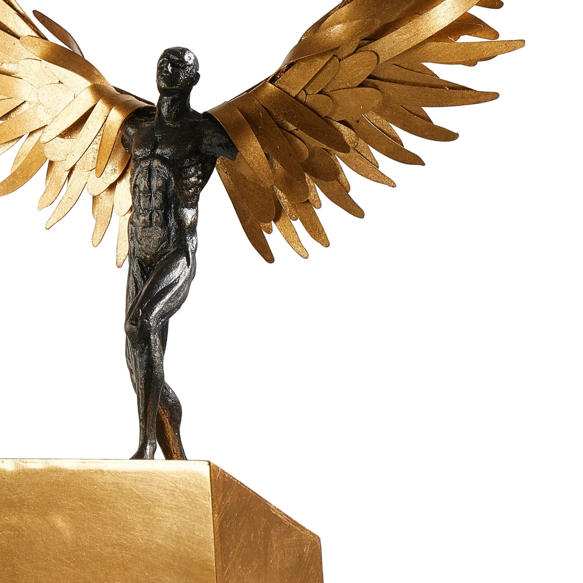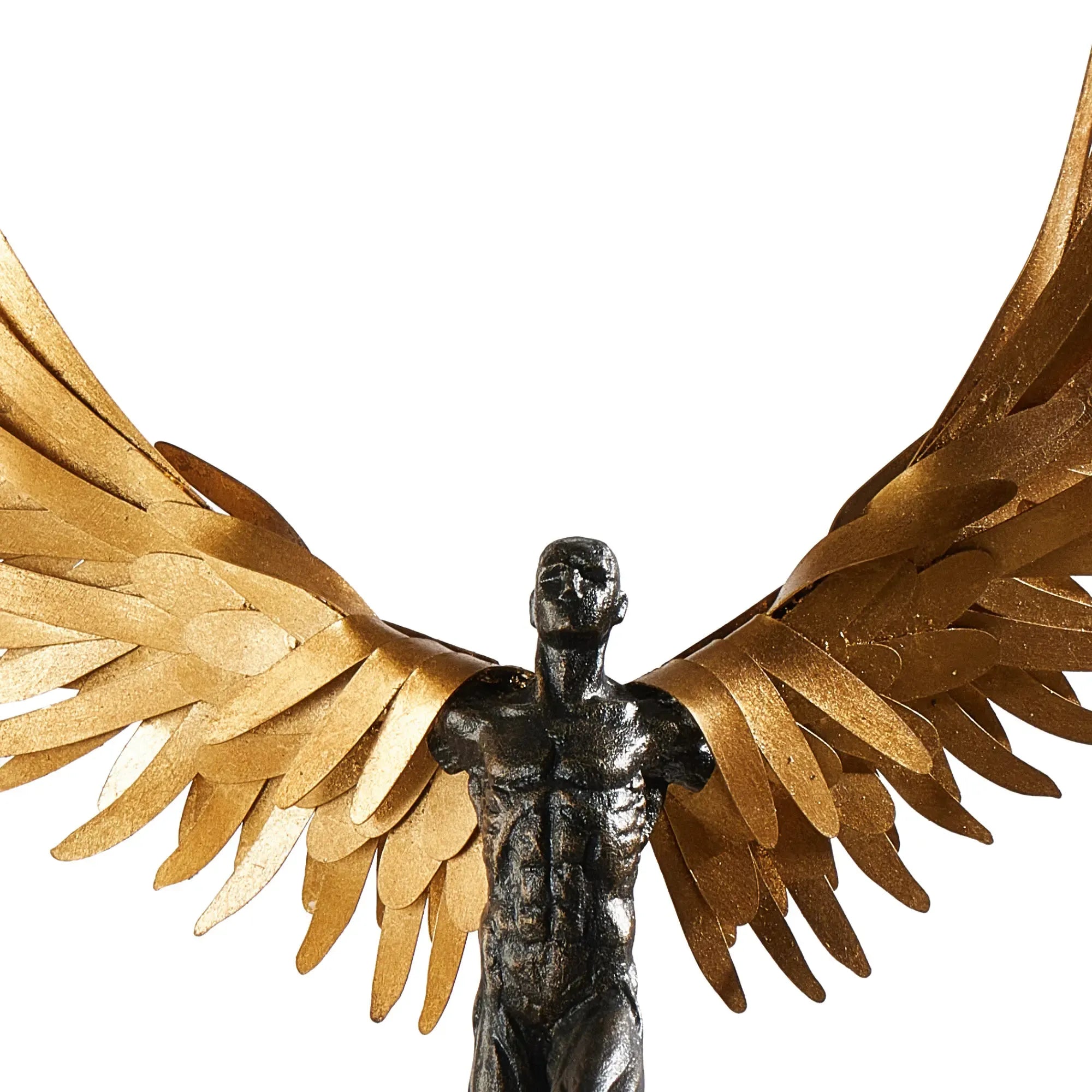 Skulptur aus Gusseisen mit Goldflügeln, dynamische Pose, goldener Sockel, modernes Kunstobjekt, luxuriöses Wohnaccessoire, Blickfang mit inspirierender Symbolik – ein ausdrucksstarkes Geschenk für Kunstliebhaber und Visionäre.