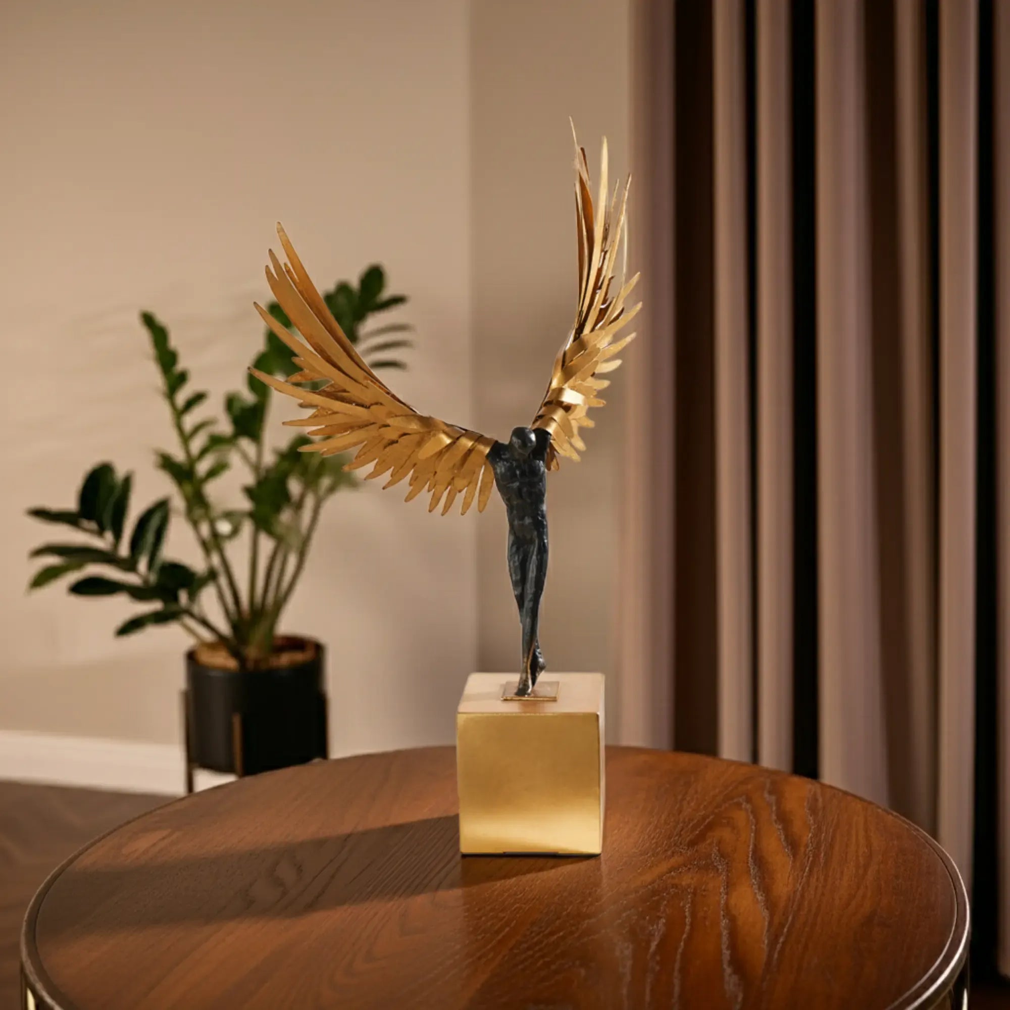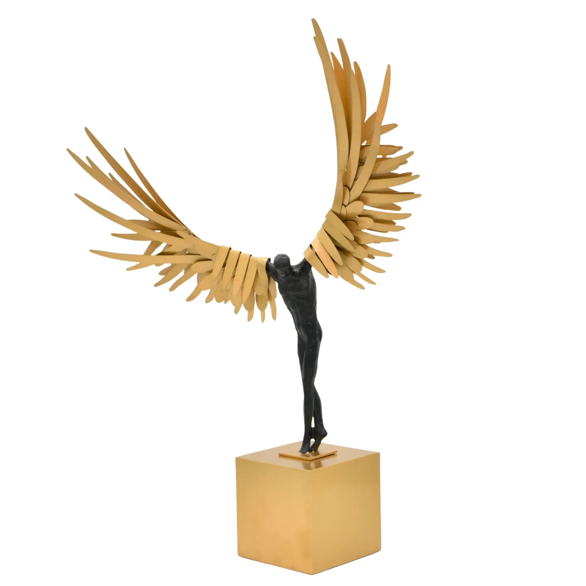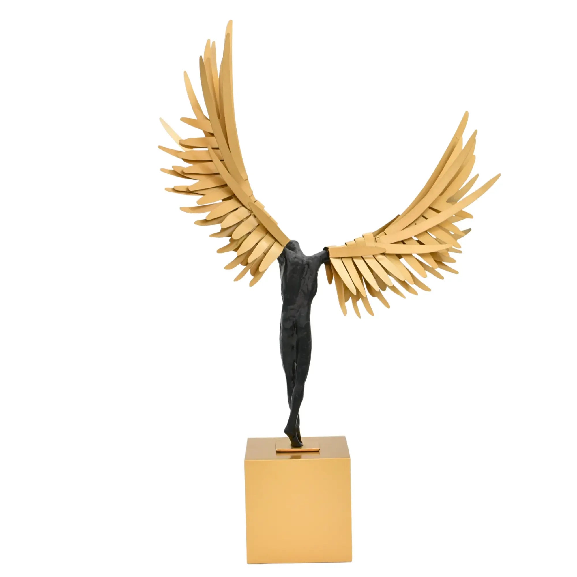 Skulptur aus Gusseisen mit Goldflügeln, dynamische Pose, goldener Sockel, modernes Kunstobjekt, luxuriöses Wohnaccessoire, Blickfang mit inspirierender Symbolik – ein ausdrucksstarkes Geschenk für Kunstliebhaber und Visionäre.
