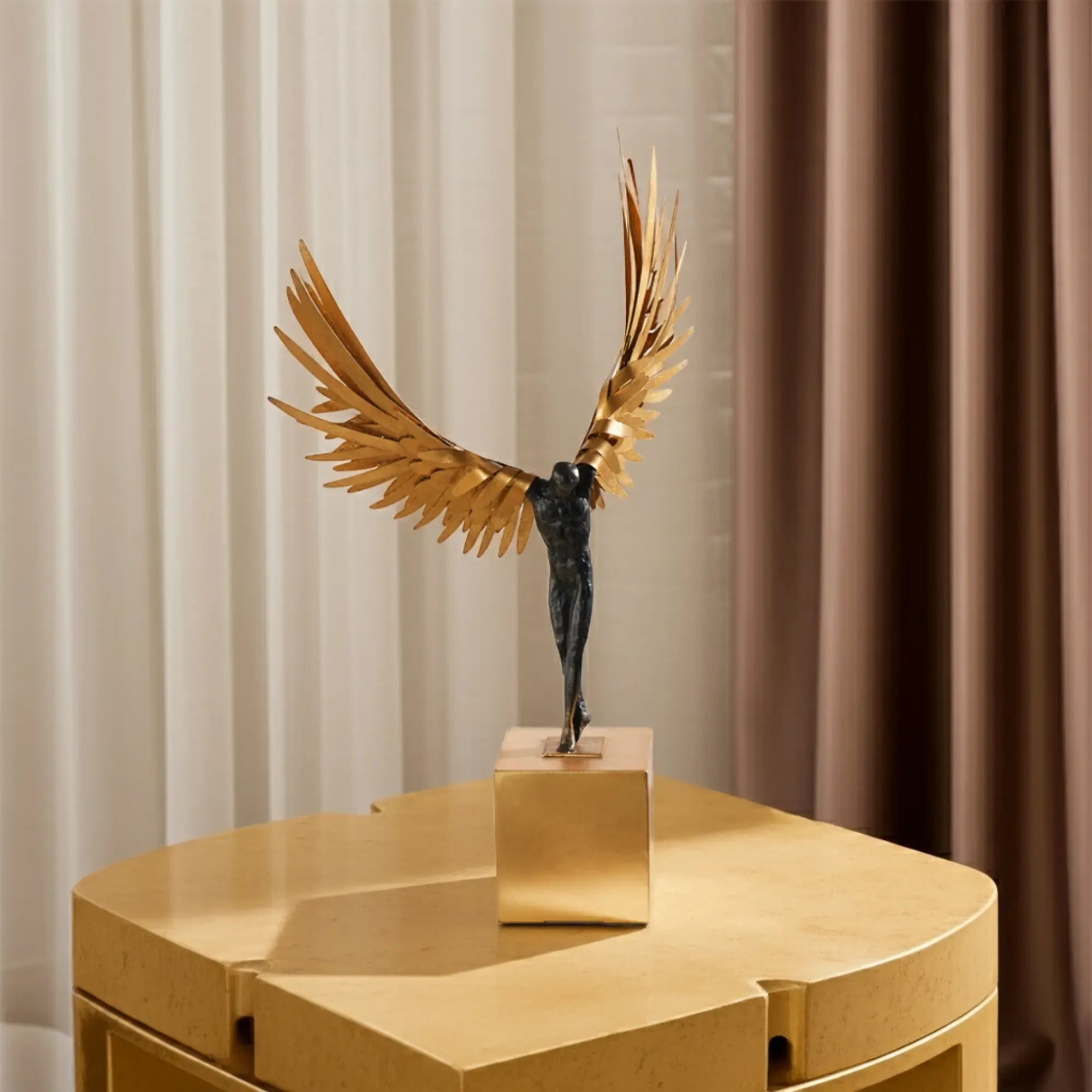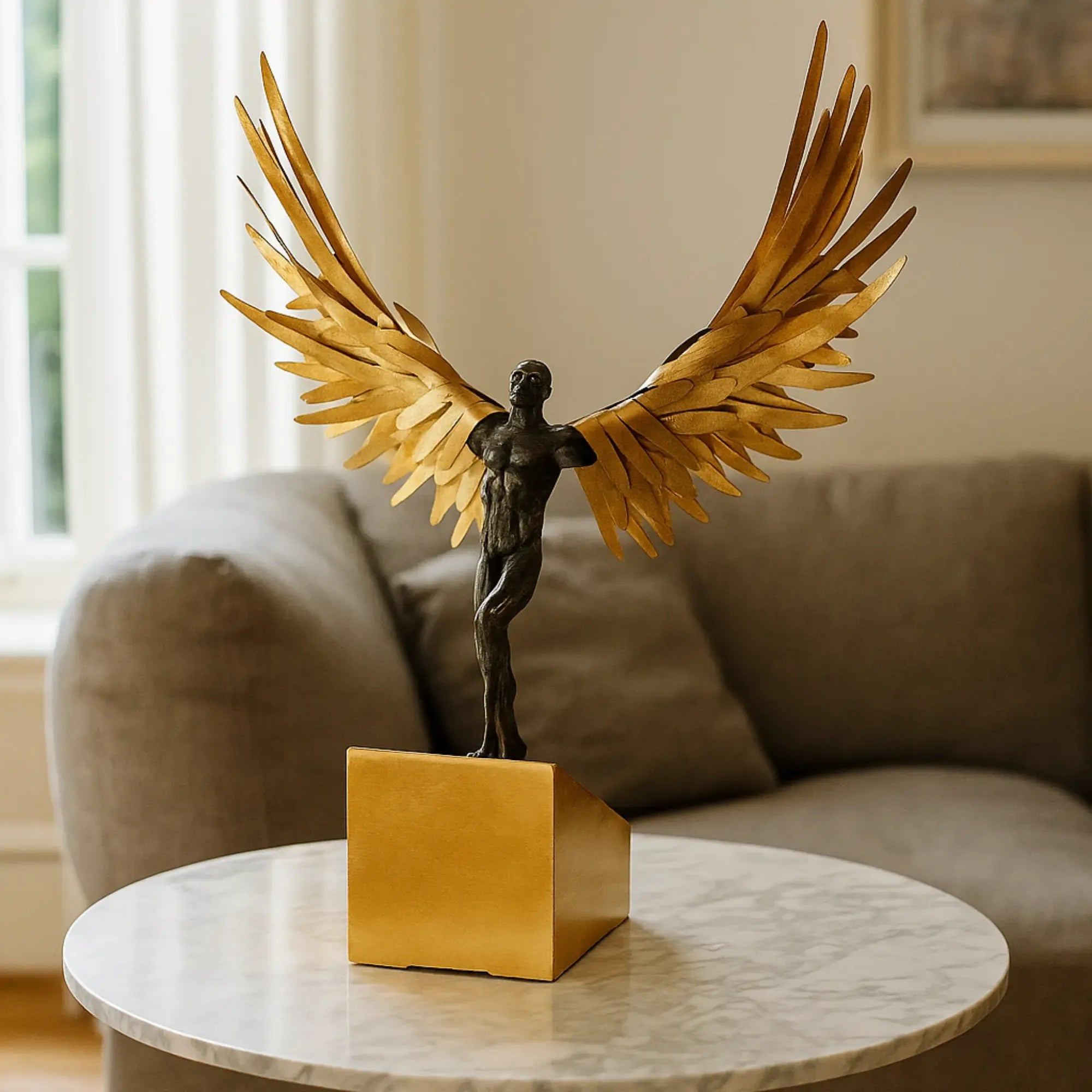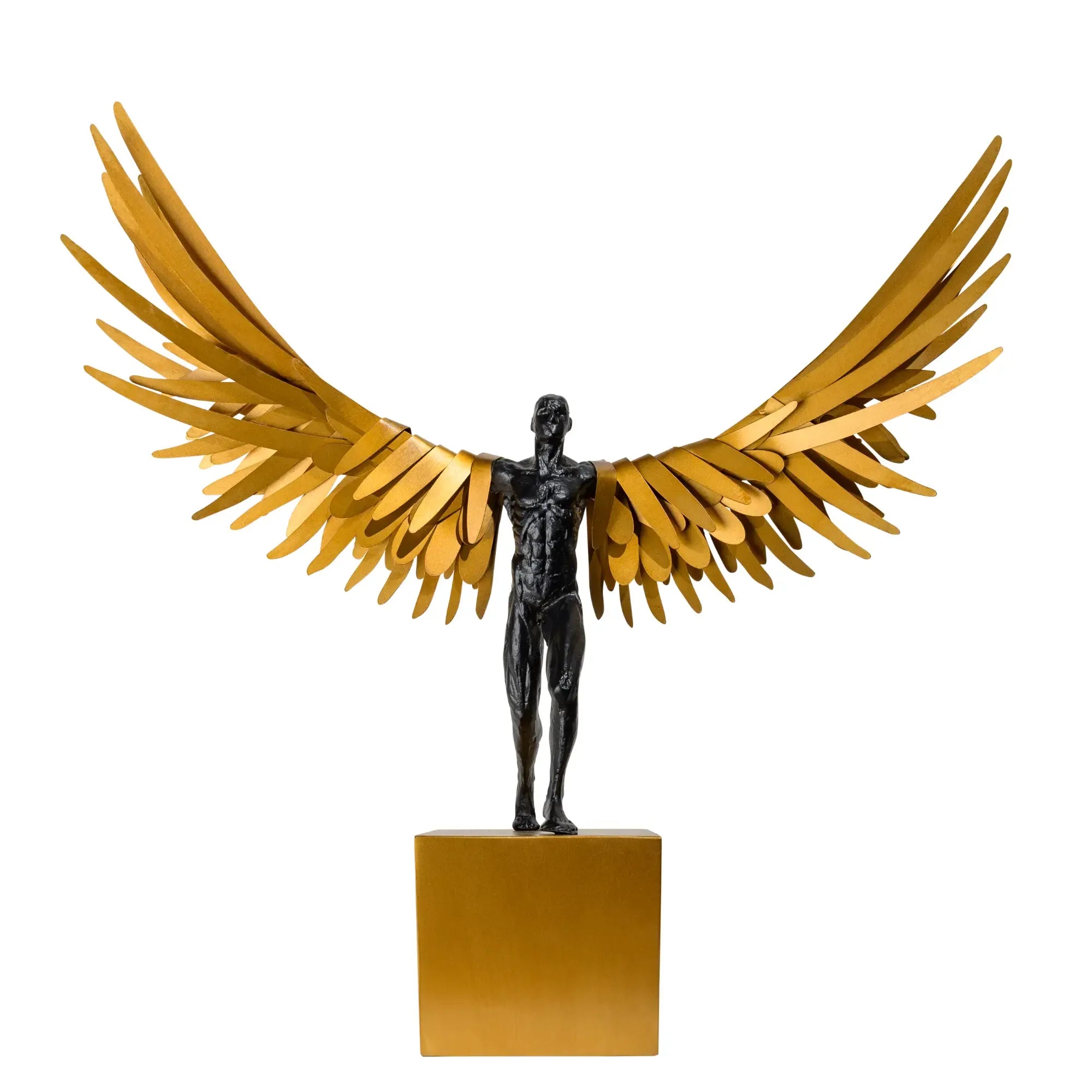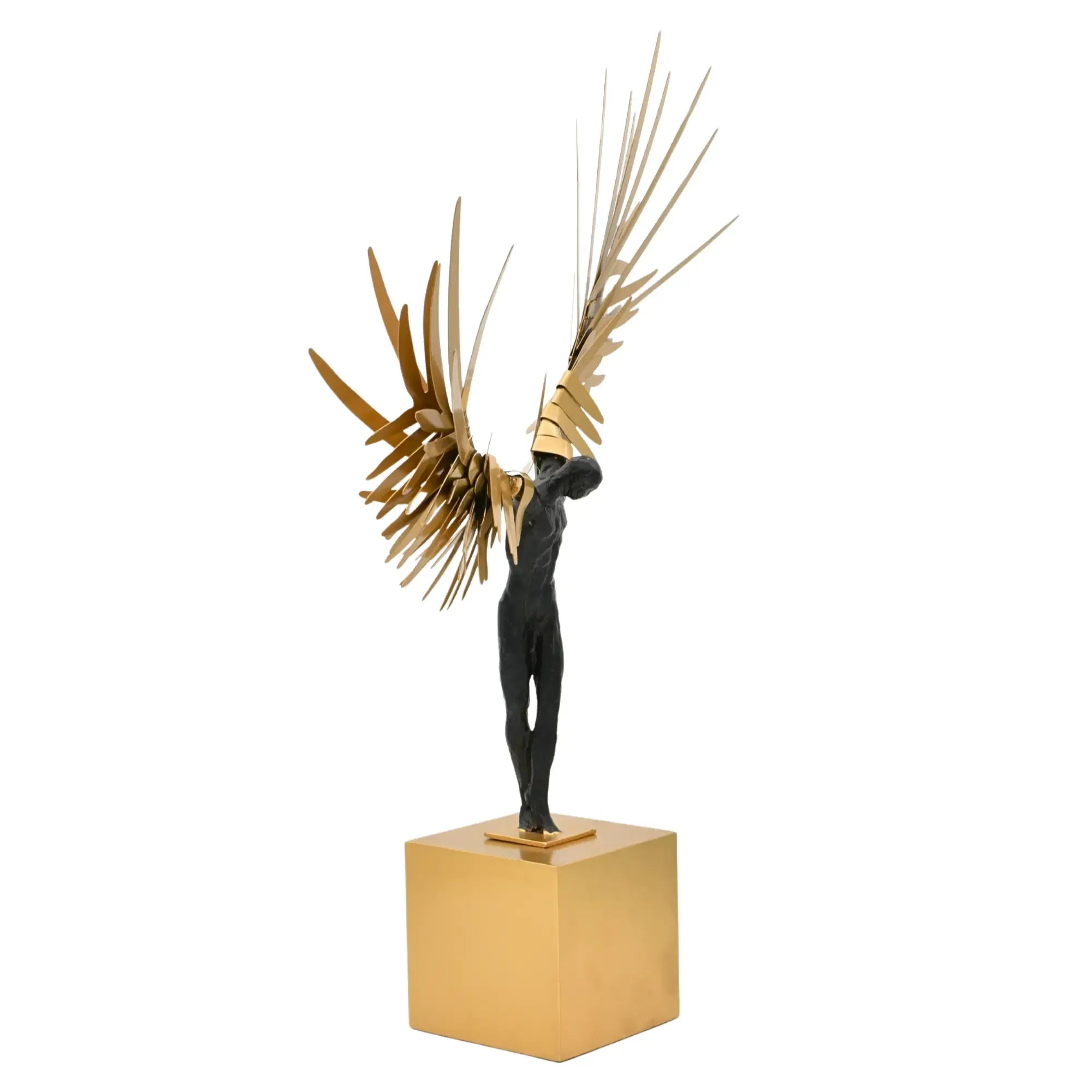 Skulptur aus Gusseisen mit Goldflügeln, dynamische Pose, goldener Sockel, modernes Kunstobjekt, luxuriöses Wohnaccessoire, Blickfang mit inspirierender Symbolik – ein ausdrucksstarkes Geschenk für Kunstliebhaber und Visionäre.