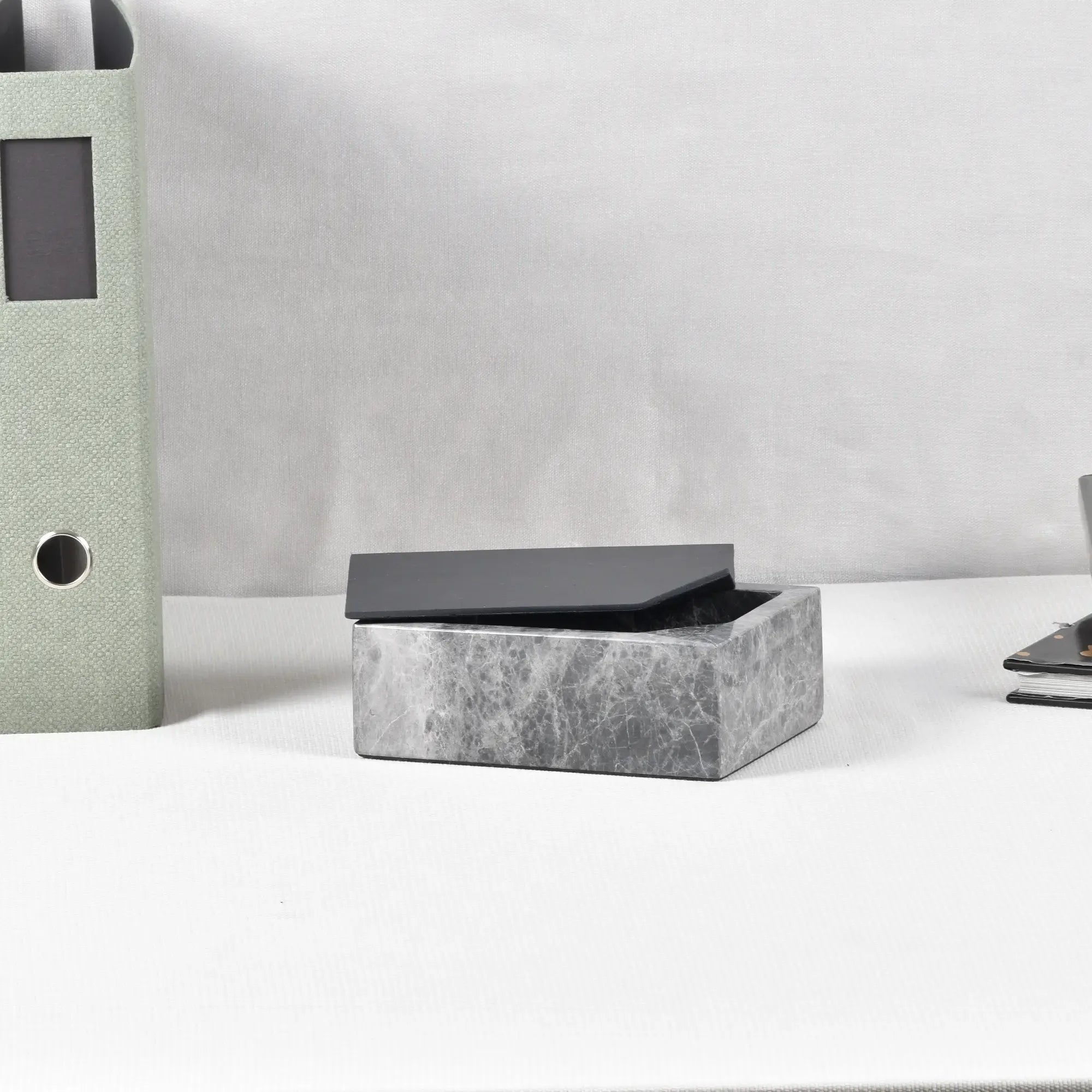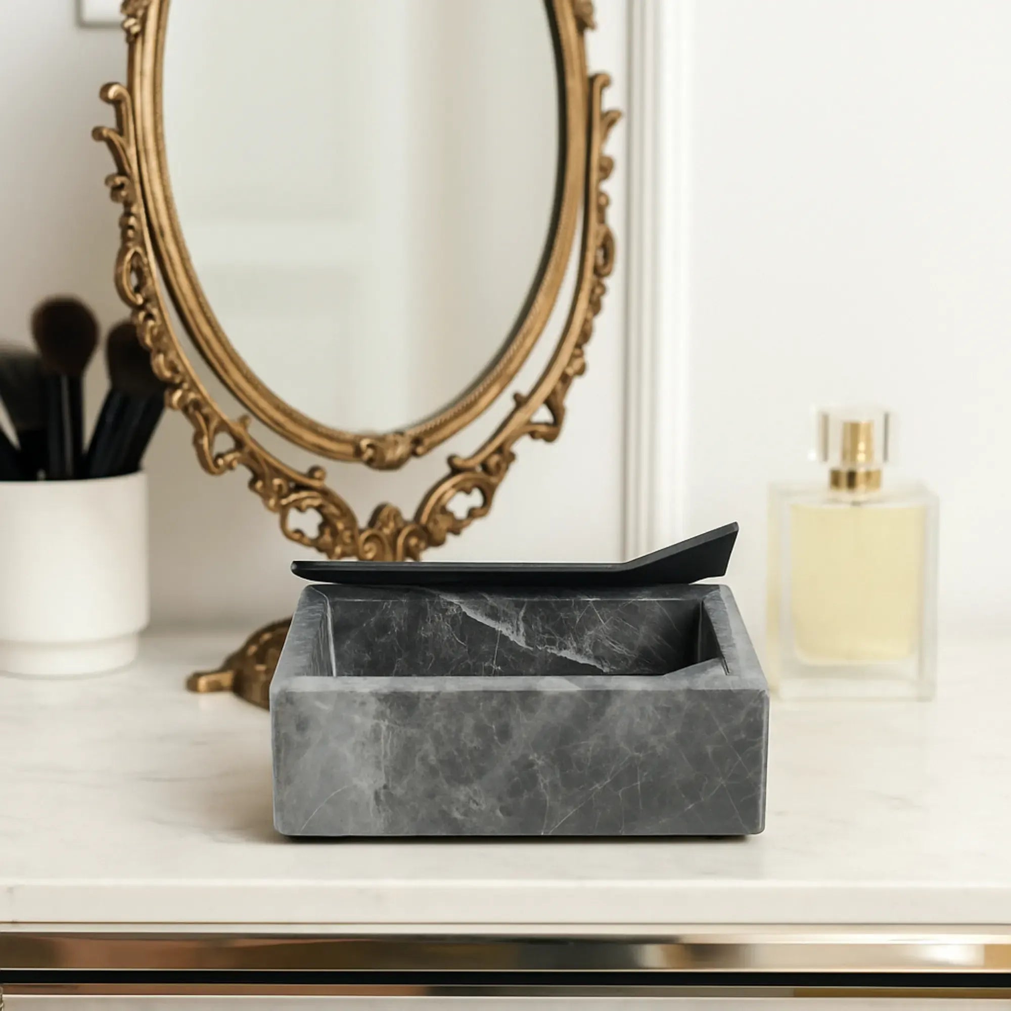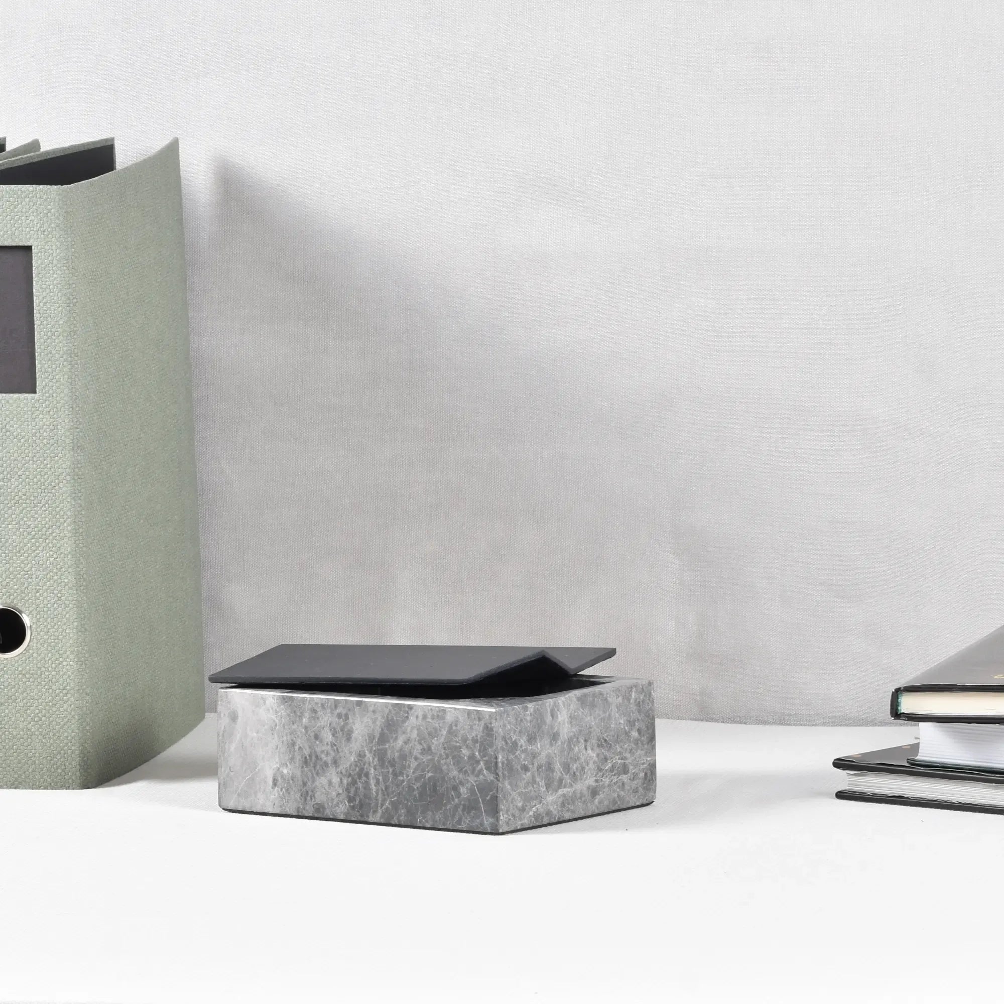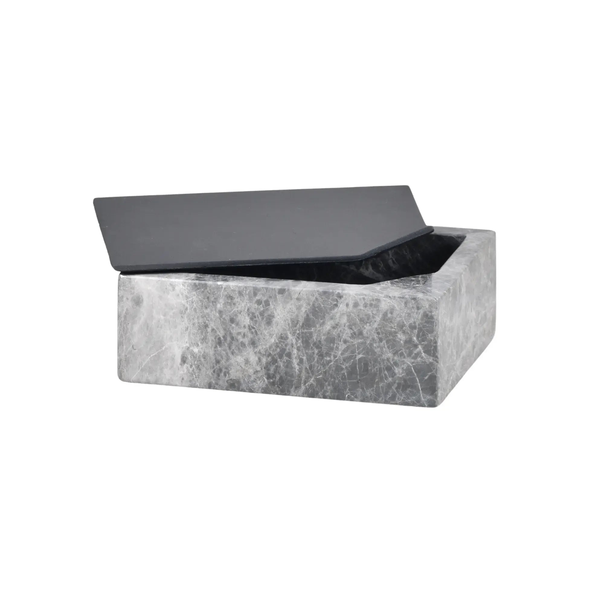Hochwertiger grauer Marmor mit weißer Maserung, mit einer präzise gearbeiteten Stahlabdeckung – edle Marmor Schmuckbox mit zeitlosem Finish.