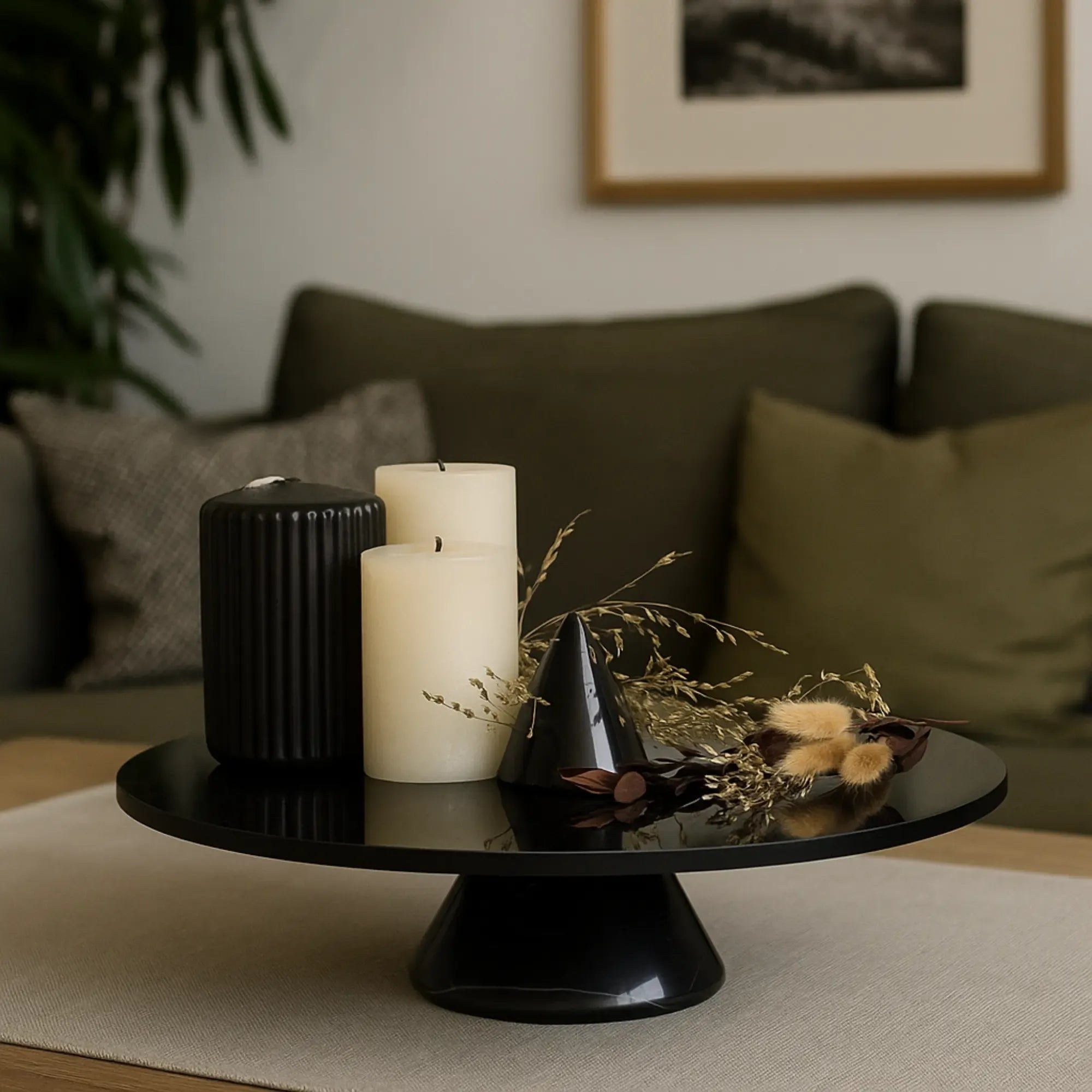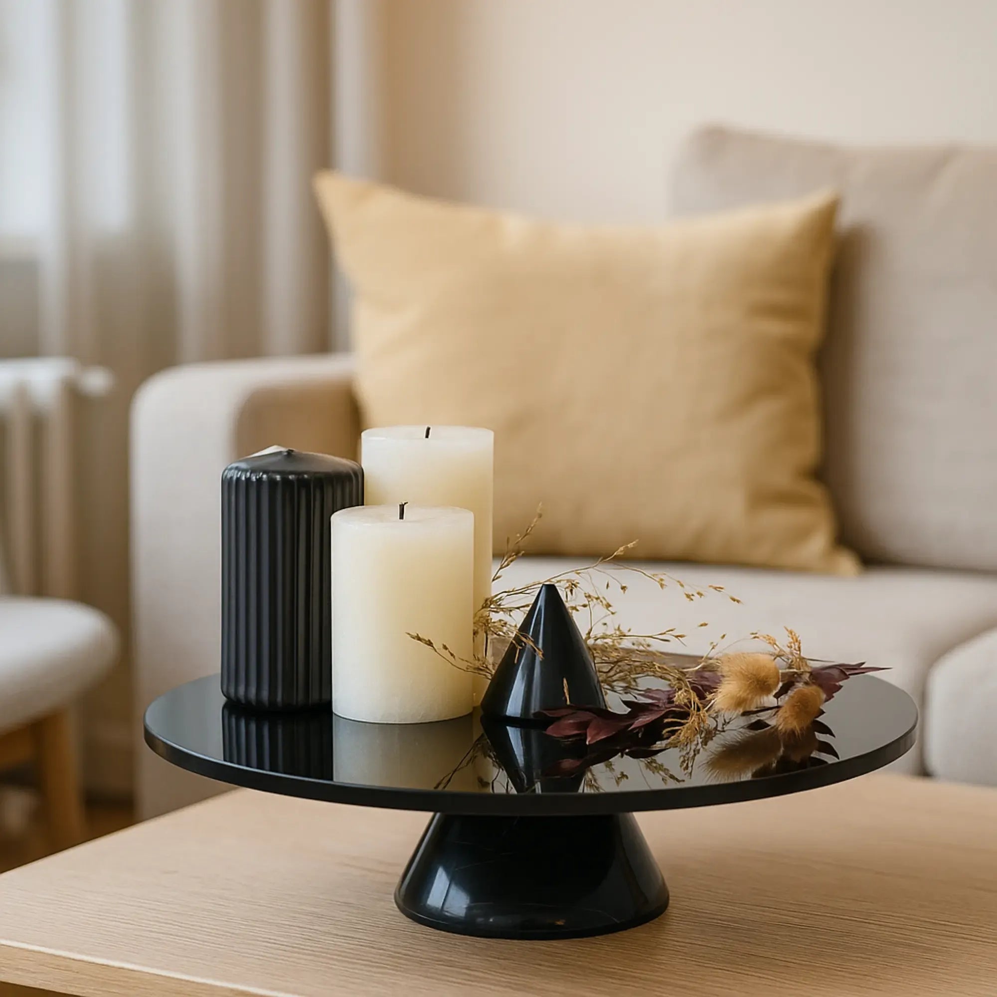 Moderne Dekoplatte auf Marmorgestell – Équilibre Noir kombiniert spiegelndes Rauchglas mit skulpturaler Eleganz. Die runde Oberfläche mit spiegeleffektähnlichem Glanz ruht auf einem konisch geformten Marmorsockel in tief glänzendem Schwarz – ein Designobjekt, das zwischen Minimalismus und Art Déco balanciert. Erhältlich in 32 cm oder 38 cm Durchmesser, eignet sich Équilibre Noir sowohl einzeln als auch im Set als moderne Servierplatte, Tortenplatte, Dekoteller oder Präsentationsfläche für Kerzen, Austern, Desserts oder Wohnaccessoires. Ob als Statement auf dem Esstisch, Highlight auf Sideboards oder Plattform für stilvolle Objektinszenierungen – dieses Designstück auf Marmorfuß überzeugt durch Luxus, Stabilität und visuelle Raffinesse. Ein ideales Geschenk für Mütter, Frauen oder zur Einweihung – denn stilvolle Platten werden bei allen Festen immer gebraucht, sei es zum Dekorieren, Servieren oder stilvollen Präsentieren. Ein edles Accessoire für Wohnzimmer, Küchen, Empfangsbereiche, Hotels oder Designrestaurants – perfekt für Designliebhaber und ästhetisch anspruchsvolle Räume.
