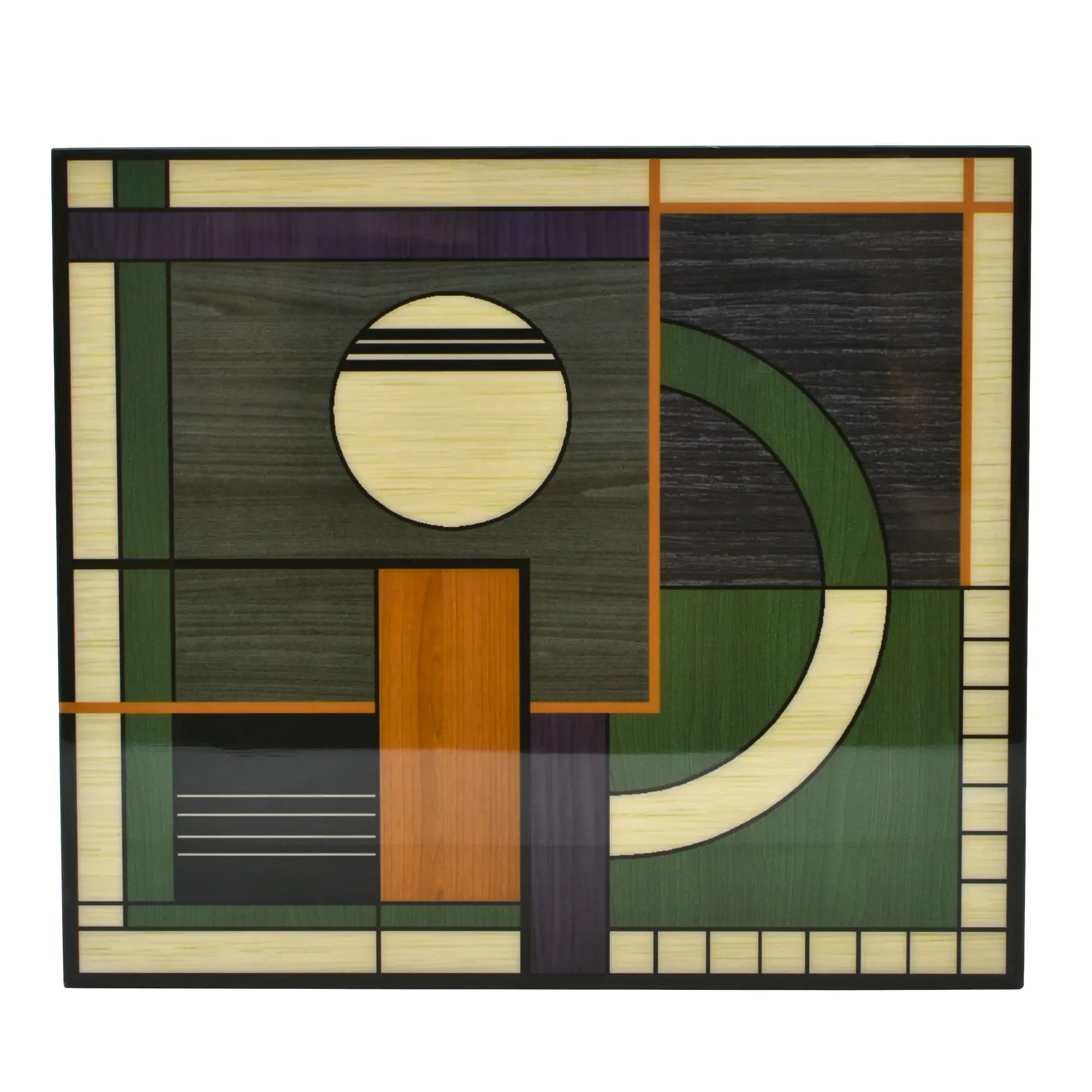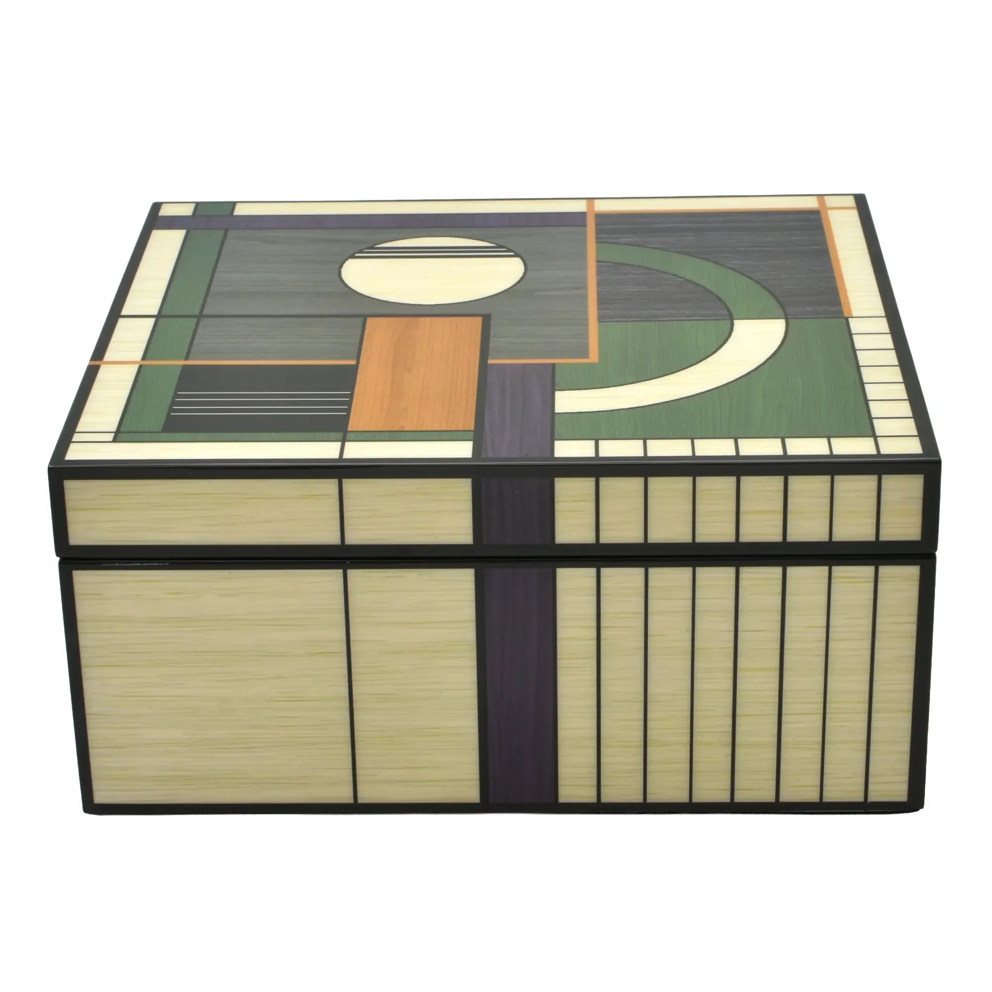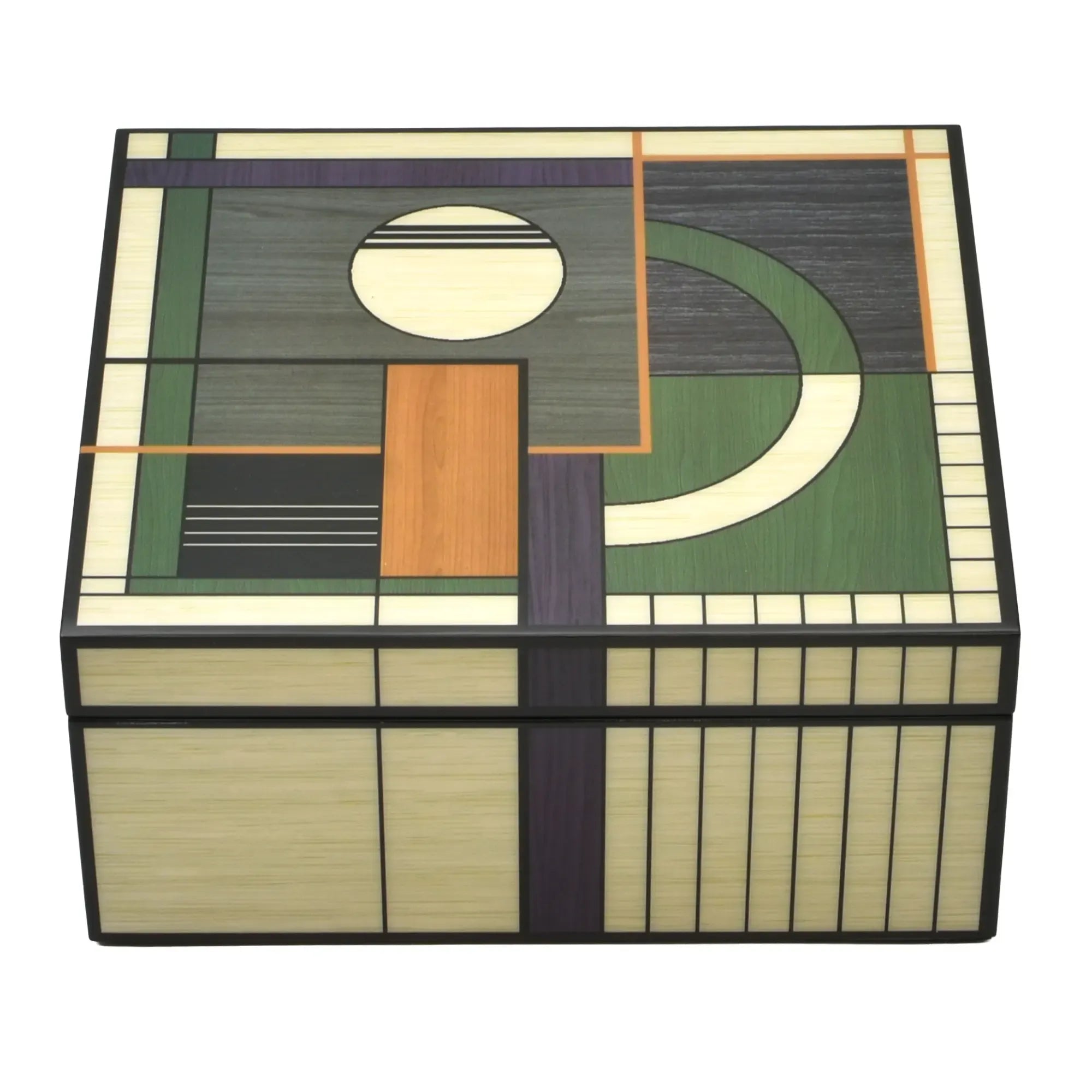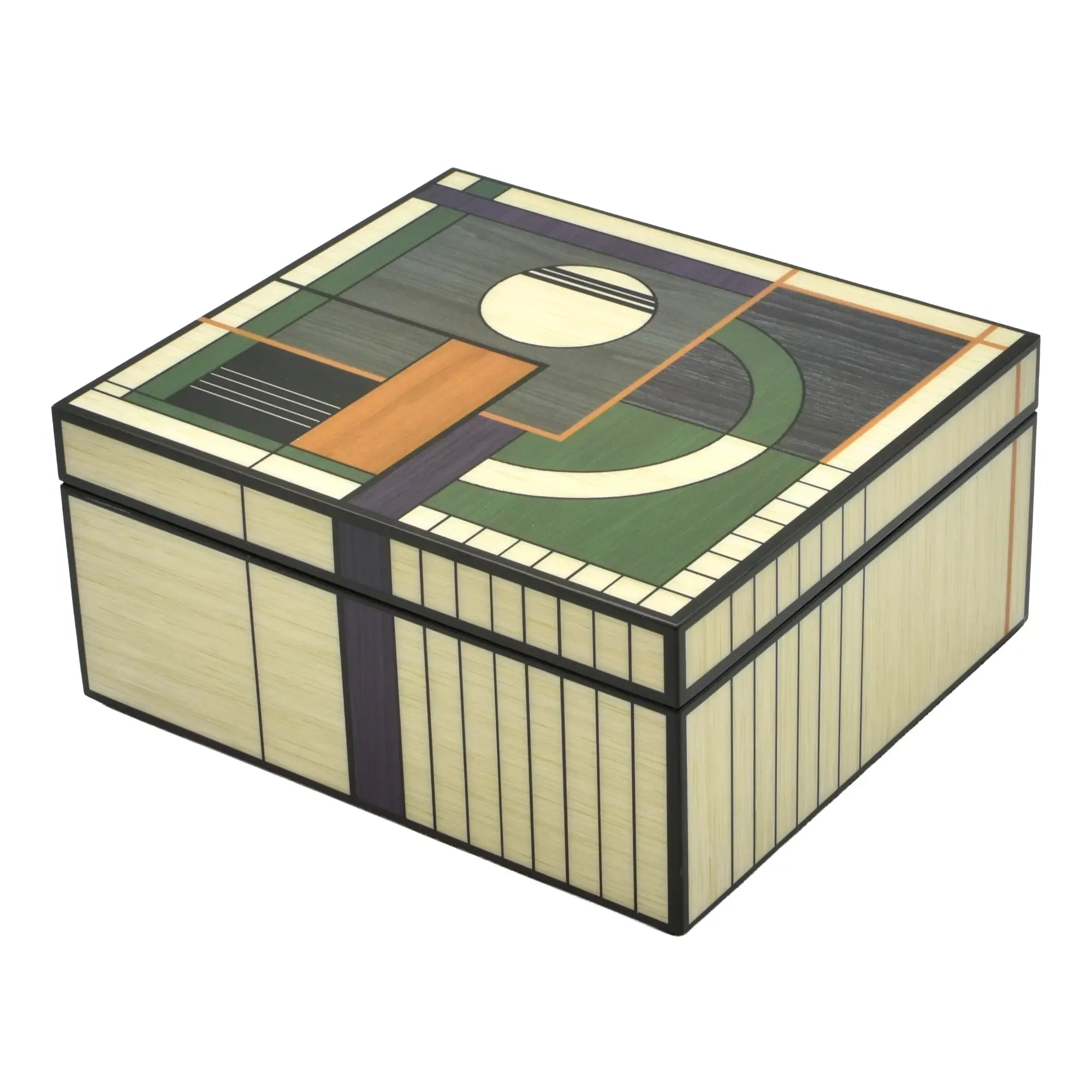 Diese Schmuckdose verbindet Architektur und Handwerk. Der Korpus zeigt eine fein gearbeitete Intarsienoberfläche Abbildung aus unterschiedlich getönten Holzfurnieren – von warmen Honig- und Nusstönen bis zu kühlen Grau- und Moosnuancen. Die geometrische Komposition aus Kreis, Segmentbogen und linearen Feldern wirkt wie ein modernes Relief und verleiht dem Designobjekt skulpturale Präsenz. Sauber gefasste Kanten, seidenmatt versiegelt, betonen die präzisen Fugen. Eine klare, reduzierte Form, die den grafischen Rhythmus in den Vordergrund stellt – Schmuckdose, Objekt, Kunststück in einem.