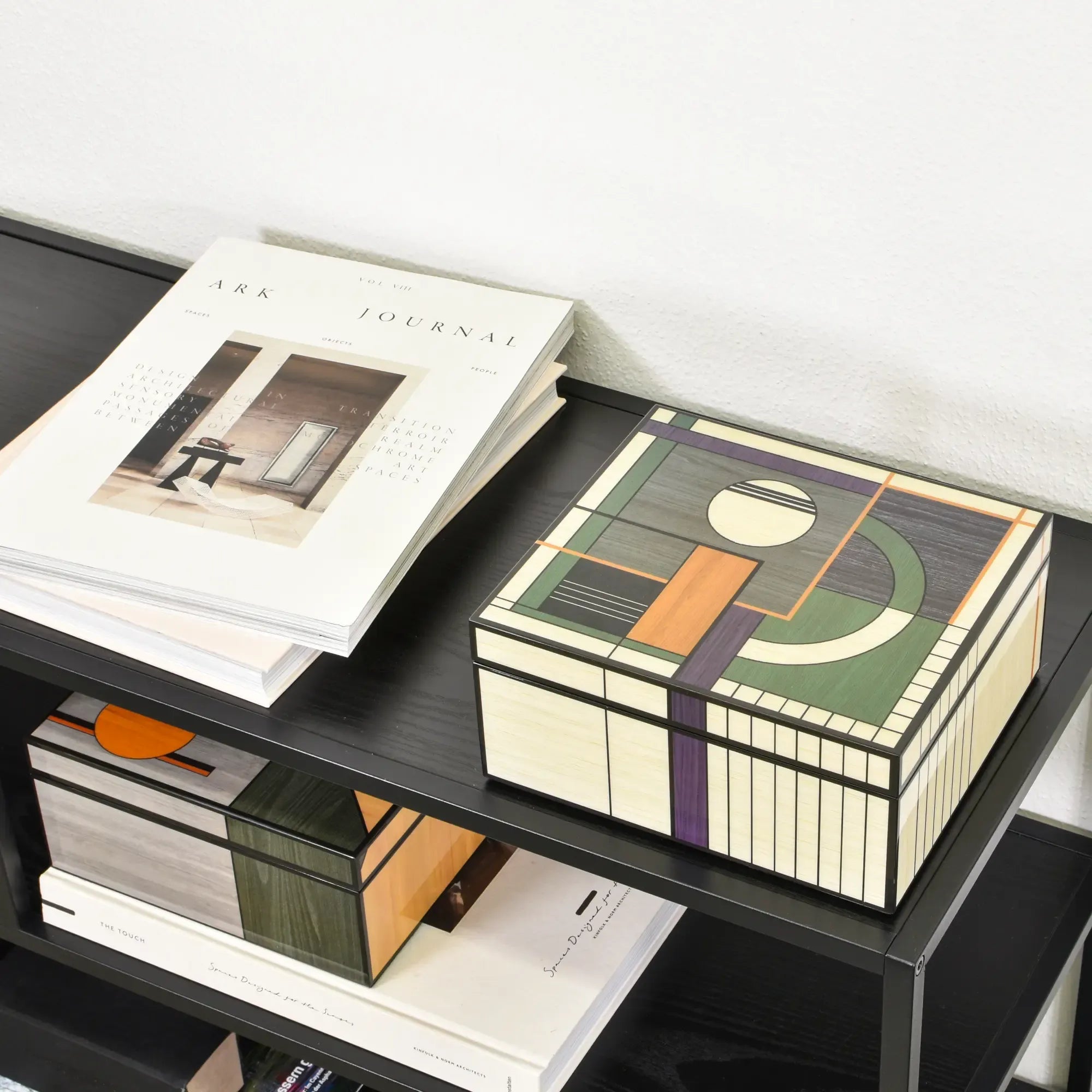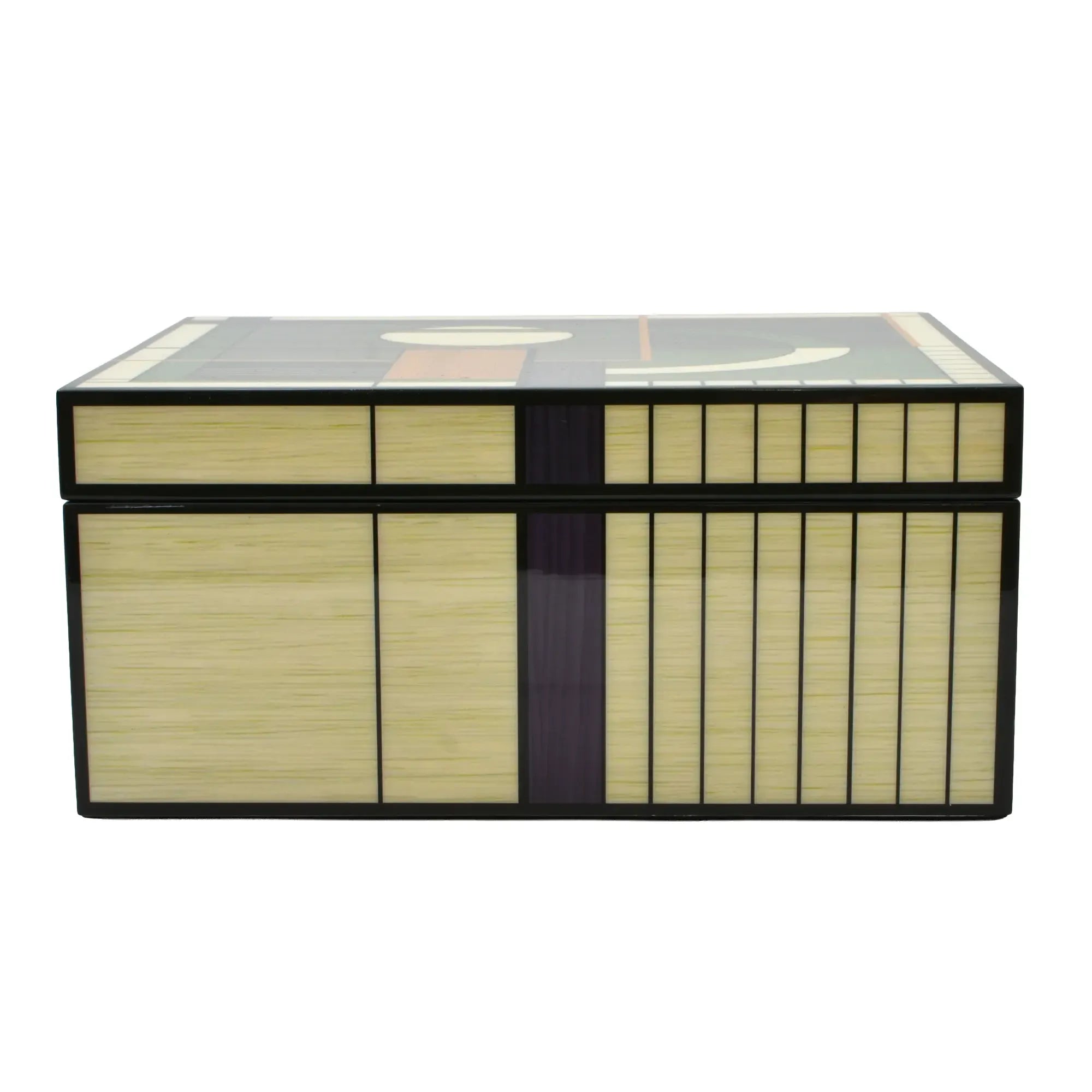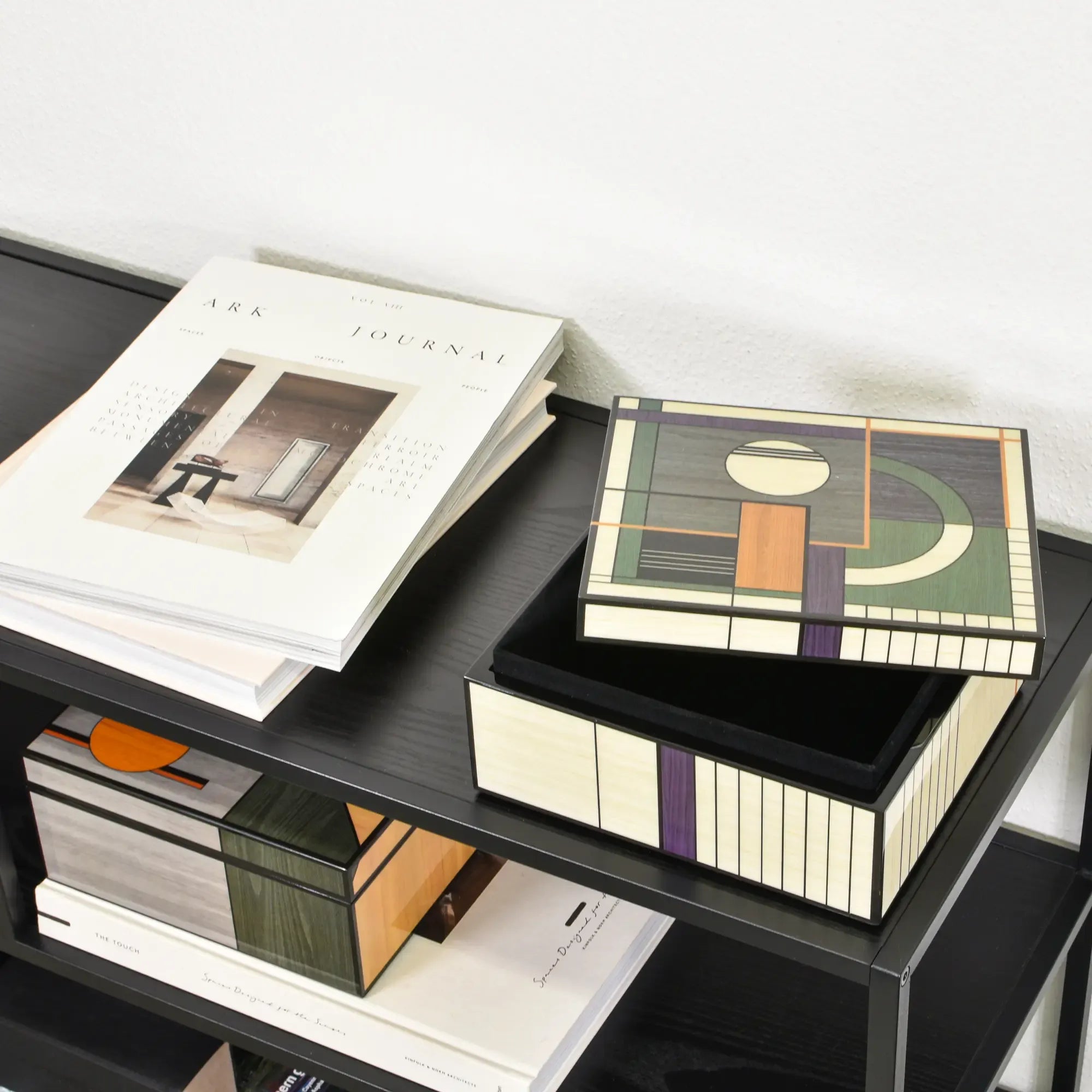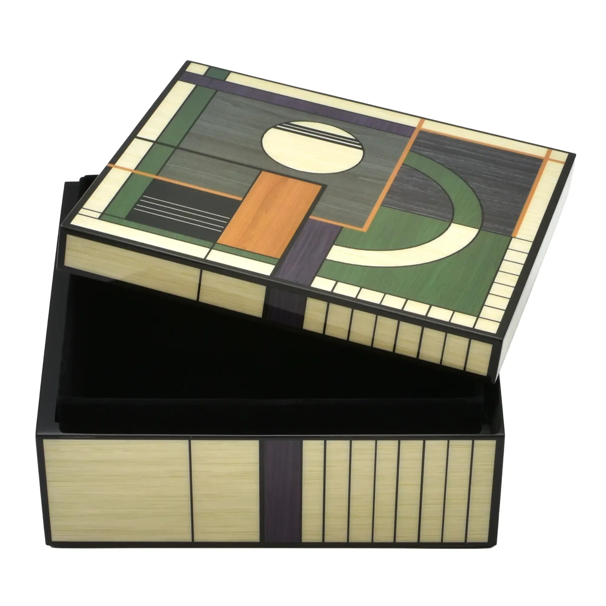 Diese Schmuckdose verbindet Architektur und Handwerk. Der Korpus zeigt eine fein gearbeitete Intarsienoberfläche Abbildung aus unterschiedlich getönten Holzfurnieren – von warmen Honig- und Nusstönen bis zu kühlen Grau- und Moosnuancen. Die geometrische Komposition aus Kreis, Segmentbogen und linearen Feldern wirkt wie ein modernes Relief und verleiht dem Designobjekt skulpturale Präsenz. Sauber gefasste Kanten, seidenmatt versiegelt, betonen die präzisen Fugen. Eine klare, reduzierte Form, die den grafischen Rhythmus in den Vordergrund stellt – Schmuckdose, Objekt, Kunststück in einem.