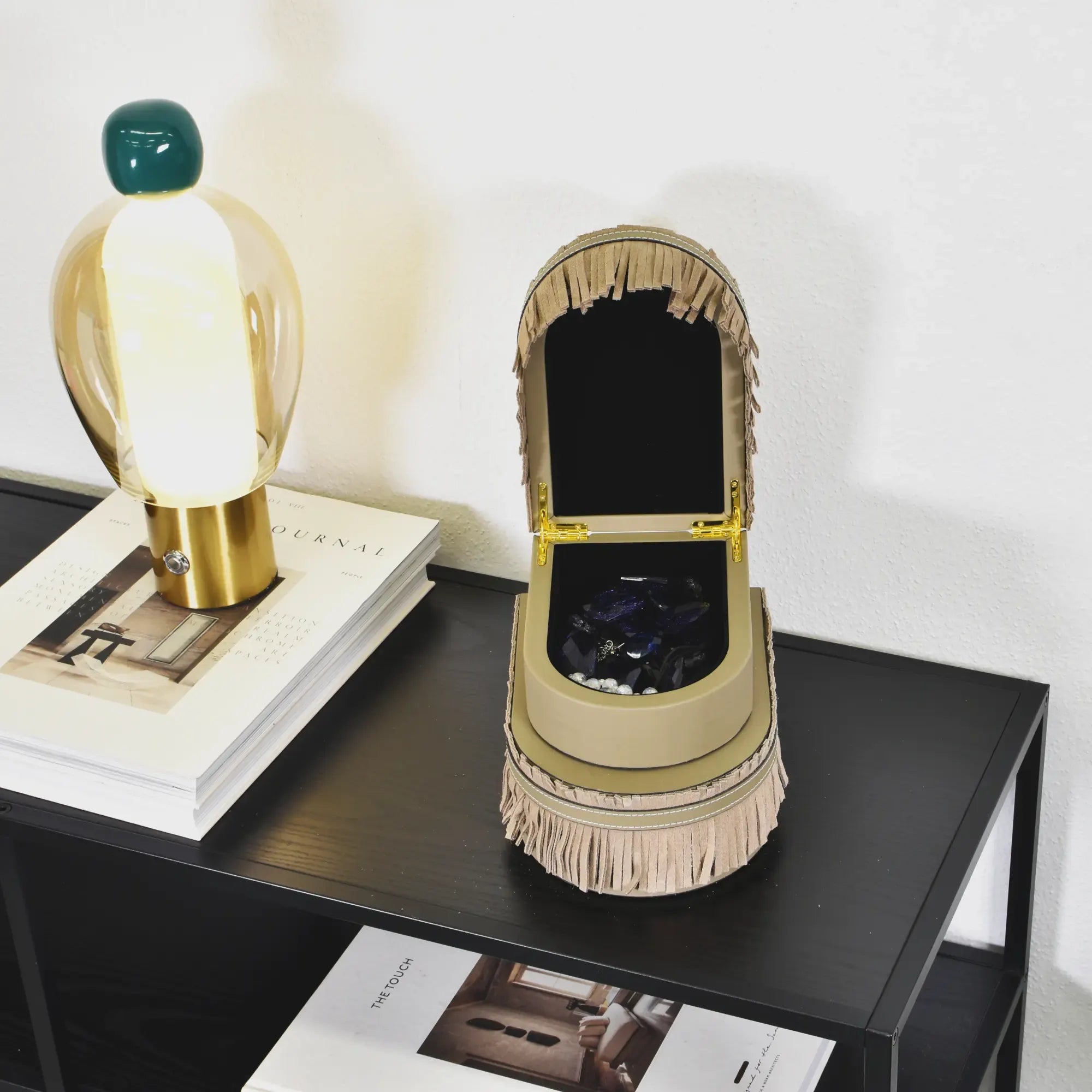 Diese Aufbewahrungsbox interpretiert die Schmuckschatulle als reduziertes Kunstobjekt. Feines, Olivgrünes Leder umhüllt den Korpus; umlaufende Velours‑Fransen setzen taktile Bewegung. Präzise gesetzte Ziersteppungen akzentuieren die Kontur, der weich gerundete Deckel schließt sauber. Die organisch‑ovale Form wirkt zugleich weich und konstruktiv, der plan geschnittene Boden sorgt für Stabilität und Stapelbarkeit. Als Solitär oder im harmonisch abgestimmten Duo erhältlich, verbindet diese Lederbox Ordnung, Haptik und handwerkliche Disziplin zu klarer, zeitloser Dekoration.