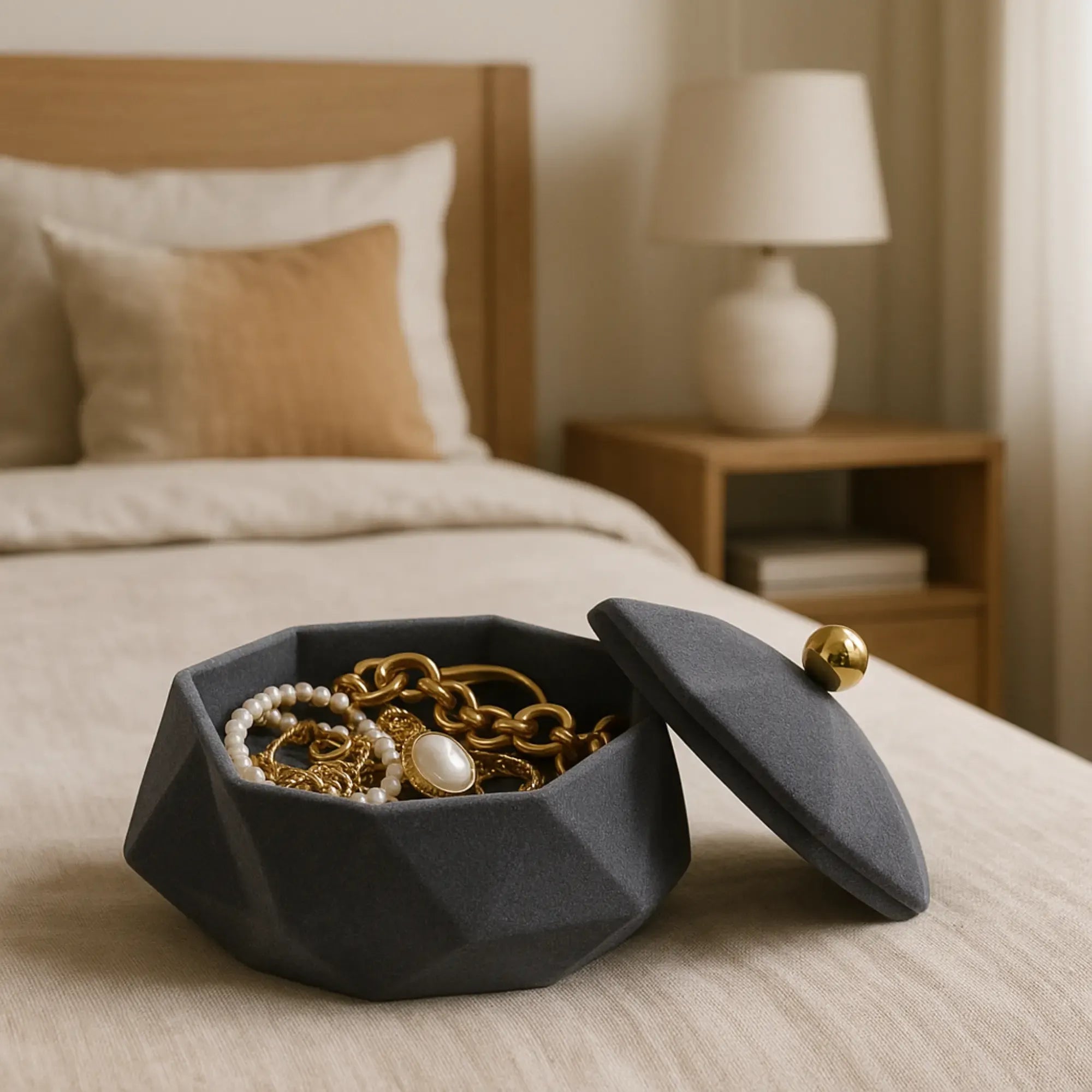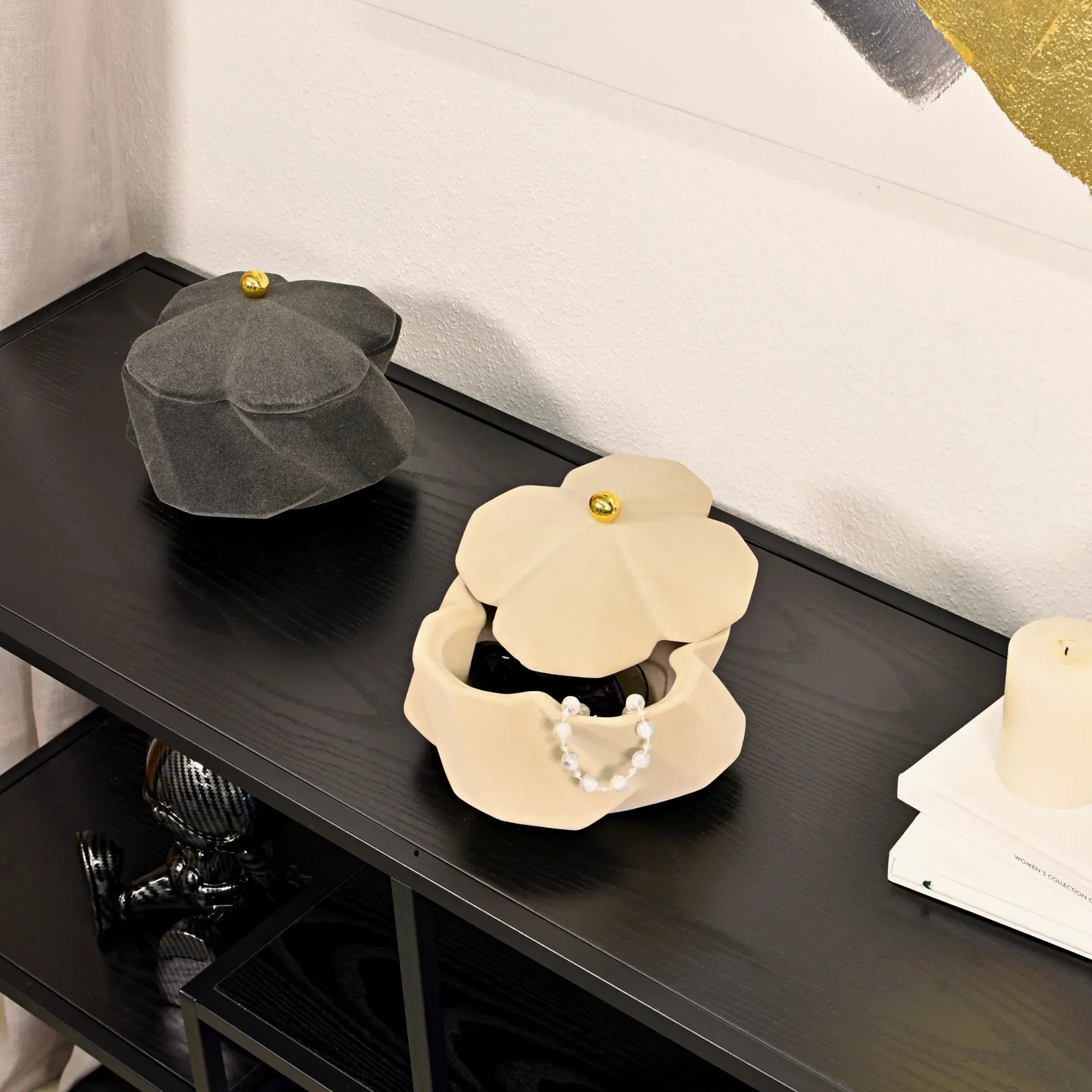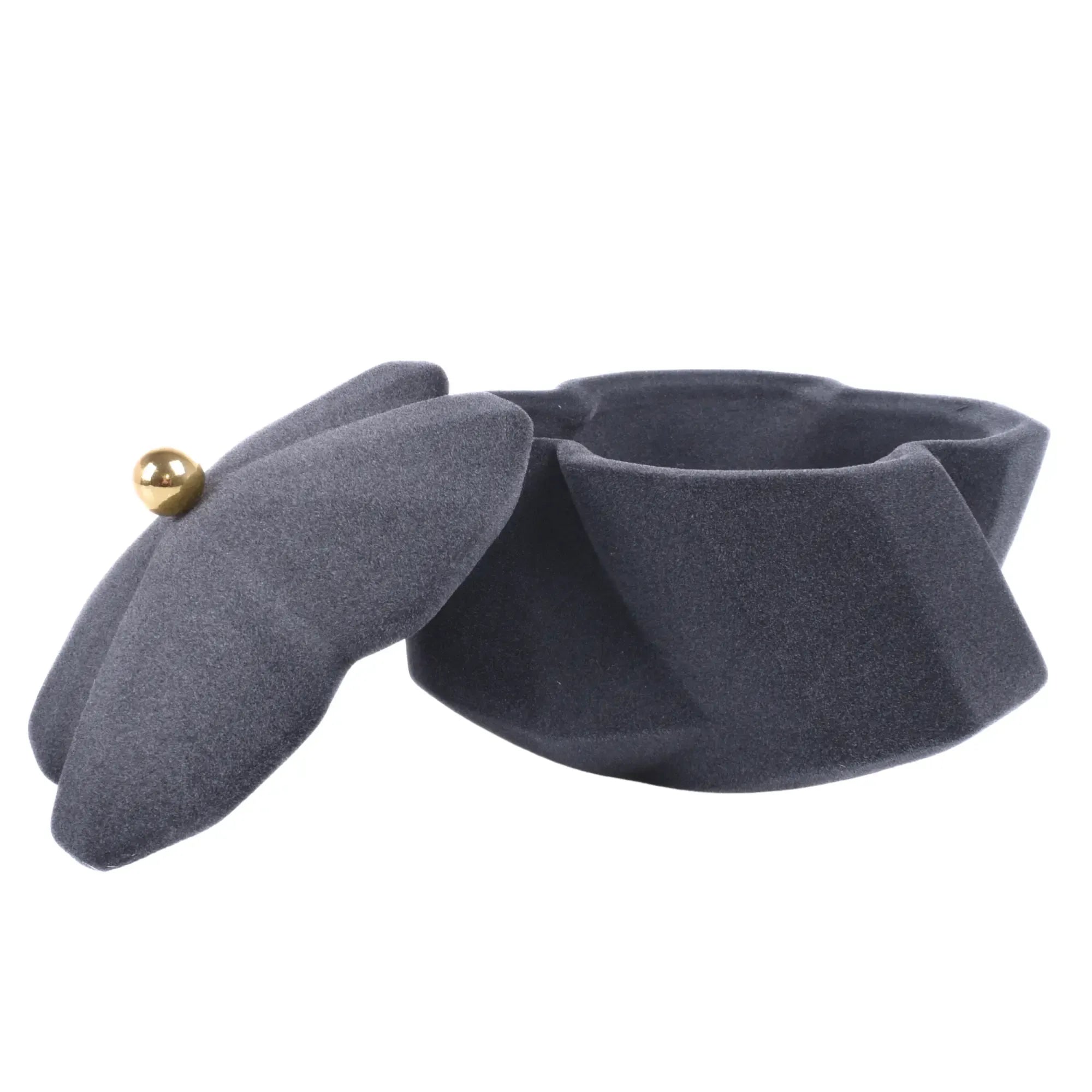 Die Velvet Bloom Schmuckdose kombiniert stilvolles Blütendesign mit einer edlen Samtoberfläche in Dunkelgrau oder Hellgrau, die luxuriöse Haptik und visuelle Tiefe vermittelt. Als Samt-Schale in Blumenform ist sie nicht nur ein elegantes Dekoobjekt, sondern auch eine funktionale Aufbewahrung für Schmuck, Schlüssel oder kleine Schätze. Der goldfarbene Knauf auf dem Deckel setzt einen glänzenden Akzent und unterstreicht den hochwertigen Charakter dieser Dekoschale mit Deckel. Ob als Samt-Schmuckbox auf dem Nachttisch, als Dekodose auf dem Sideboard, oder als stilvolles Geschenk für Einweihung oder Geburtstag – die Velvet Bloom Dose passt perfekt zu modernen wie klassischen Interieurs. Dank ihrer kompakten Form, dem weichen Finish und dem charmanten Design ist sie ein echtes Highlight für Wohnräume, Schlafzimmer oder Homeoffice. Ein stilvolles Wohnaccessoire und Must-have für alle, die Samt-Deko, Schmuckaufbewahrung und blumige Designs lieben.