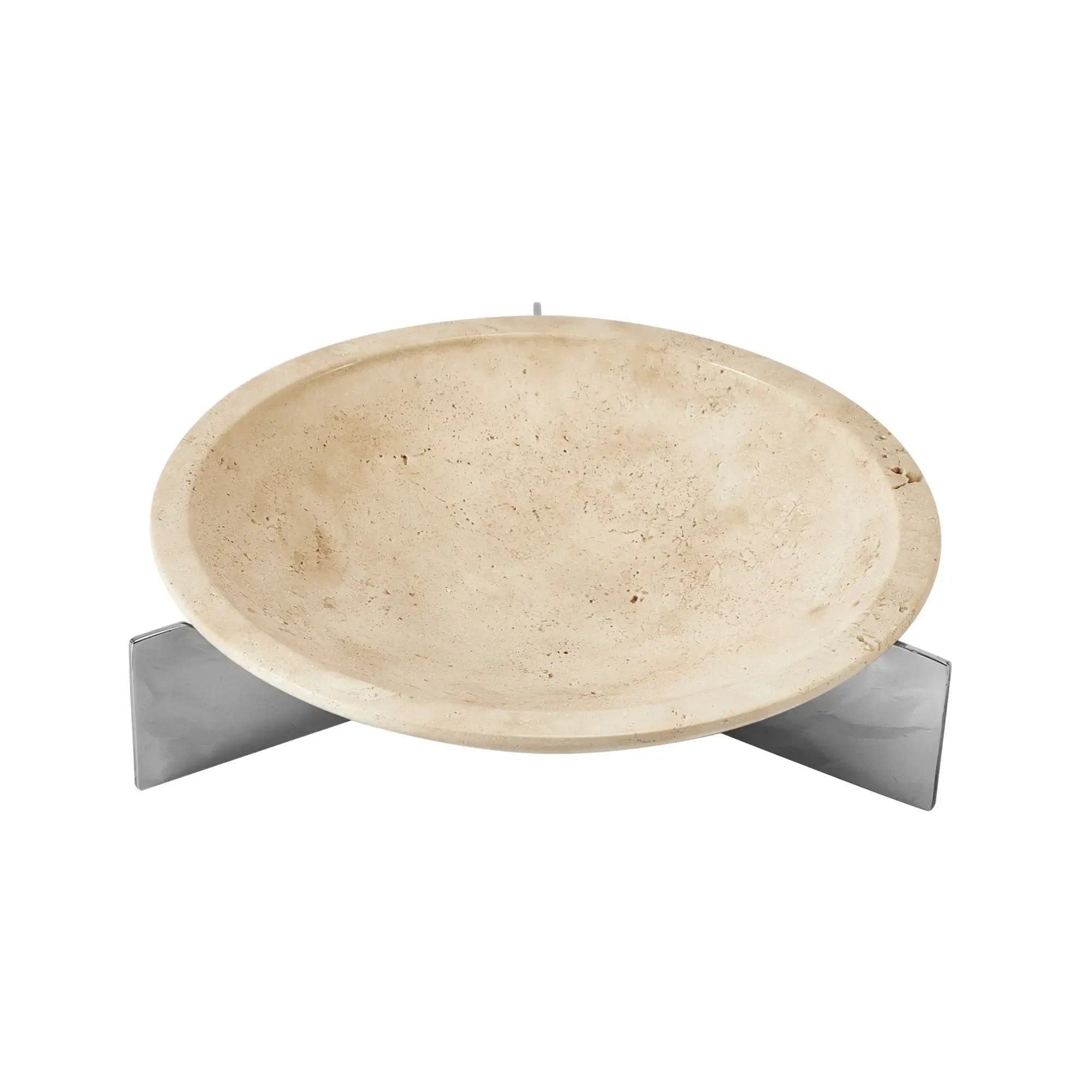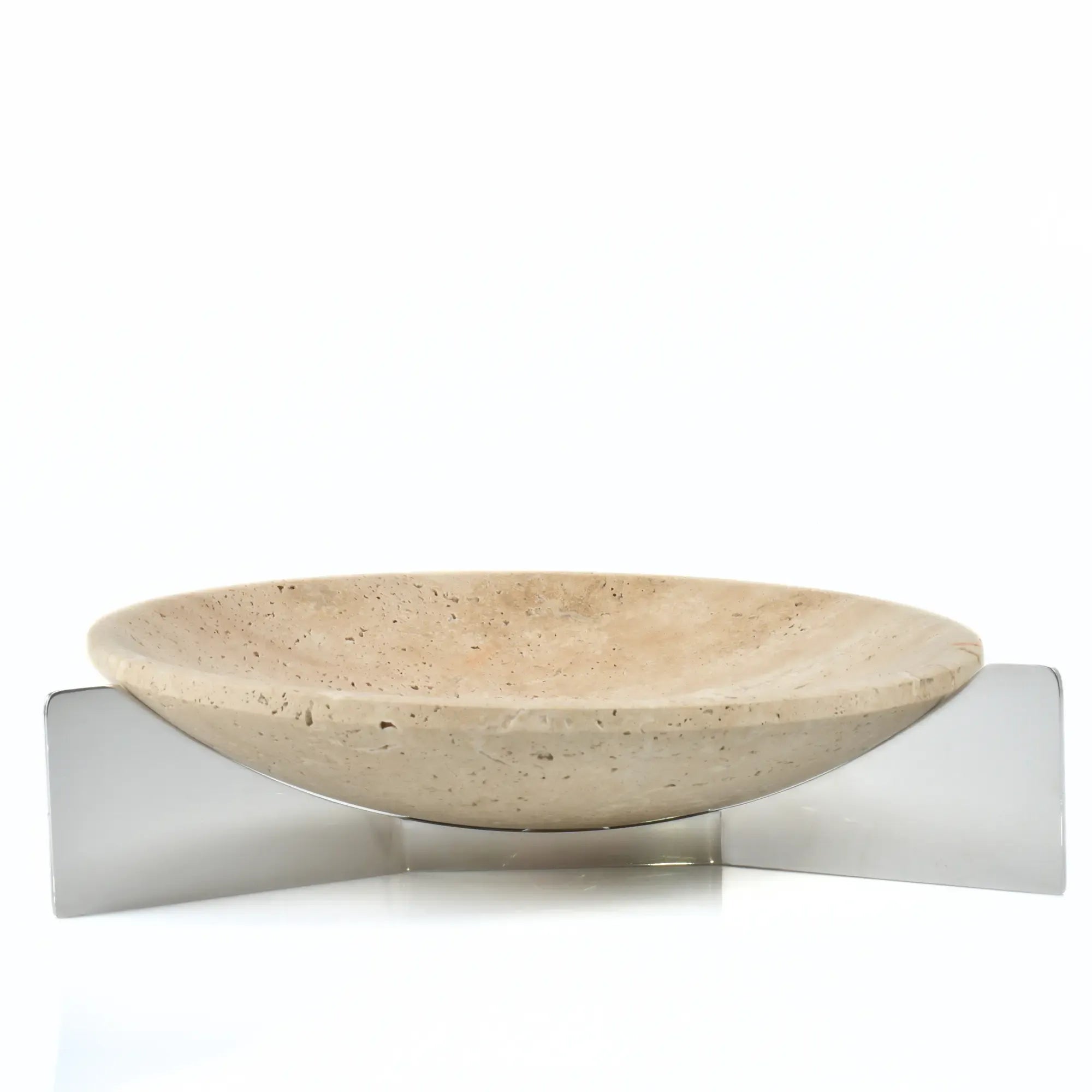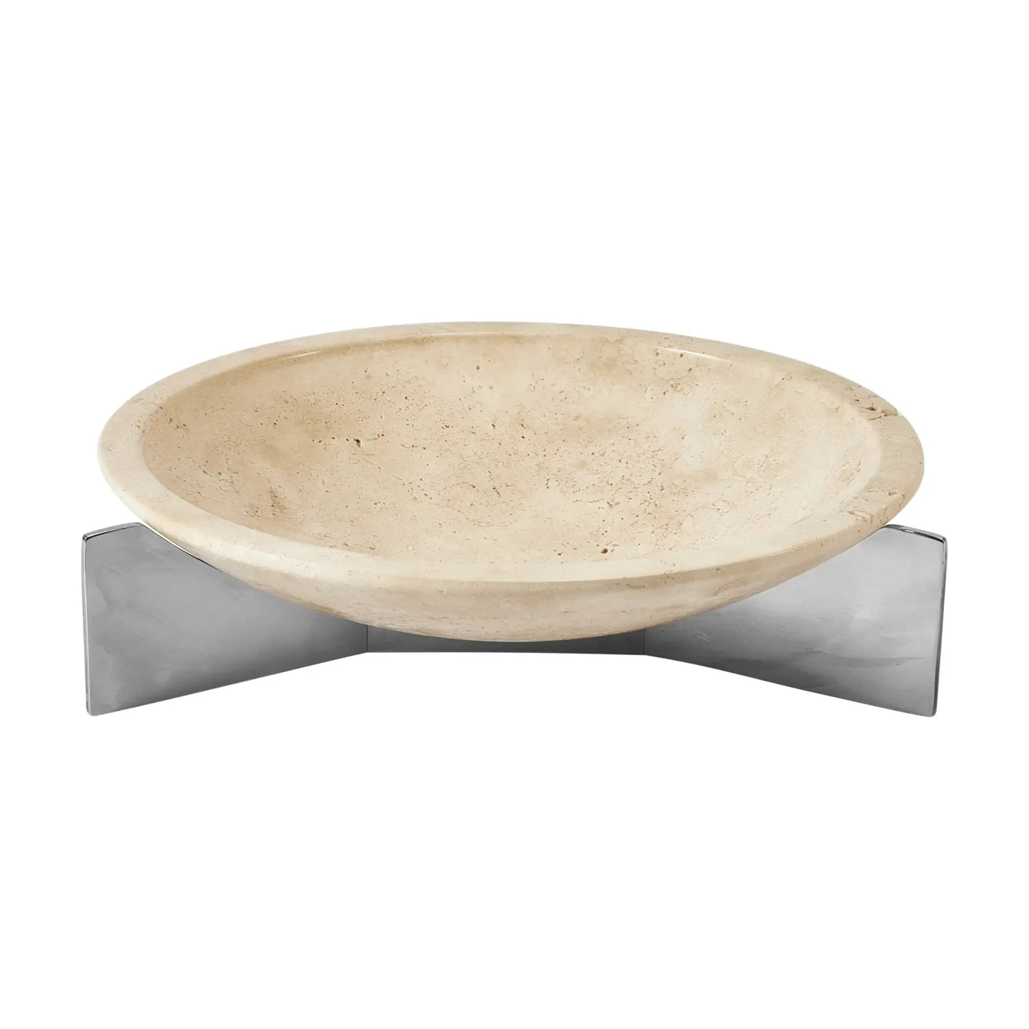 Handgefertigte Schale aus sandfarbenem Travertin mit feiner Naturstruktur, kombiniert mit einer gebürsteten Edelstahlbasis für moderne Eleganz und Stabilität.