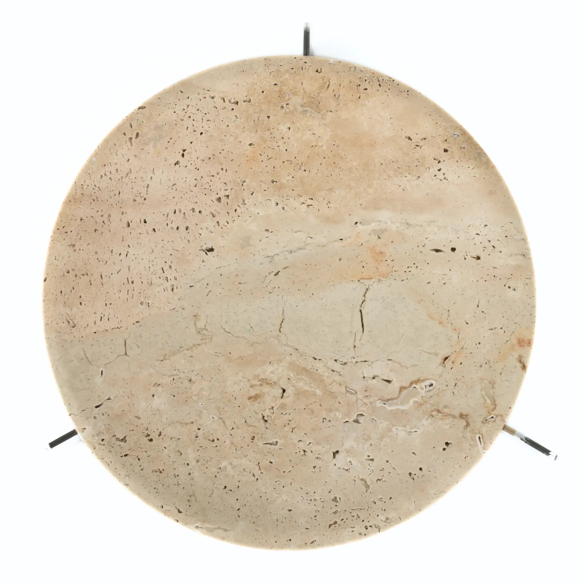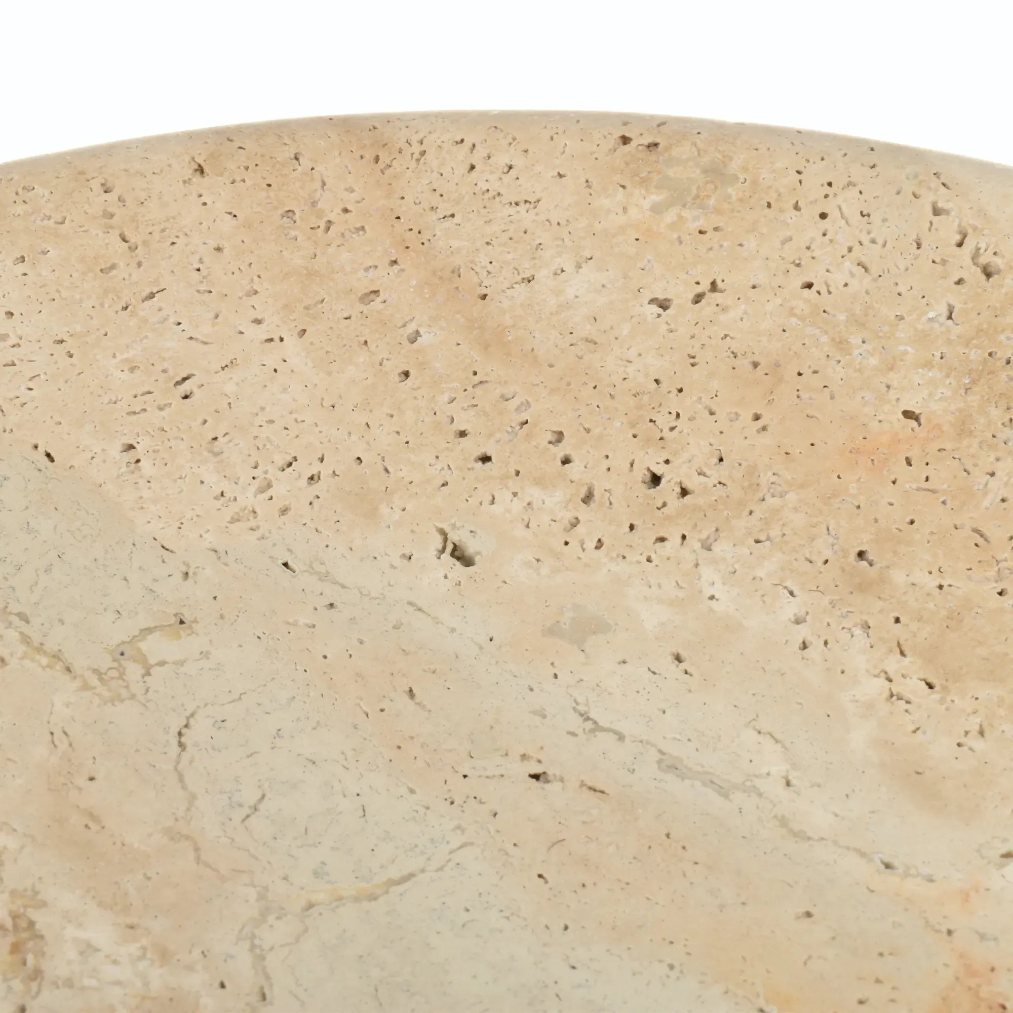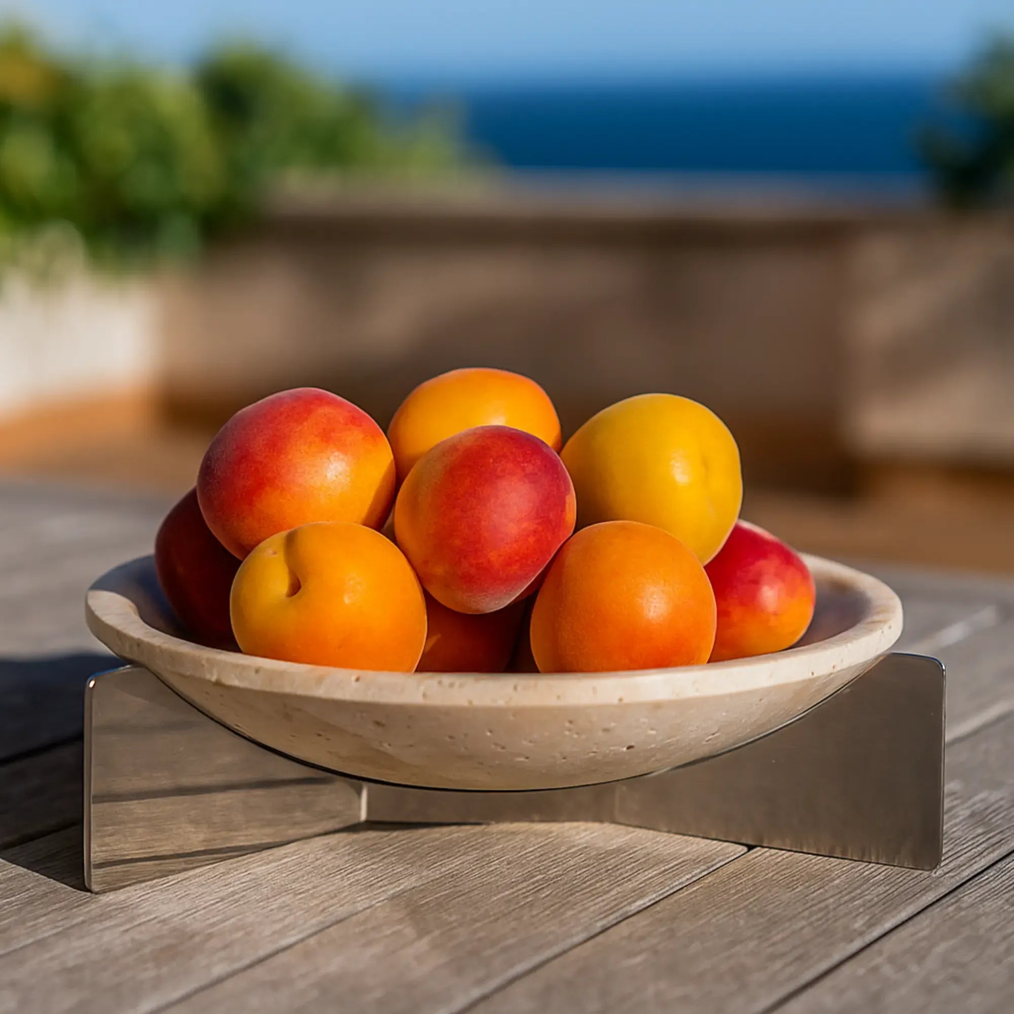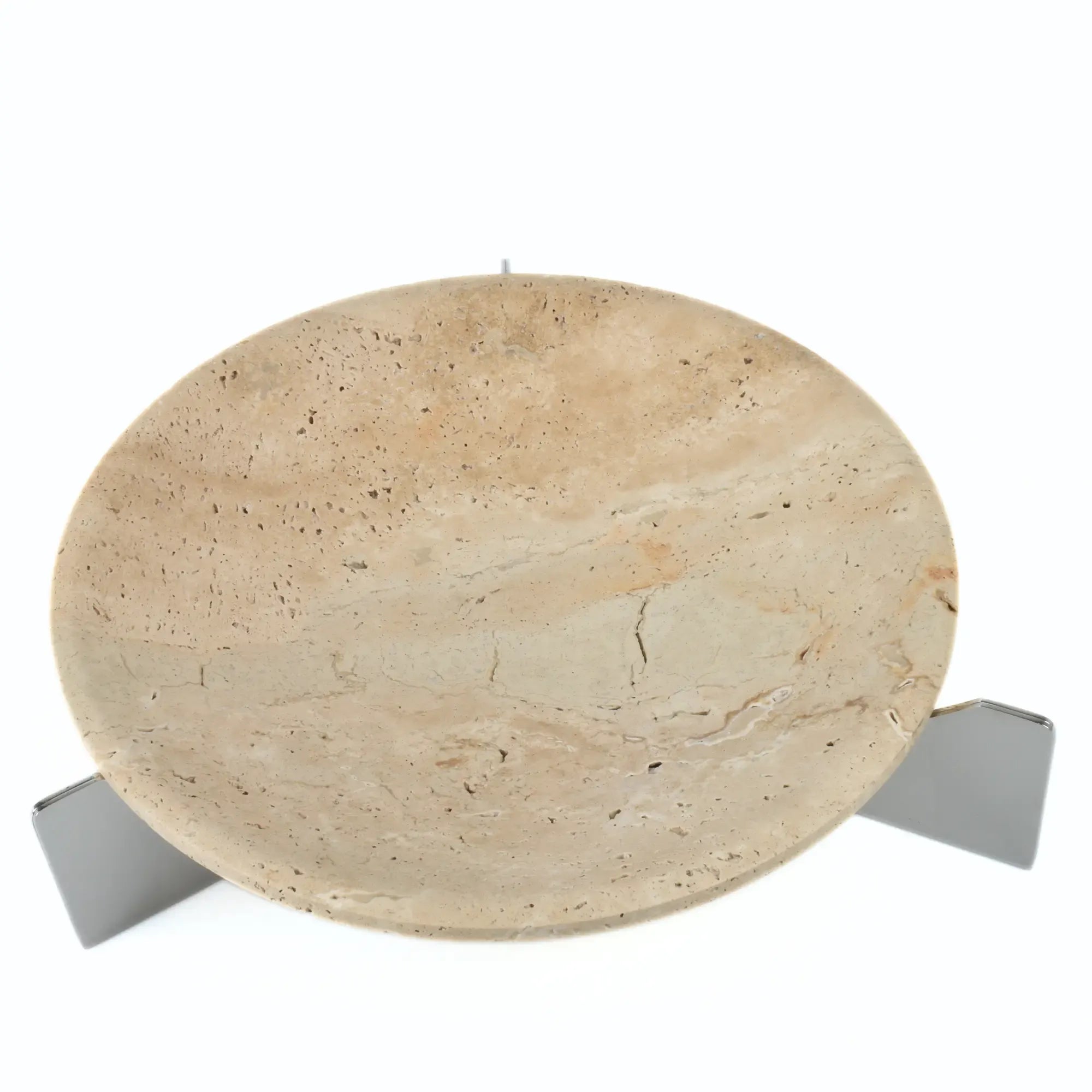 Handgefertigte Schale aus sandfarbenem Travertin mit feiner Naturstruktur, kombiniert mit einer gebürsteten Edelstahlbasis für moderne Eleganz und Stabilität.