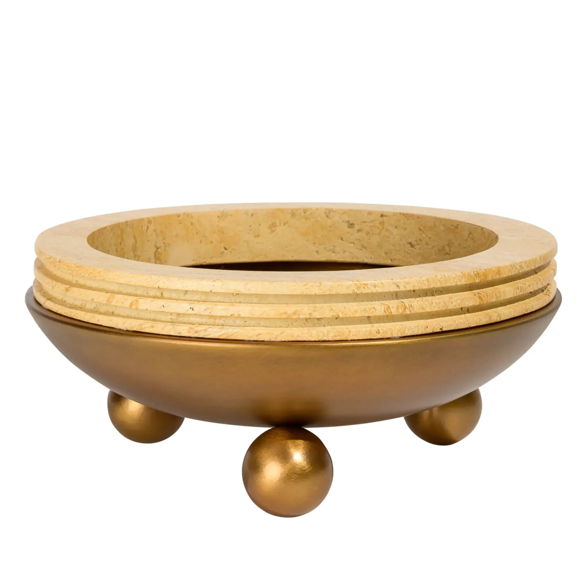 Designvase aus Travertin und Metall – die Coppa Aurea vereint Naturstein und Edelstahl zu einem harmonischen Wohnkunstwerk. Der robuste Travertinrand trifft auf gebürsteten Edelstahl in matter Goldoptik und bildet so ein spannendes Zusammenspiel aus Materialkontrast und skulpturaler Form. Auf stilvollen Kugelfüßen ruhend, wirkt das Objekt zugleich massiv und leicht – ein architektonisches Statement für moderne wie klassische Interieurs. Ob als große Vase für Trockenblumen, edle Dekoschale, Designobjekt auf Kommoden oder Tischen – Coppa Aurea ist vielseitig einsetzbar. Für Frischblumen empfiehlt sich ein Einsatz oder die Nutzung ohne Wasser. Besonders harmonisch wirkt die Kombination mit der Rundschale Romano im gleichen Stil. Ein stilvolles Highlight für Wohnzimmer, Empfangsbereiche, Homeoffice oder Designhotels – und ein hochwertiges Geschenk für Menschen mit Sinn für Form, Haptik und Material.