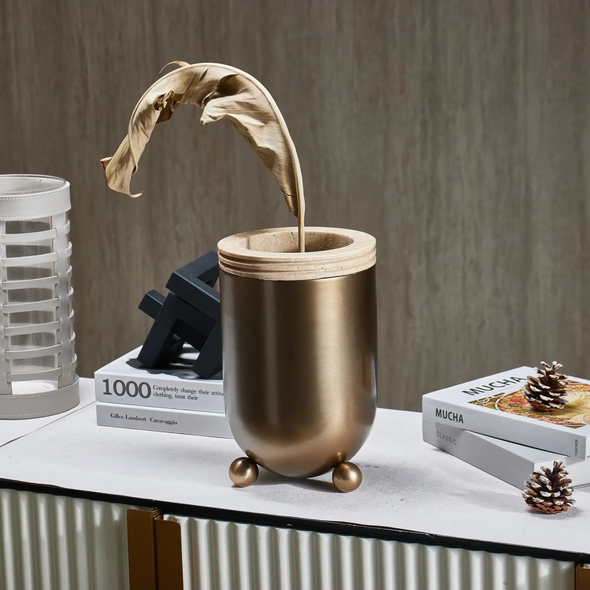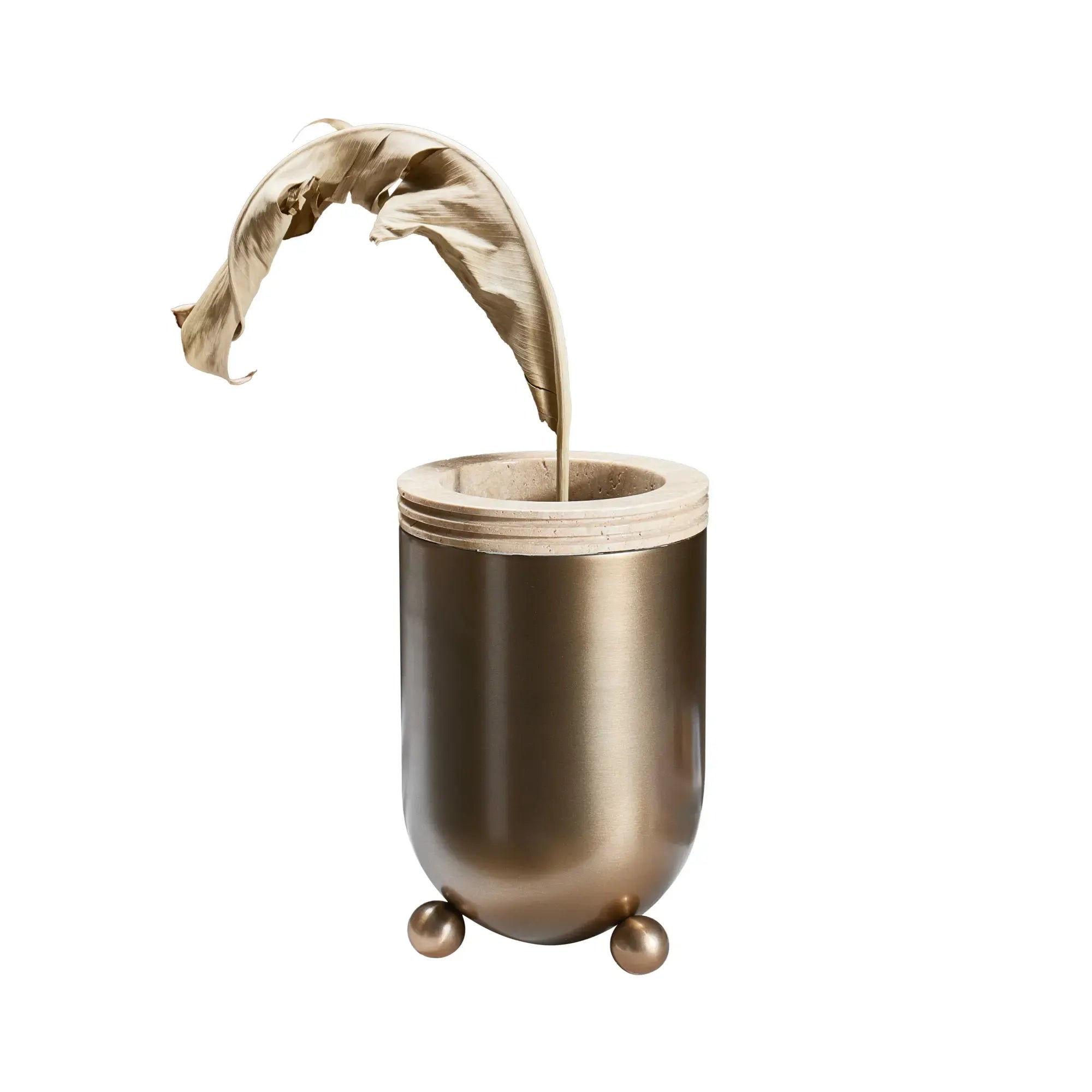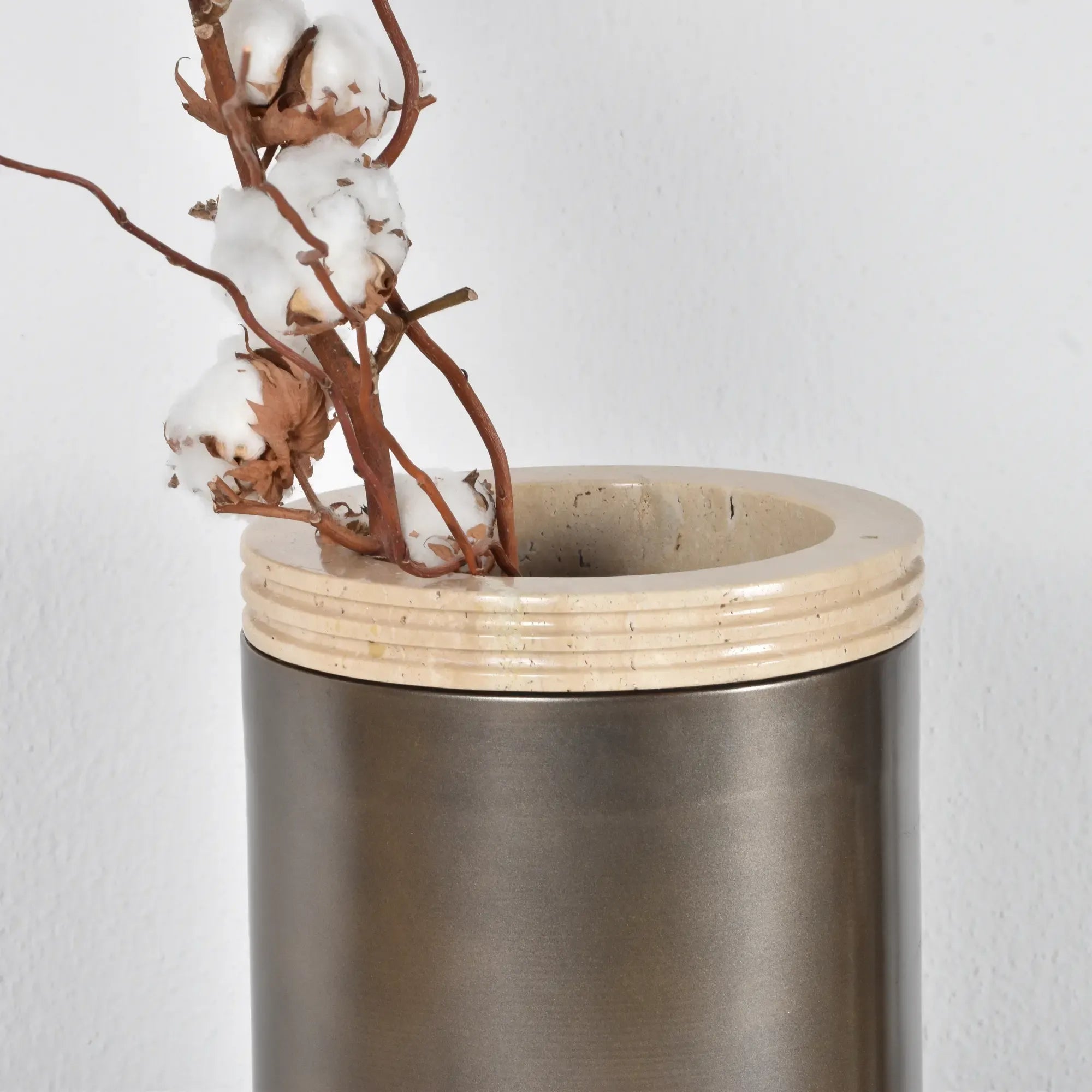 Travertin Edelstahl Dekoration, altrömisches Design modern, luxuriöse Tischdekoration, skulpturale Wohnaccessoires, zeitlose Eleganz, neoklassischer Stil, schwebendes Design, designvase modern, metallvase travertinrand, vase für trockenblumen.