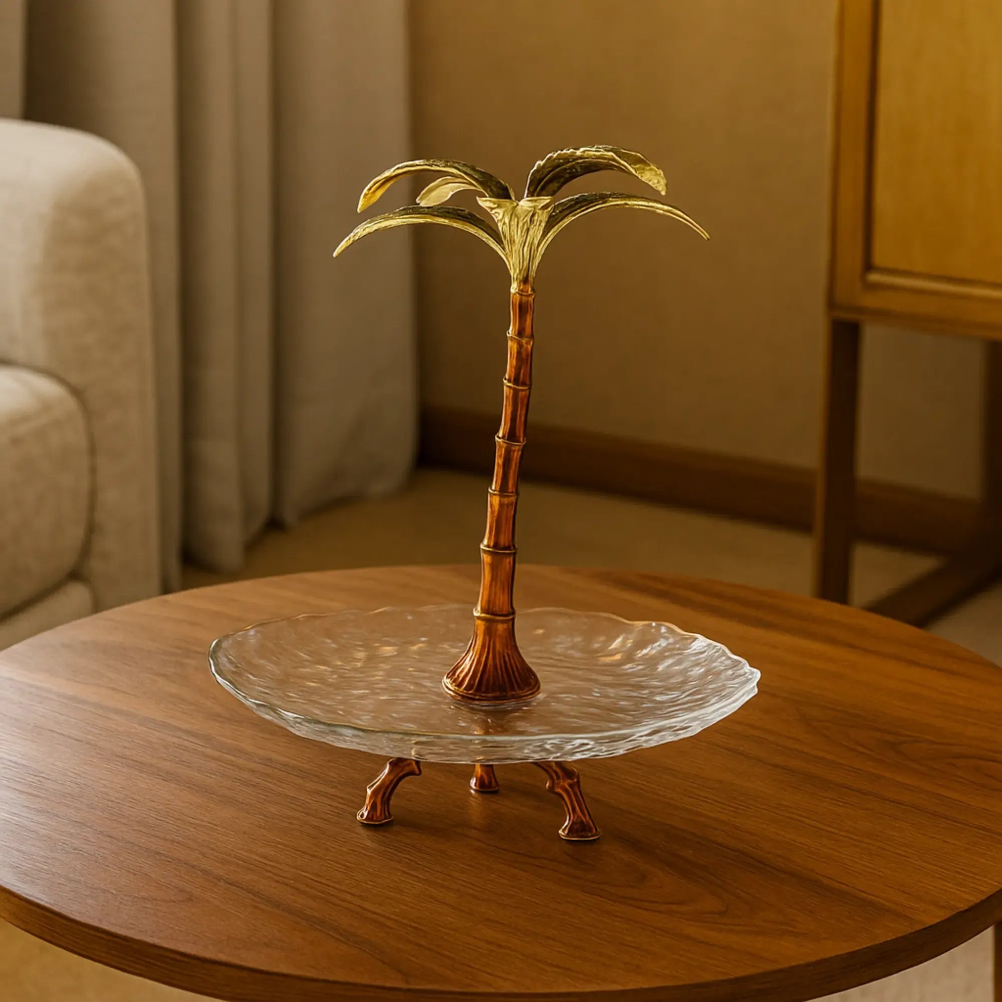 Die handgemachte Dessertschale vereint luxuriöses Design mit tropischem Flair. Ihr detailreiches Antikgold-Gestell in Palmenform, verziert mit grünen und goldenen Blättern, verleiht ihr eine edle Ausstrahlung im exotischen Stil. Mit einer Höhe von 29 cm und einem Durchmesser von 26,5 cm bietet diese Etagere im Palmenstil ausreichend Platz für Desserts, Obst, Pralinen oder kleine Dekorationen. Die Kombination aus handgefertigter Metallarbeit und veredelter Emailleoptik macht sie zu einem echten Blickfang. Diese dekorative Etagere im tropischen Design ist ideal für festlich gedeckte Tische, Empfangsbereiche, Hotels oder stilvolle Wohnräume. Ein luxuriöses Wohnaccessoire, das Funktionalität und Ästhetik harmonisch verbindet – auch als besonderes Geschenk ein Highlight.