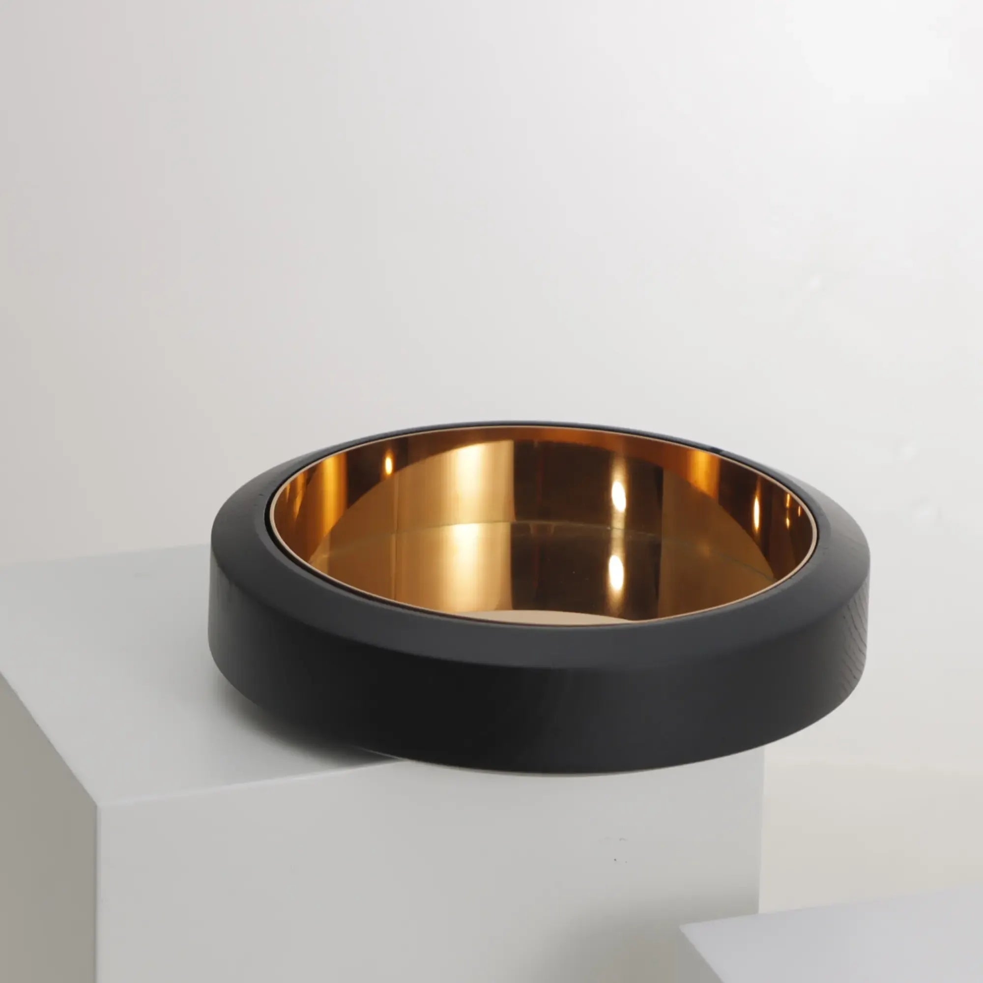 Runde Form mit klaren Linien – ein gelungenes Zusammenspiel aus zeitloser Formensprache und luxuriösem Finish. Die Kombination aus mattem Schwarz und glänzendem Gold wirkt modern, stilvoll und hochwertig.