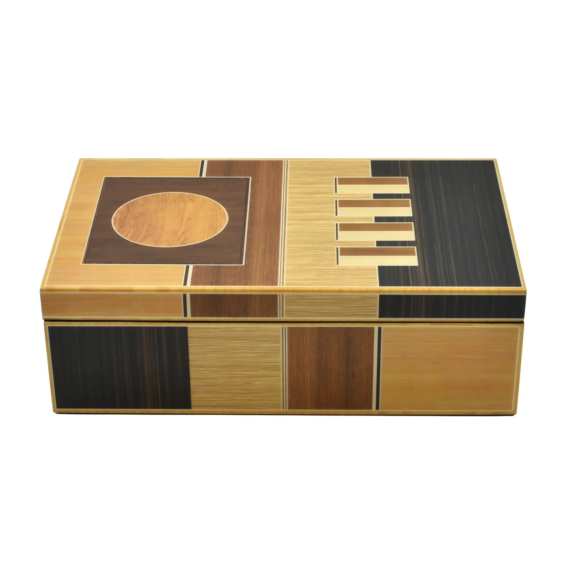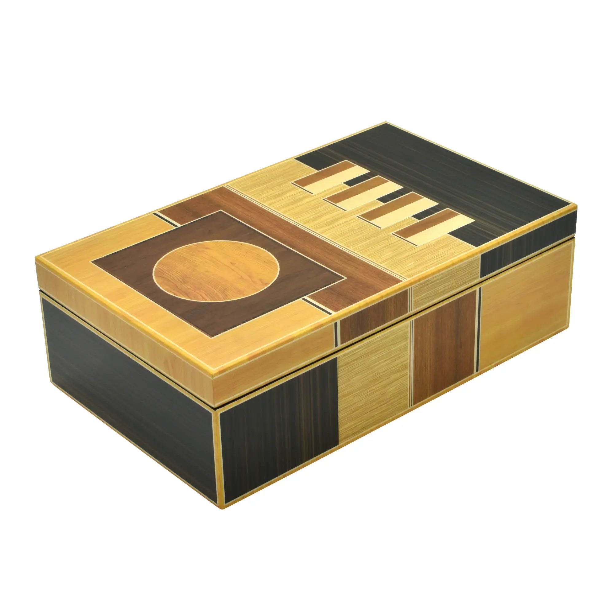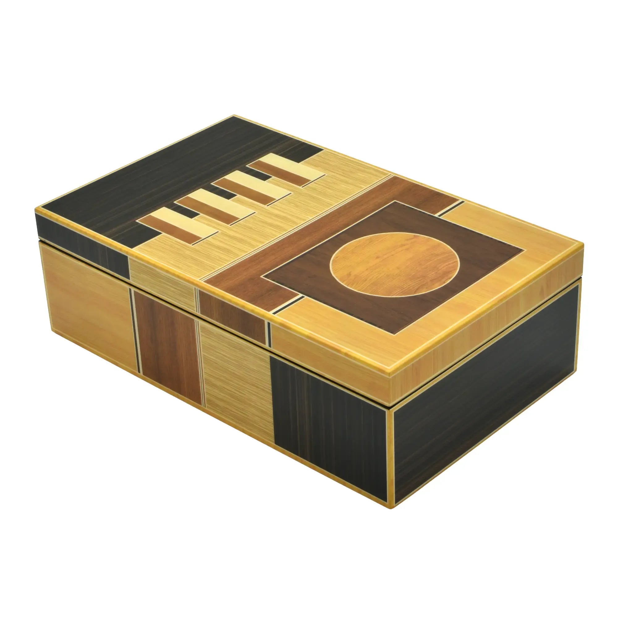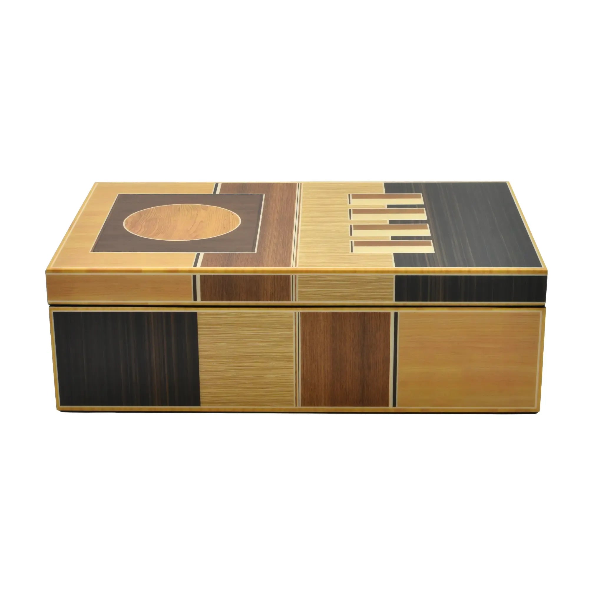 Diese rechteckige Aufbewahrungsbox vereint traditionelle Intarsienkunst mit moderner Geometrie. Von Hand gefügte Furniere verschiedener Harthölzer bilden ein grafisches Mosaik: Streifen, Felder und ein kreisförmiges Medaillon. Feine Trennlinien akzentuieren die Übergänge, der mehrschichtige Lack verleiht Tiefe und Spiegelglanz. Präzise Kanten, bündig schließender Deckel, klar strukturierter Stauraum für Schmuck und kleine Kostbarkeiten. Ein stilles Designobjekt und Schmuckdose zugleich – reduzierte Form, warme Materialität, zeitlose Marqueterie.