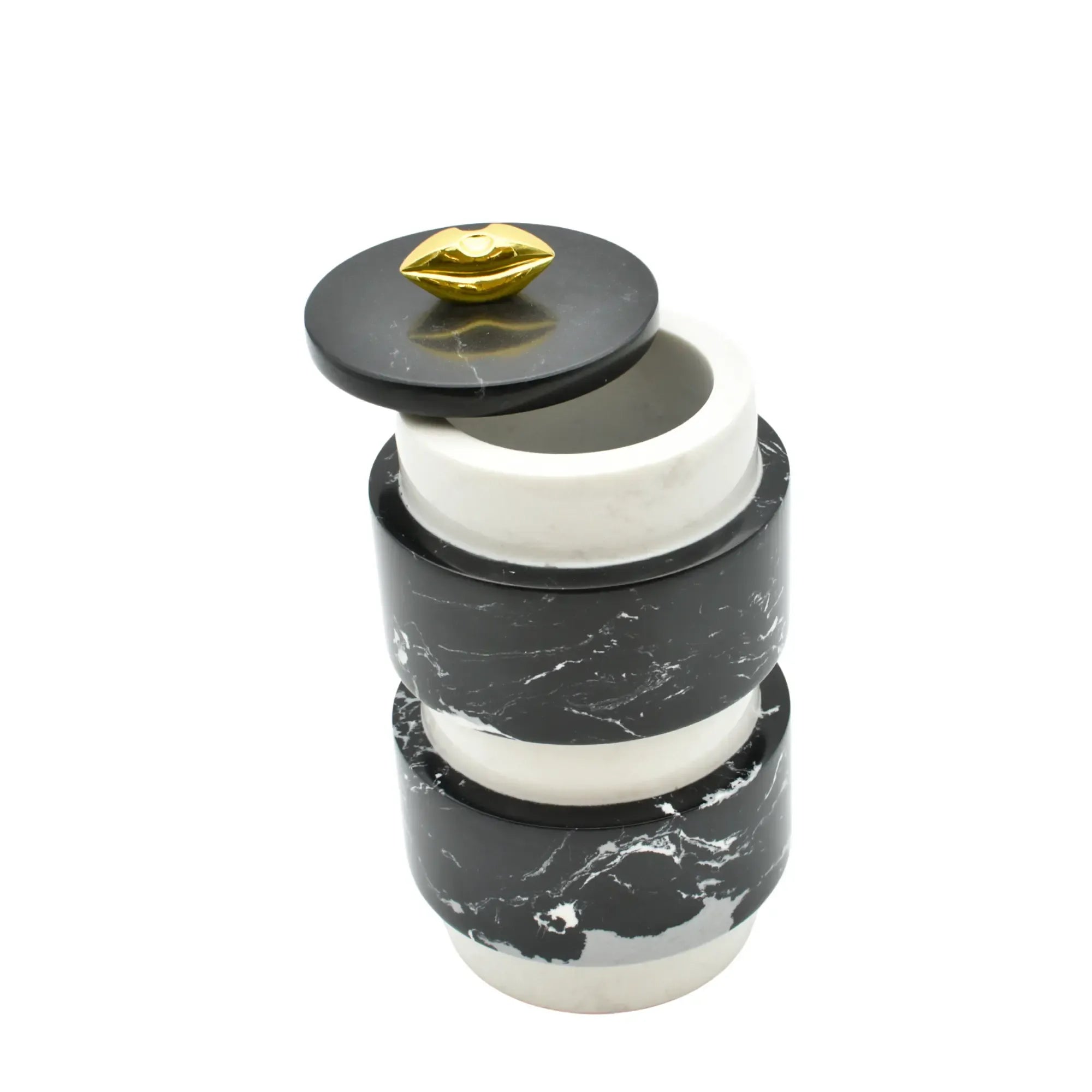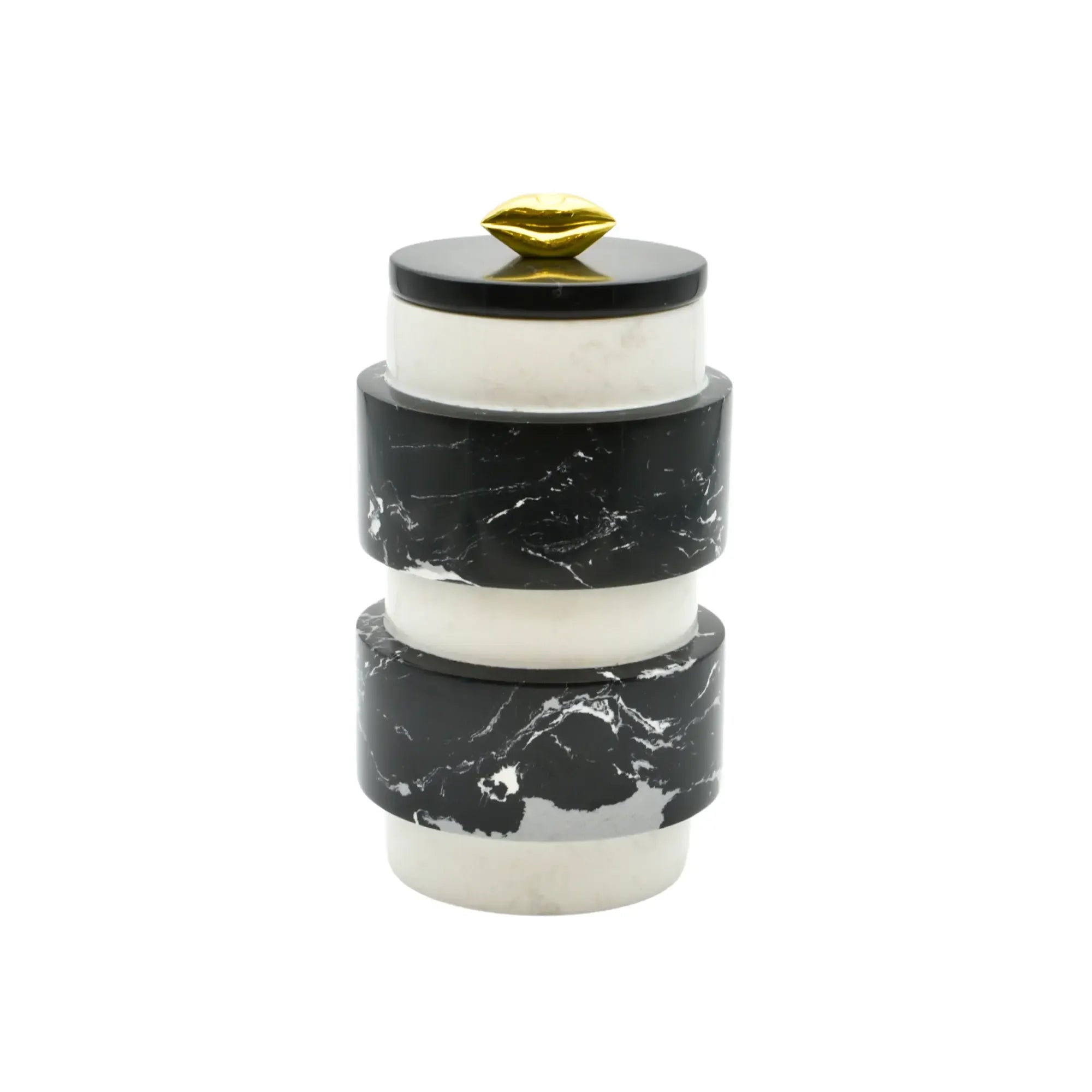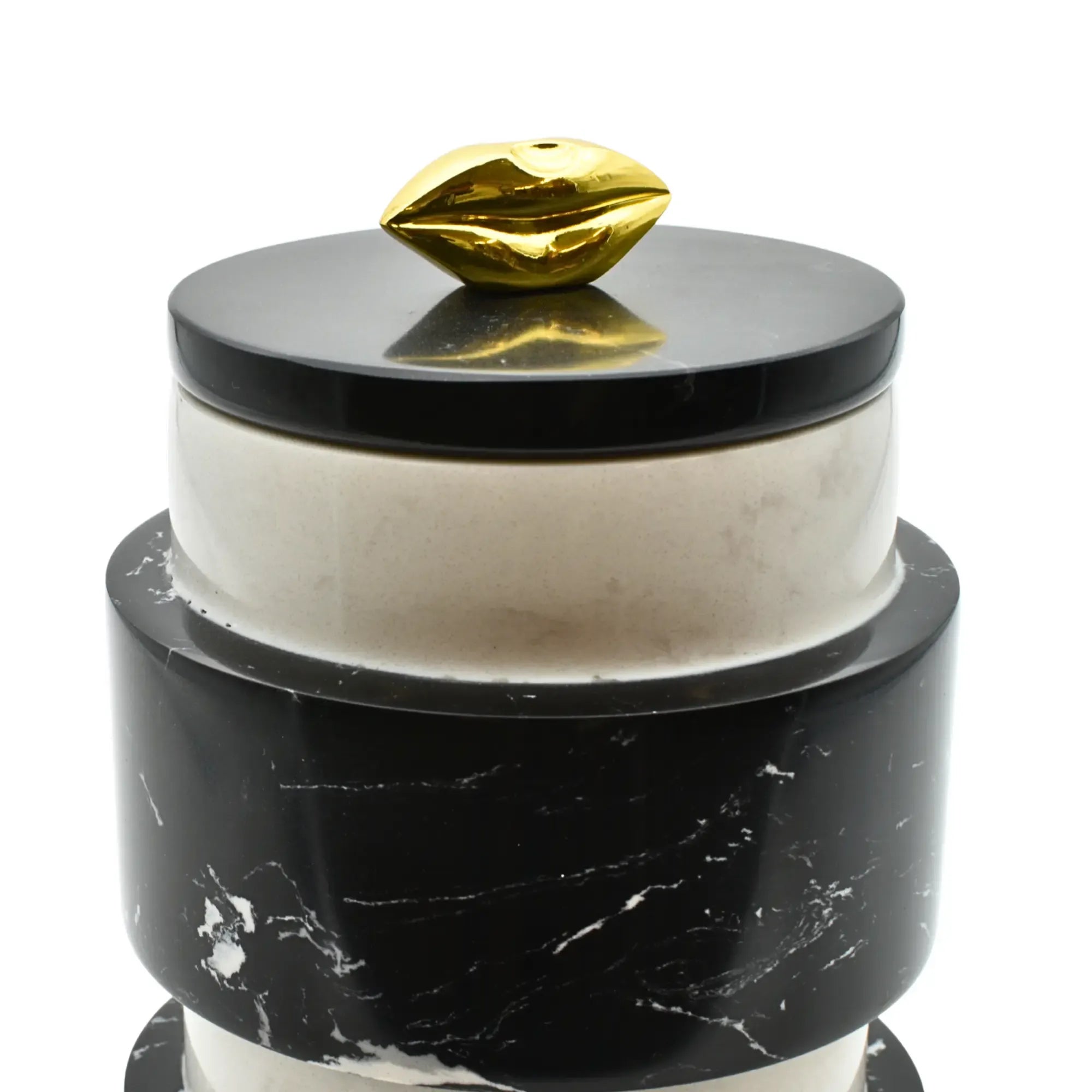 Gefertigt aus hochwertigem schwarzem und weißem Marmor mit individueller Maserung – jedes Stück ein Unikat. Der goldfarbene Deckelgriff in Form von Damenlippen setzt ein kunstvolles, dekoratives Highlight mit femininer Eleganz.