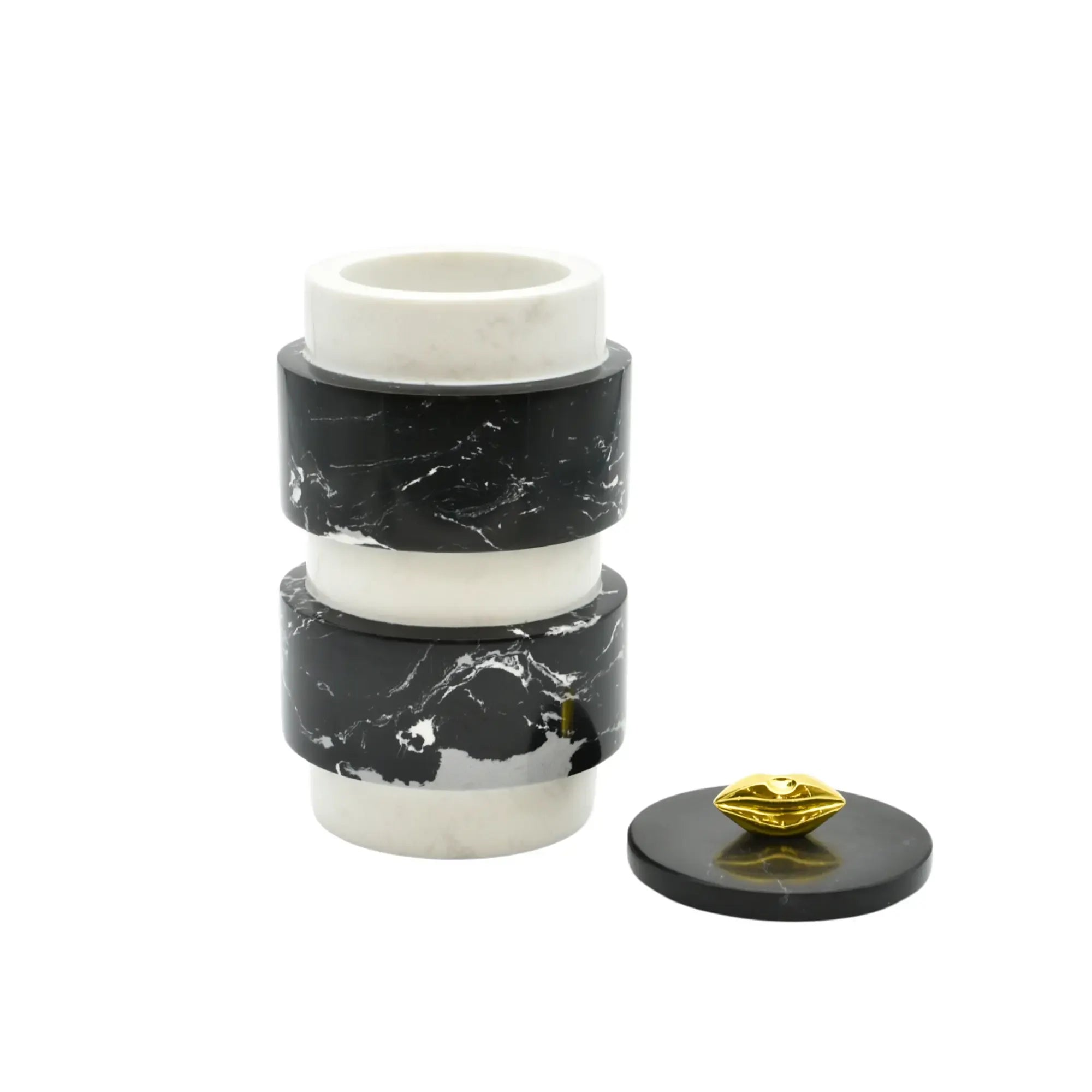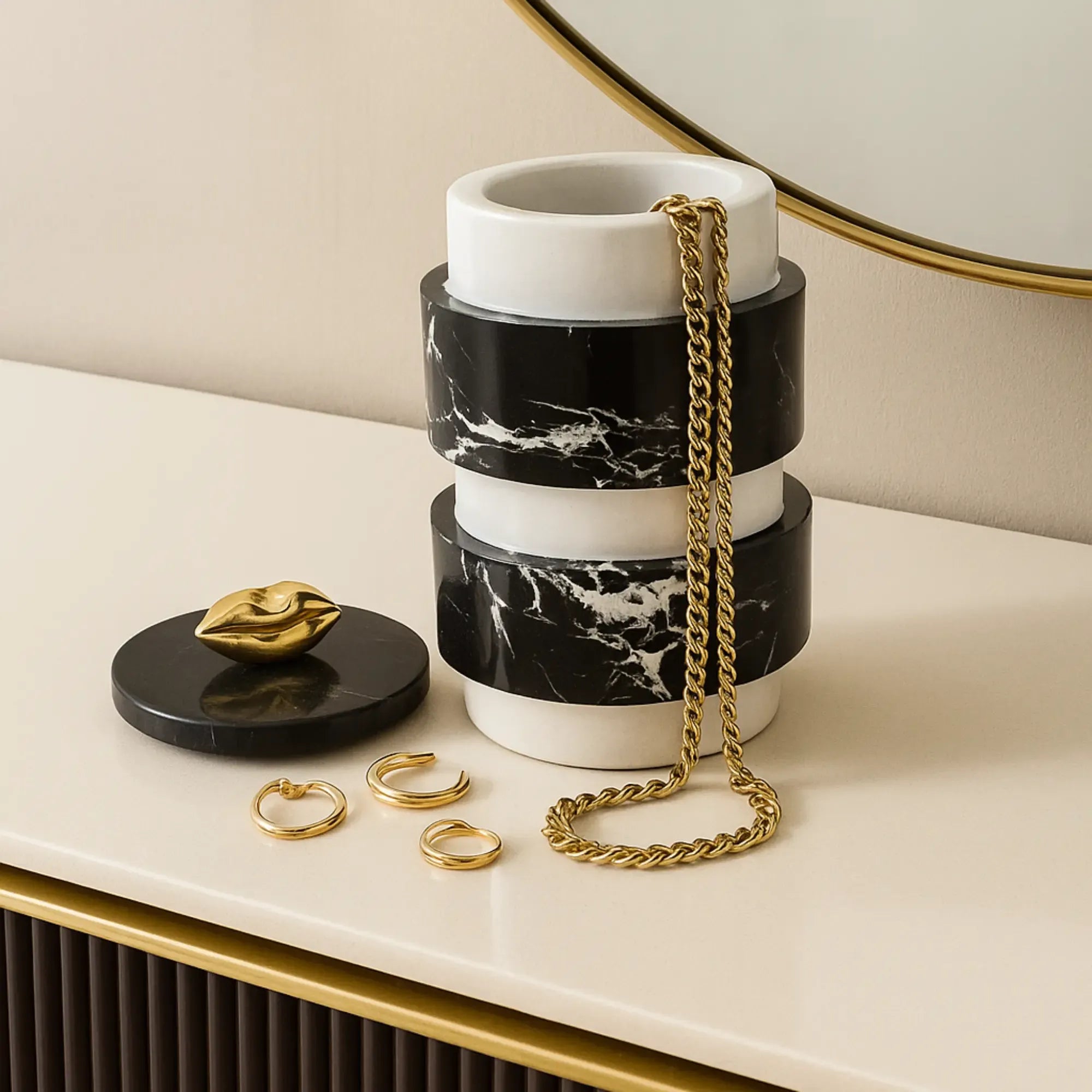 Das Piernas Noir Schmuckkästchen vereint luxuriöse Handwerkskunst mit zeitlosem Design. Die zylindrische Form kombiniert schwarzen und weißen Marmor zu einem ausdrucksstarken Wohnaccessoire mit eleganter Maserung und harmonischem Farbspiel. Der goldfarbene Deckelgriff in Lippenform setzt einen raffinierten Akzent und macht die Dose zu einem echten Designobjekt mit Blickfangcharakter – ob auf dem Nachttisch, im Regal oder auf dem Schminktisch. Als stilvolle Schmuckdose oder moderne Schmuckaufbewahrung eignet sie sich ideal zur Aufbewahrung von Lieblingsstücken – von Ringen über Ohrringe bis hin zu kleinen Erinnerungen. Sie bringt Luxus in jedes Bad, Schlafzimmer oder Wohnzimmer und fügt sich perfekt in moderne wie klassische Interieurs ein. Ein besonderes, hochwertiges Geschenk für Mütter, Omas oder stilbewusste Frauen, das mit Eleganz und Charakter überzeugt – und dabei nützlich wie dekorativ zugleich ist.