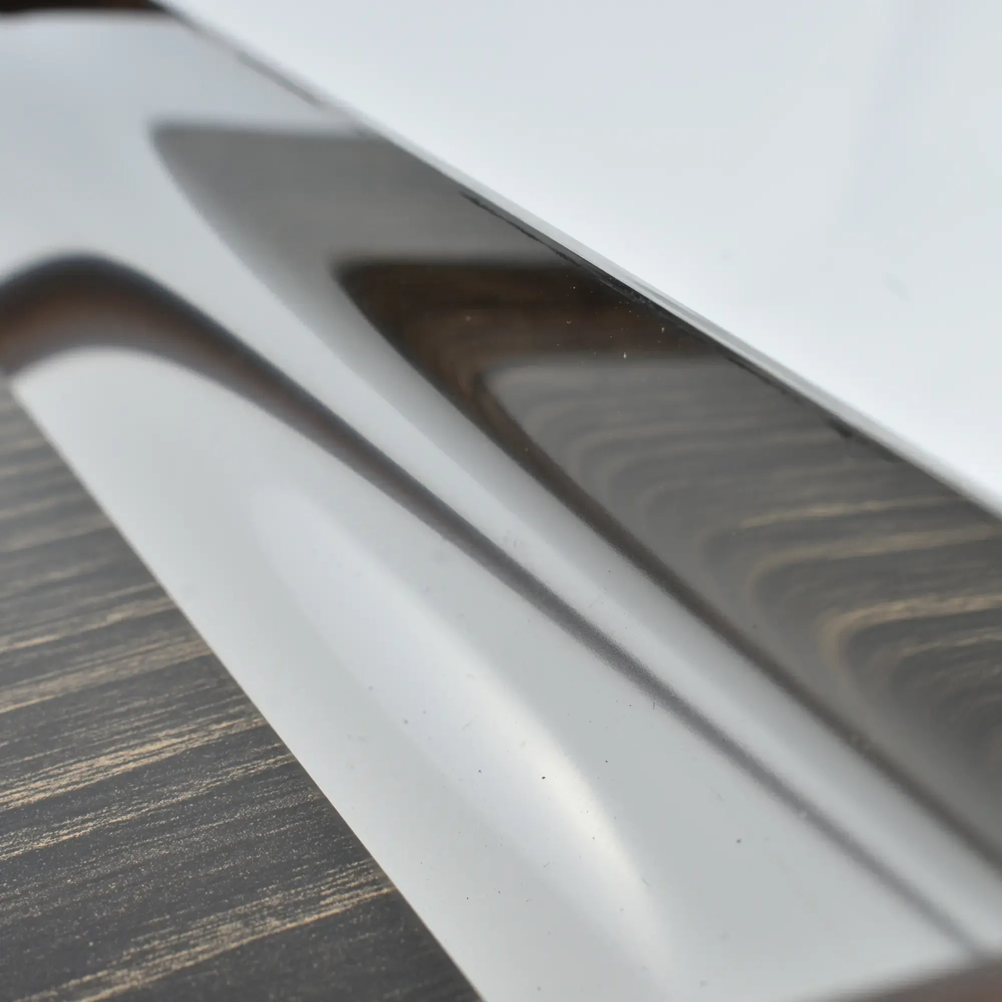 Echtes Holz mit feiner, natürlicher Maserung – kombiniert mit poliertem Edelstahlrahmen und einer pflegeleichten Acryl-Oberfläche, die für modernen Glanz und Schutz sorgt.