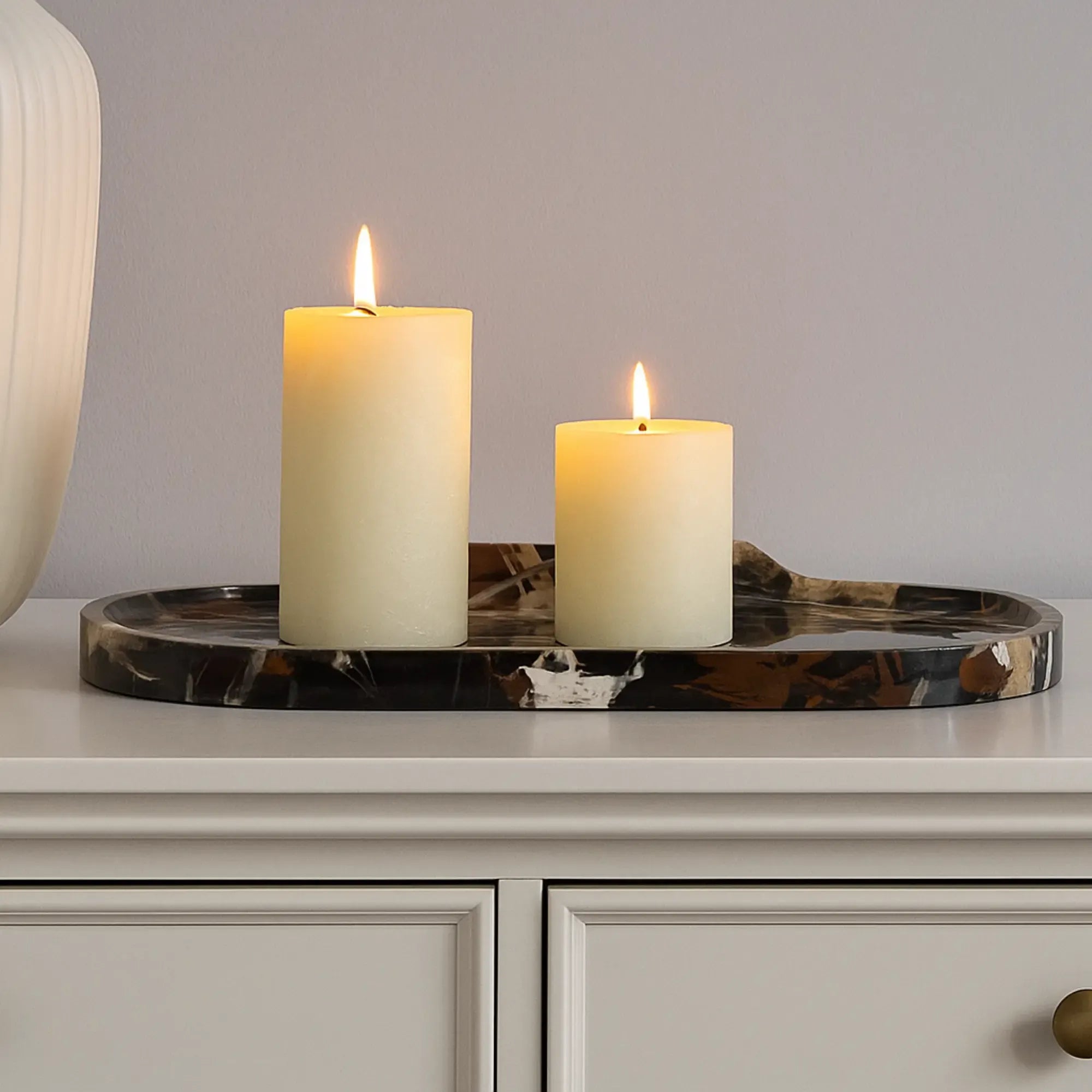 Das Ablagetablett aus dunkelbraunem Marmor vereint altrömische Eleganz mit robuster Schönheit. Markante weiße und rote Maserungen verleihen jedem Stück eine einzigartige Ausstrahlung, während die glatte, glänzende Oberfläche die luxuriöse Verarbeitung unterstreicht. Dieses marmorablage modern eignet sich perfekt für den täglichen Gebrauch oder als stilvolles Dekorationsstück und setzt edle Akzente auf Beistelltischen, Kommoden oder im Wohnbereich. Es ist perfekt als Serviertablett in der Küche für Obst oder im Wohnzimmer als Kerzenablage. Ein schweres Stück, das Natur und Handarbeit vereint. Ein zeitloser Ausdruck von Luxus und Raffinesse, ideal für anspruchsvolle Interieurs. Designideen mit Kerzen, dieses Ablagetablett eignet sich hervorragend für verschiedene Feste oder als Dekoobjekt in jedem Raum. Es passt perfekt zu marmorablage für deko oder als luxuriöses Geschenk für Designliebhaber. Ideal für Hotels, Restaurants und Empfangsbereiche, um dort eine elegante Atmosphäre zu schaffen.