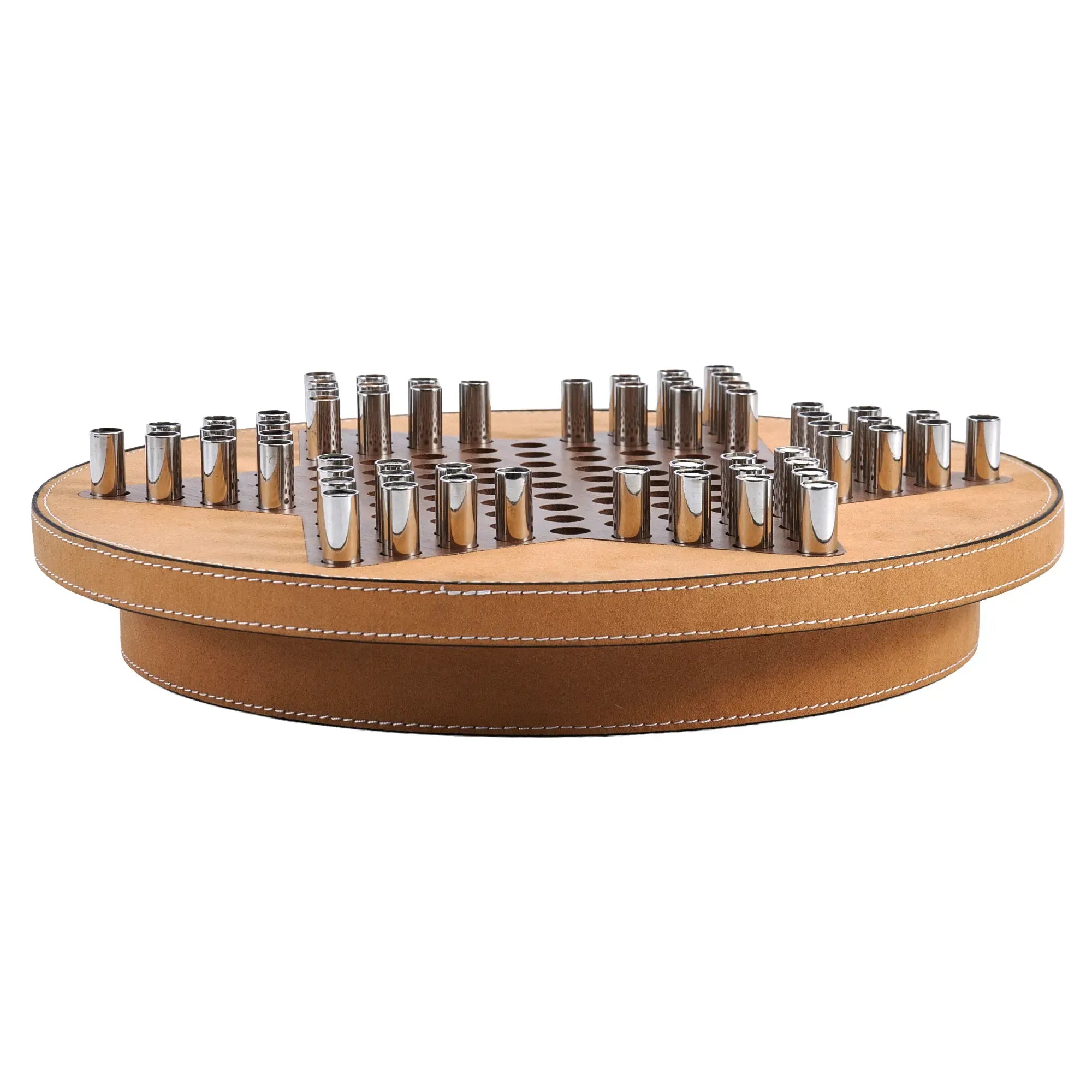 Dieses runde Strategiespiel verbindet sorgfältige Manufakturarbeit und edle Materialien zu einem kultivierten Designobjekt. Der lederbezogene Korpus in Cognac fasst ein eingelegtes Nussbaum-Spielfeld mit präzise gefrästen Bohrungen. In Materialwahl, Lederverarbeitung und Farbigkeit erinnert das Objekt an die Ästhetik italienischer Designhäuser wie Poltrona Frau – nicht als Kopie, sondern als hochwertige, eigenständige Interpretation. Die sechszackige Sterngeometrie zitiert klassische Sternhalma-Bretter in zeitloser Form, während polierte Metallsteine mit farbigen Köpfen ruhig gleiten und glänzende Akzente setzen. Feine Steppnähte, sanftes Lederkorn und die warme Holzmaserung verleihen dem Spiel Ruhe, Gewicht und eine spürbare haptische Präsenz.