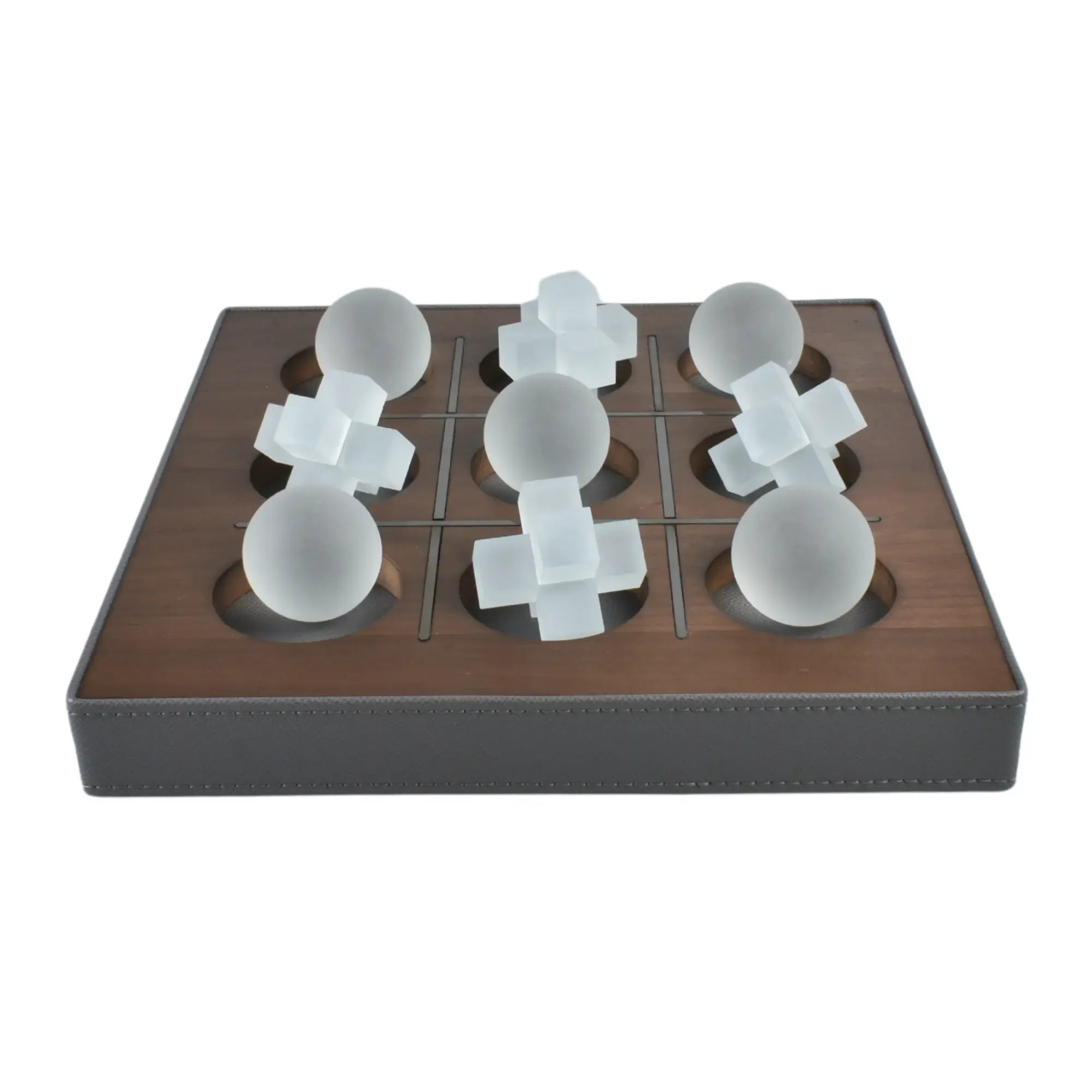 Tischspiel - Tic-Tac-Toe-Spiel - Glasfiguren Drei-Gewinnt-Set Brettspiel Aurora Luxe Leder & Wallnuss & Kristall, Grau & Walnuss, gross und robust, im Stil: Elegant, Modern
