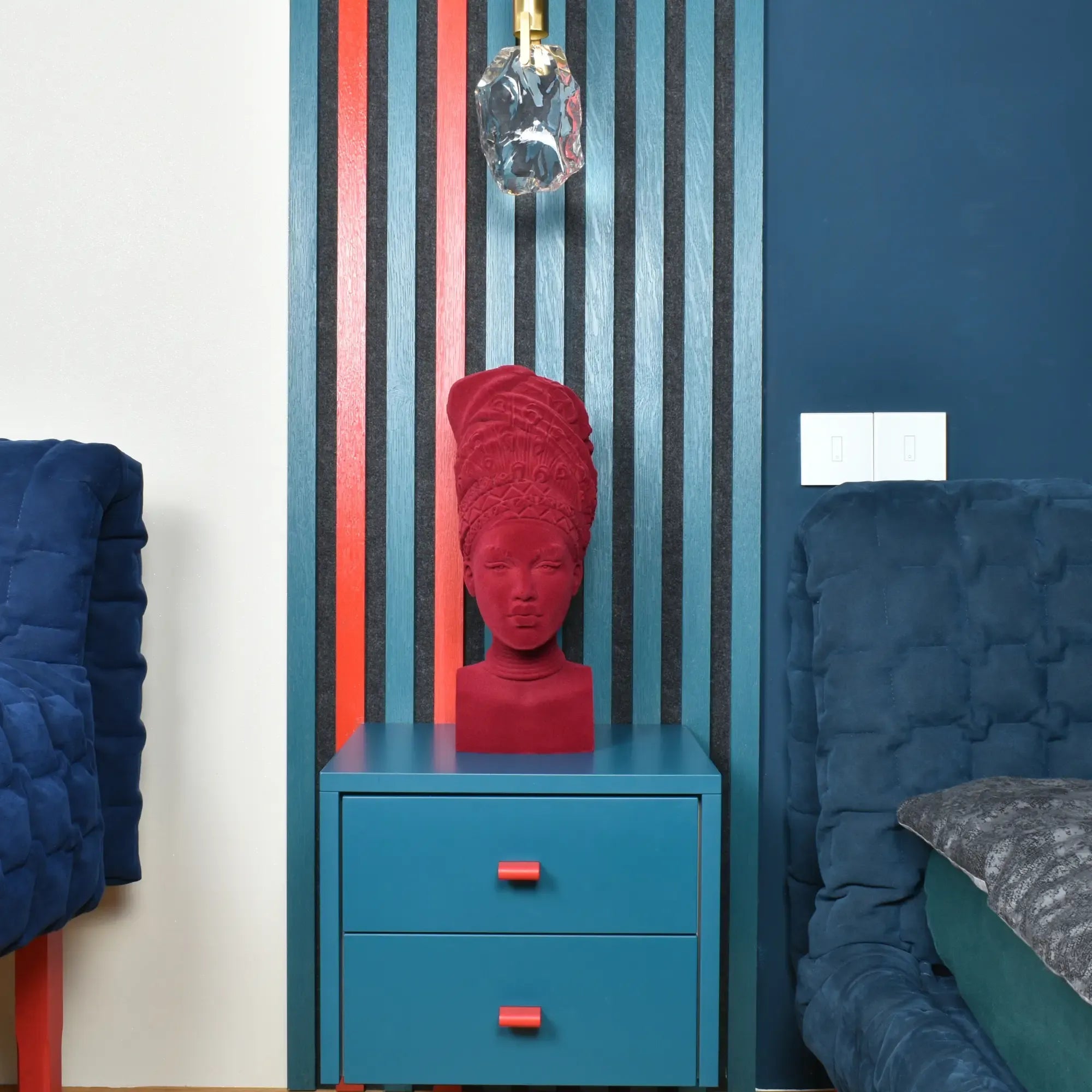 Die Dekorationsfigur „Afrikanische Frau“ besticht durch ihre kunstvolle Kopfbedeckung, ihr ausdrucksstarkes Profil und ein warmes, sympathisches Gesicht. Gefertigt aus feinstem Samt in tiefem Rot, überzeugt sie mit einer luxuriösen, weichen Oberfläche und strahlt zeitlose Eleganz aus. Die detailreiche Verarbeitung verleiht dieser Samtfigur im Afro-Stil eine kraftvolle, zugleich sanfte Präsenz. Diese Dekofigur aus Samt ist nicht nur ein stilvolles Kunstobjekt, sondern auch funktional: ideal im Schlafzimmer als Schmuckhalter für Ketten oder als edles Sammelobjekt für Liebhaber außergewöhnlicher Wohnaccessoires. Perfekt für moderne Dekorationsideen, egal ob auf dem Sideboard, im Regal oder im Empfangsbereich. Besonders ausdrucksstark in Kombination mit weiteren Samt-Objekten aus der Kollektion, entsteht ein harmonischer, kulturell inspirierter Look. Auch als Geschenk für Frauen ein stilvolles Highlight.