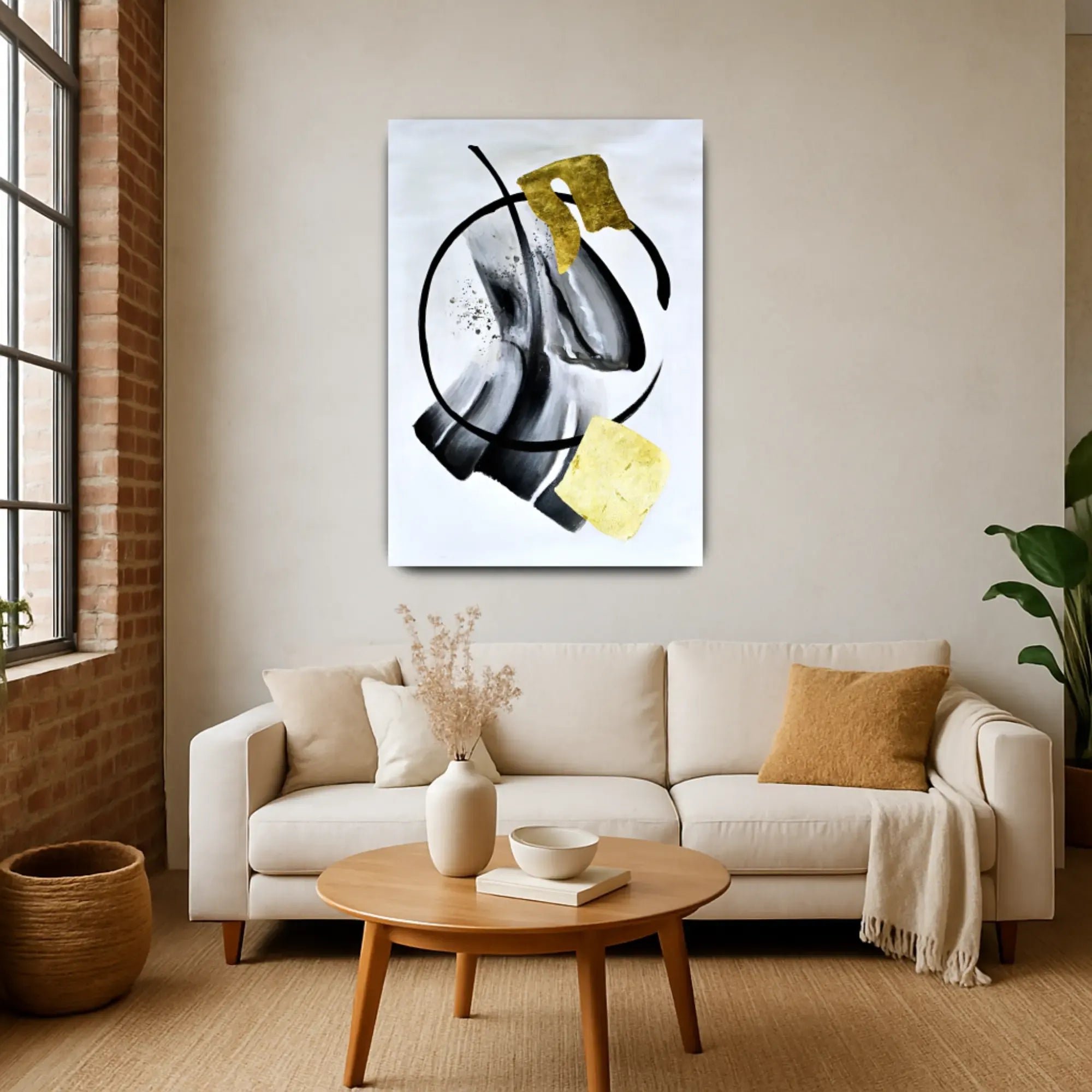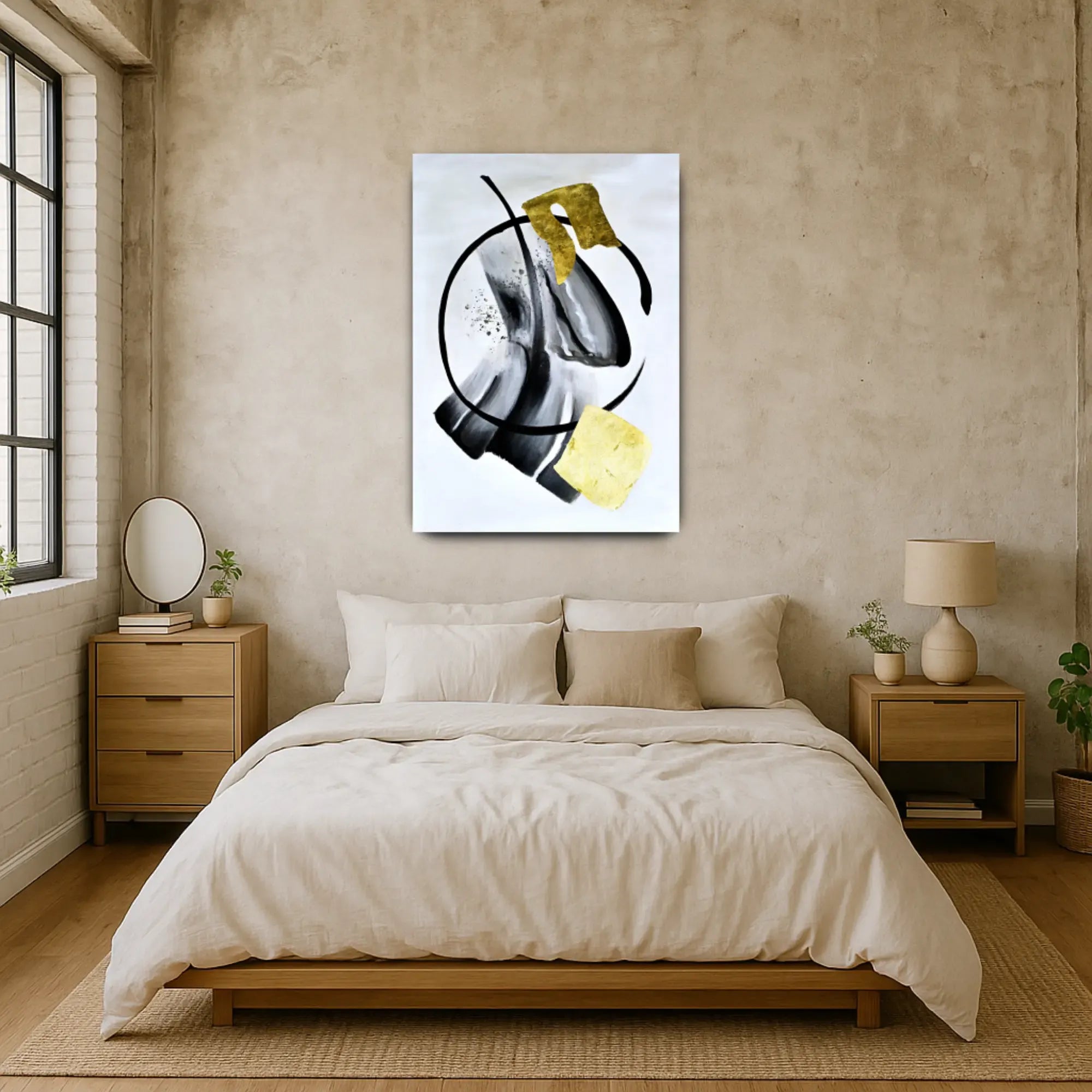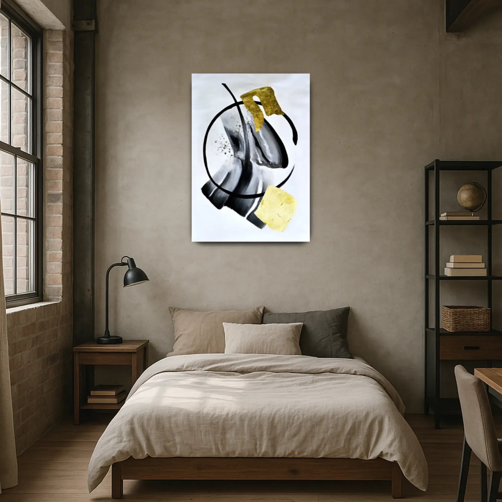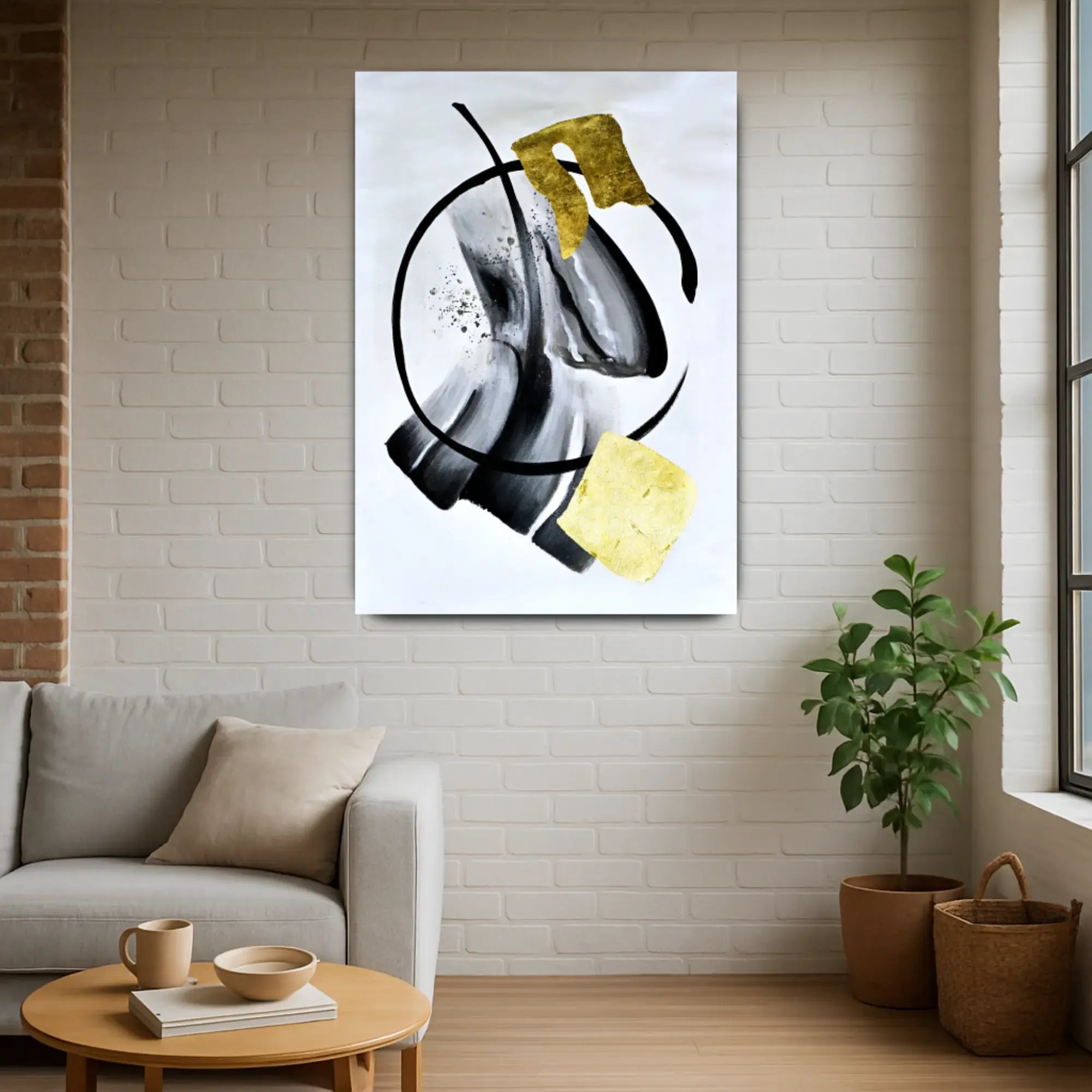 Ein puristisches, abstraktes Werk, das durch seine Reduktion und Eleganz besticht. Die Komposition ist auf das Wesentliche konzentriert: fließende Schwarz-Weiß-Kontraste, eine geschlossene Kreisform als Symbol für Einheit und zyklische Bewegung, durchbrochen von zwei kraftvoll aufgetragenen, goldenen Feldern. Das Zusammenspiel aus Dynamik und Ruhe schafft ein meditatives Spannungsfeld – modern, zeitlos und gleichzeitig luxuriös.
