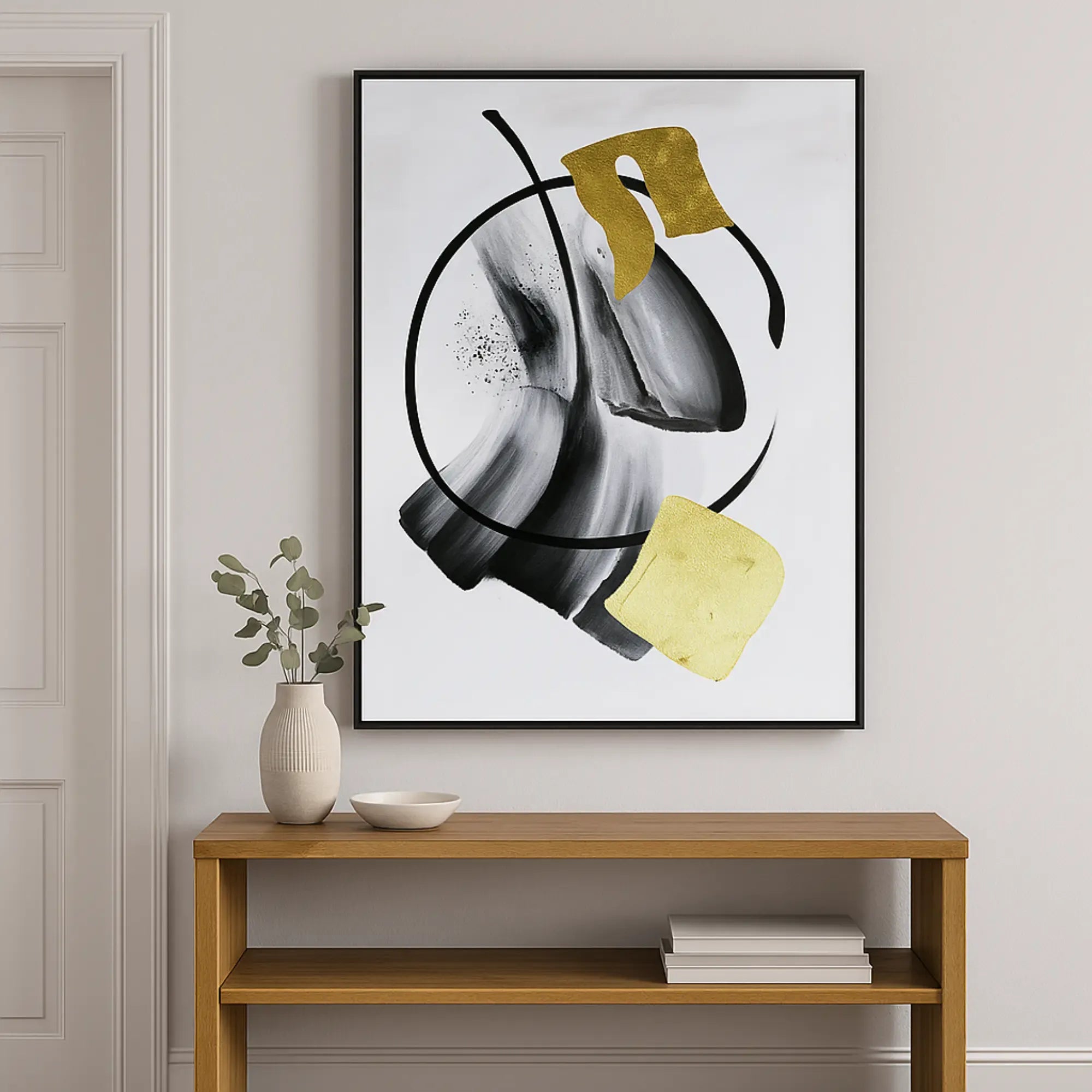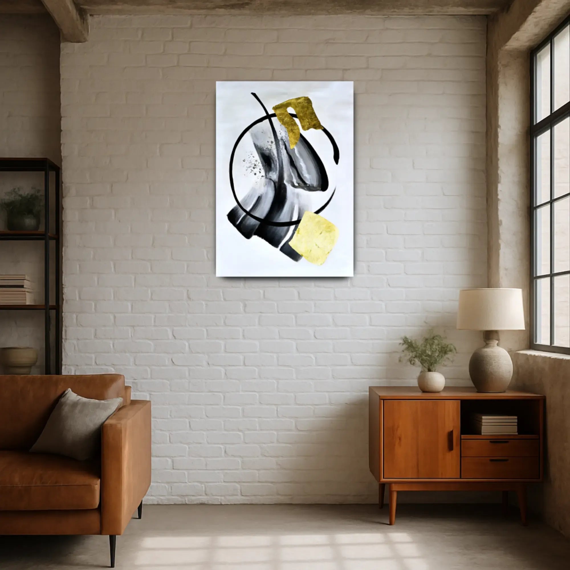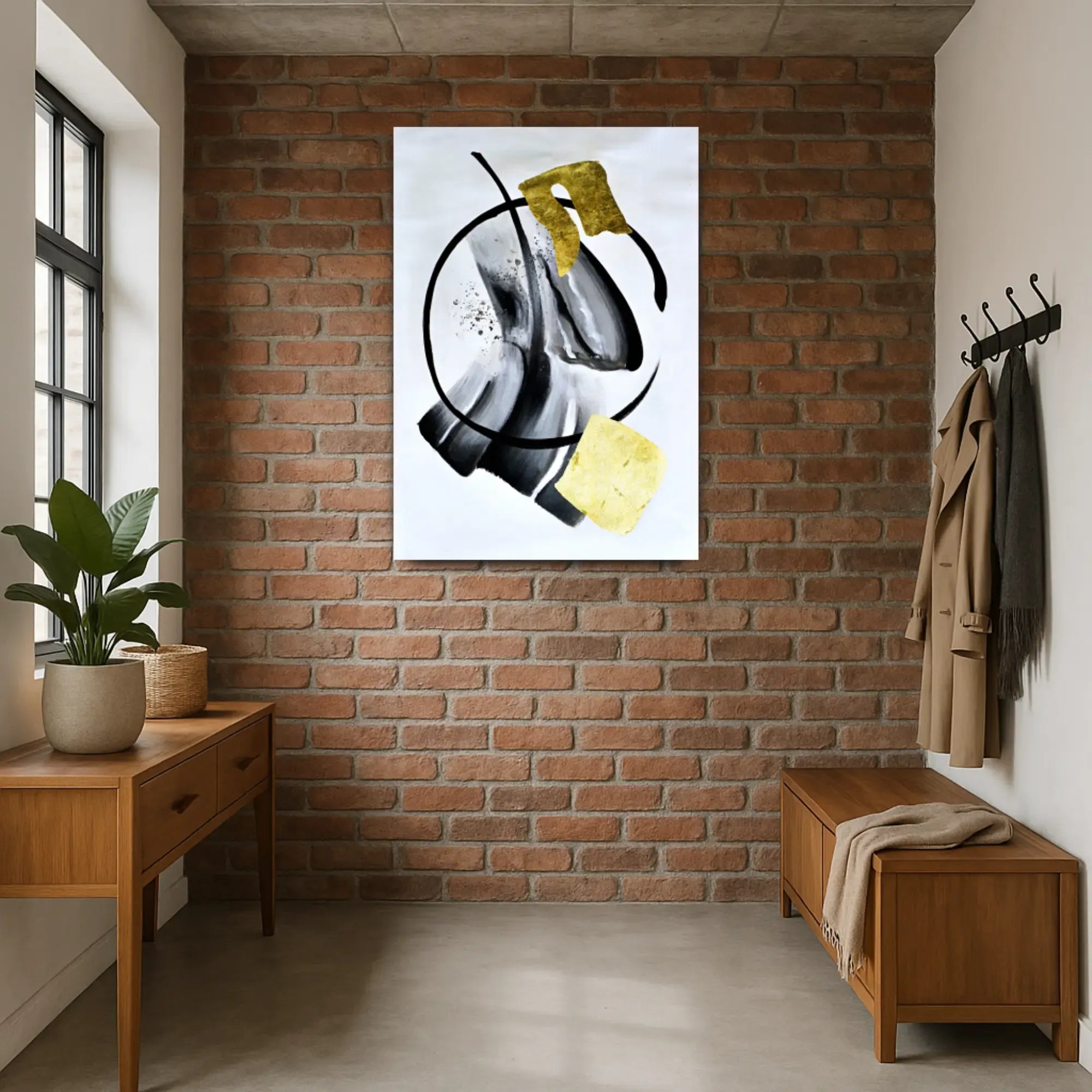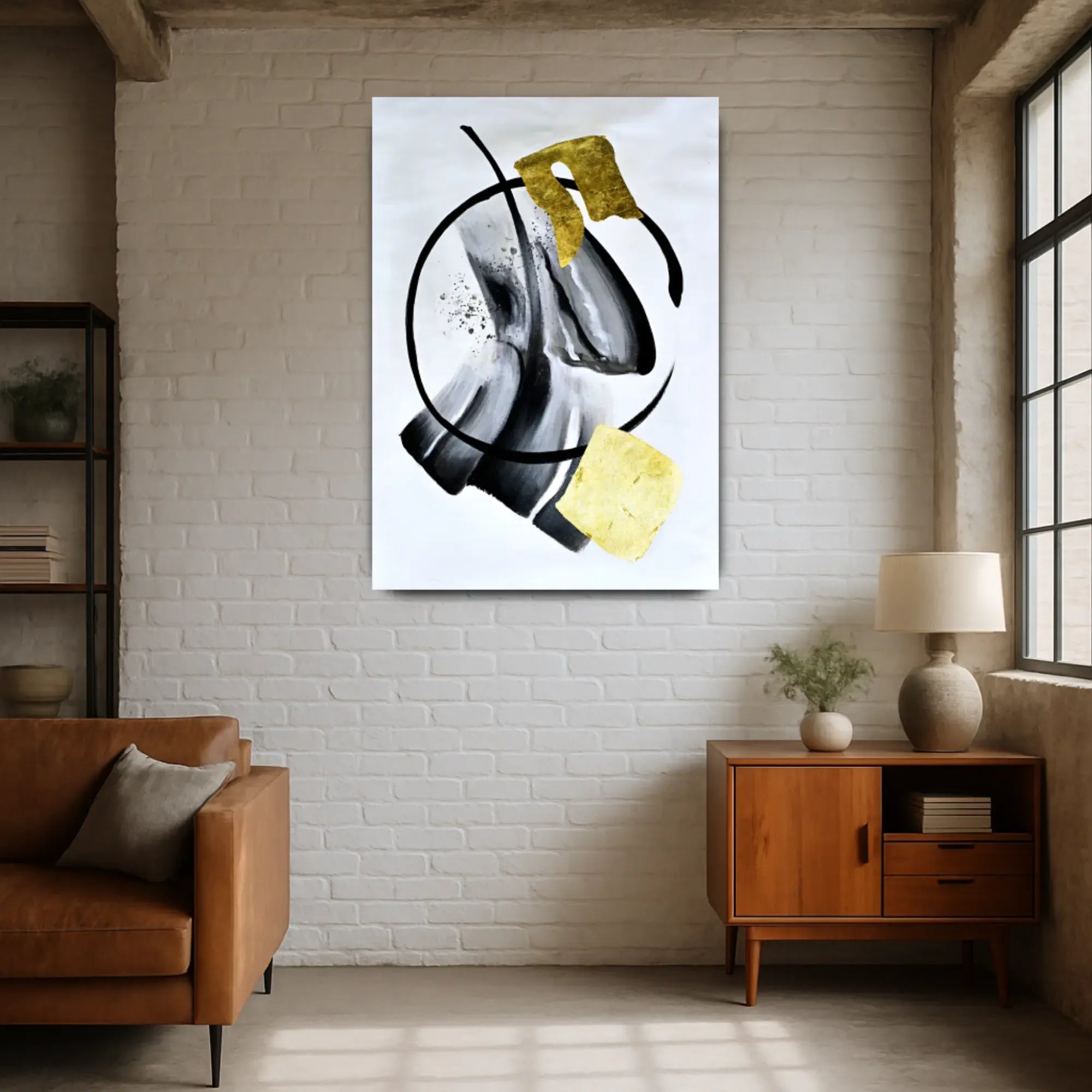 Ein puristisches, abstraktes Werk, das durch seine Reduktion und Eleganz besticht. Die Komposition ist auf das Wesentliche konzentriert: fließende Schwarz-Weiß-Kontraste, eine geschlossene Kreisform als Symbol für Einheit und zyklische Bewegung, durchbrochen von zwei kraftvoll aufgetragenen, goldenen Feldern. Das Zusammenspiel aus Dynamik und Ruhe schafft ein meditatives Spannungsfeld – modern, zeitlos und gleichzeitig luxuriös.