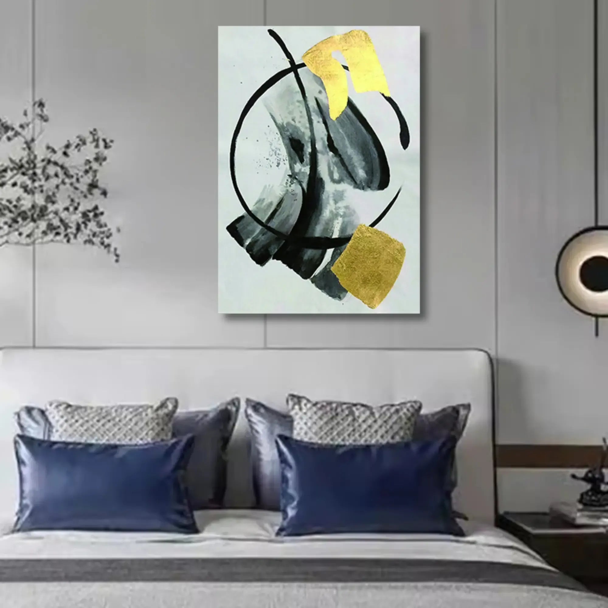 Schwarz, Weiß, Grau in harmonischen Verläufen – akzentuiert durch zwei goldene Felder mit strukturierter Oberfläche