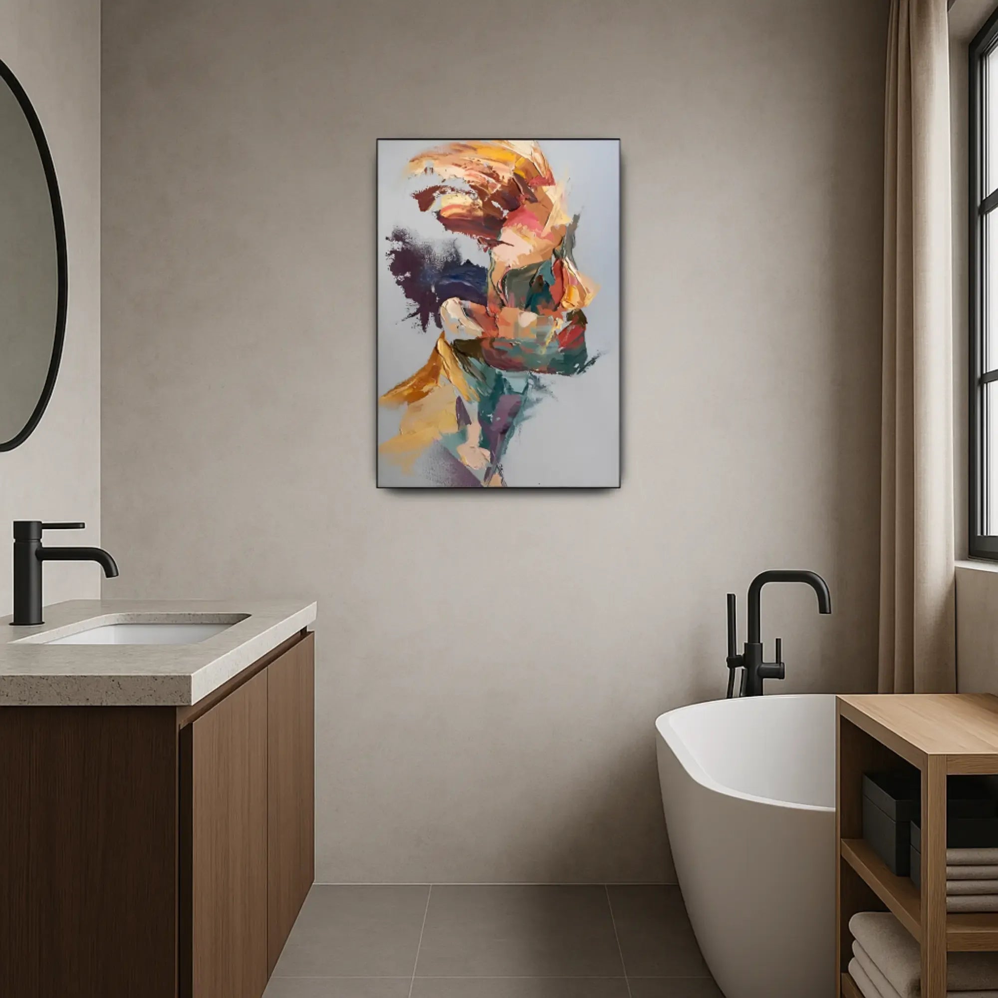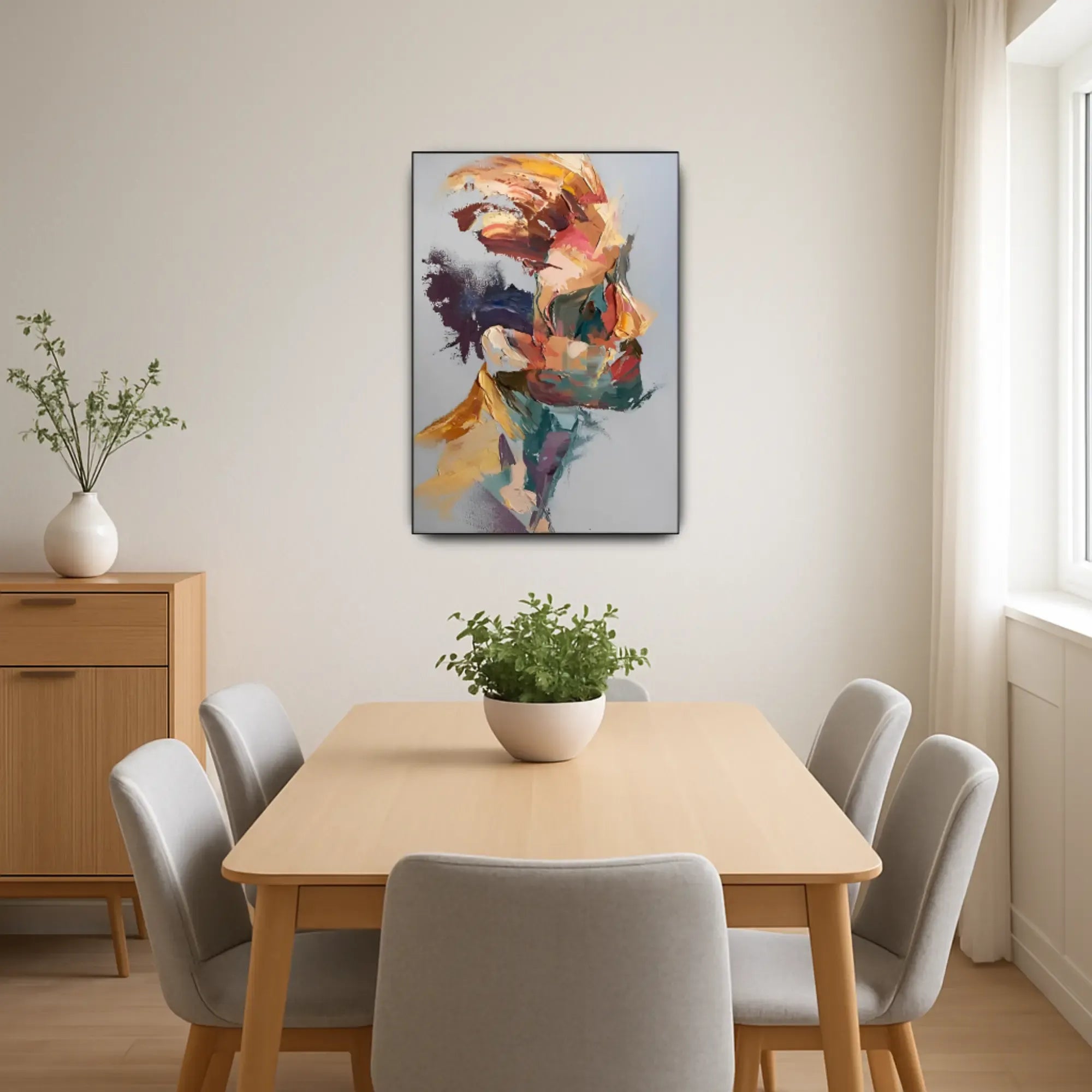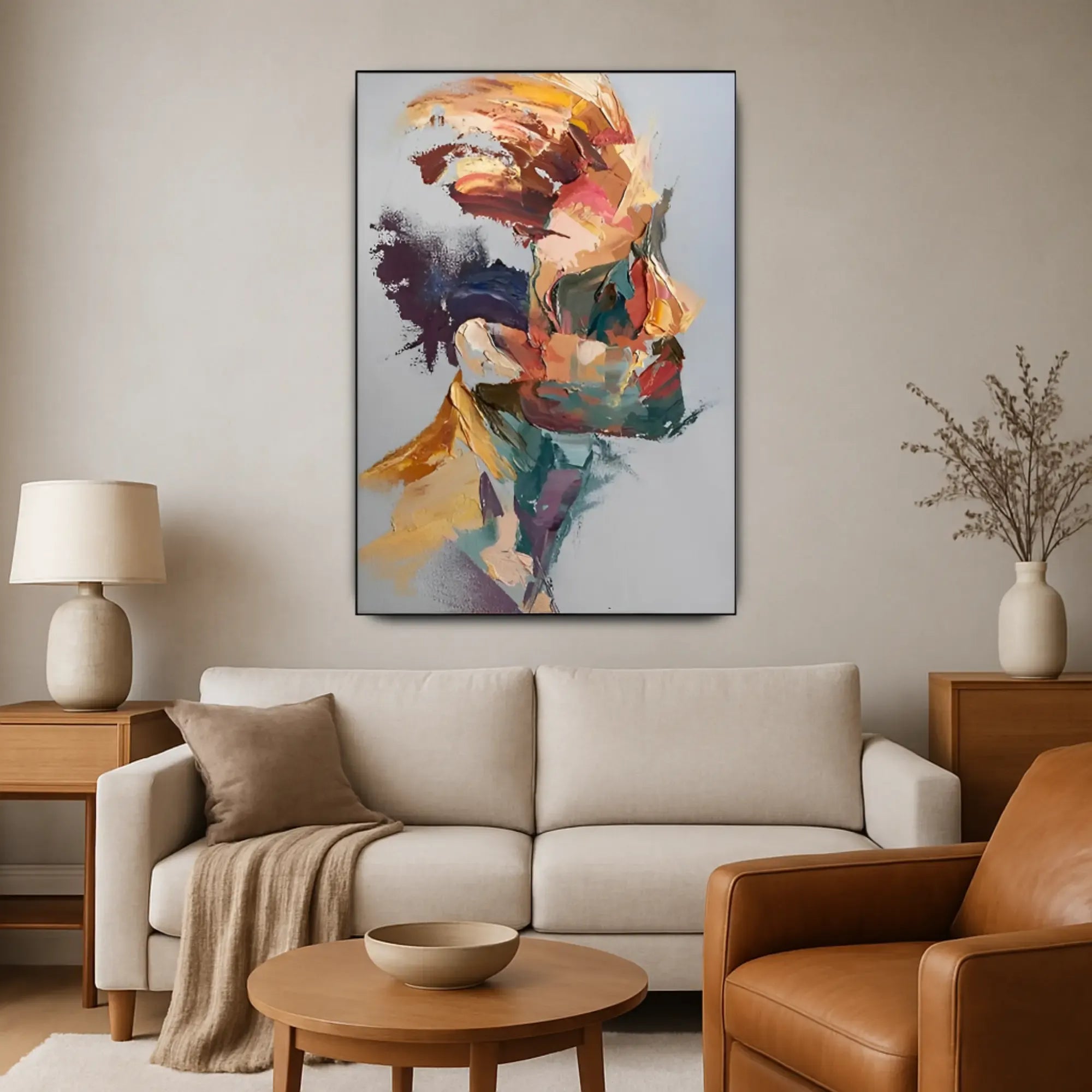 Künstler: DWD TeamTechnik: Öl und Acryl auf Leinwand mit Spachtel- und Lasurtechnik, pastos und impulsiv ausgeführtStil: Abstrakter Expressionismus / Fragmentiertes PorträtFarbgebung: Intensives Zusammenspiel aus Hauttönen, Dunkelviolett, Petrol, Siena, Koralle, Senfgelb und Türkis – lebendig geschichtet in bewegter StrukturMotiv: Fragmentierte Profilansicht eines menschlichen Gesichts – erkennbar, aber abstrahiert durch gestische Farbflächen, die Emotion statt Physiognomie zeigen
