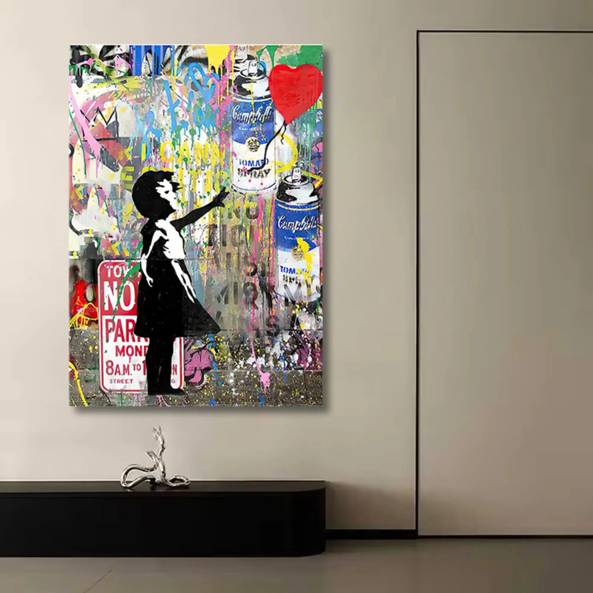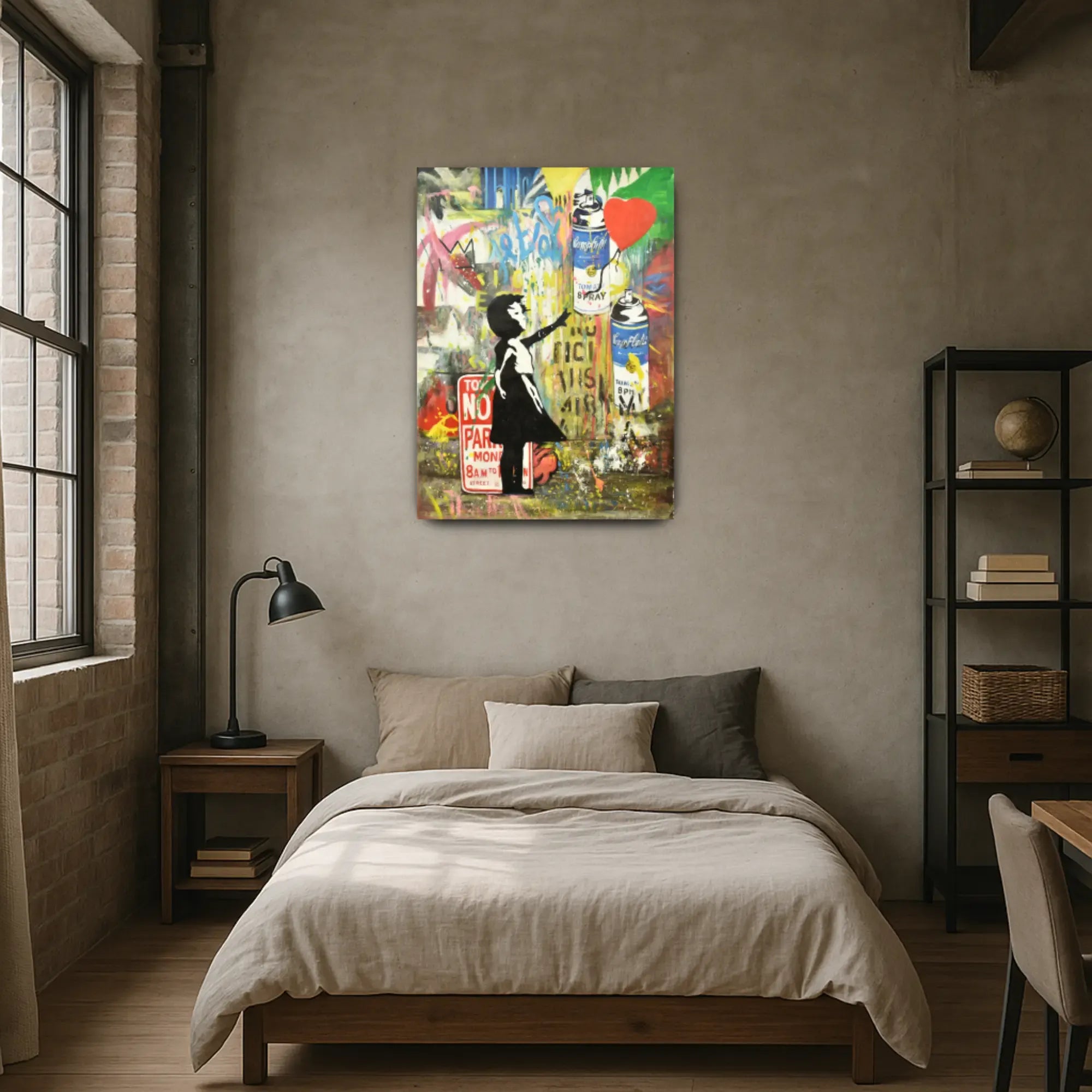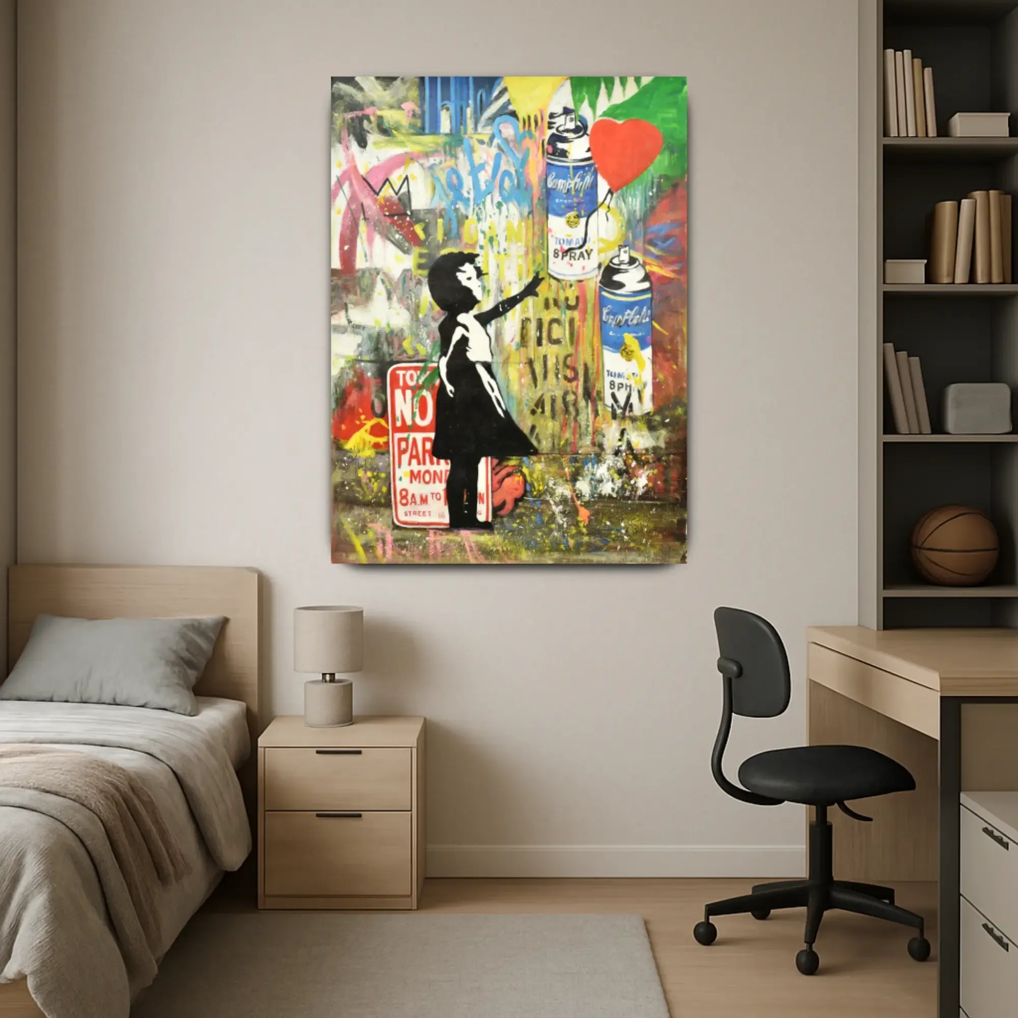 Künstler: DWD TeamTechnik: Acryl, Spraypaint & Stencil auf LeinwandStil: Urban Art / Street Art / Neo-PopFarbgebung: Kräftige Kontraste in Rot, Gelb, Blau, Schwarz, Weiß, Grün und Neonakzenten – typische Graffiti-Ästhetik mit dynamischer CollagewirkungMotiv: Mädchen mit Ballon, Spraydosen, Graffiti-Schriftzüge (LOVE, NO PARKING, FREEDOM)