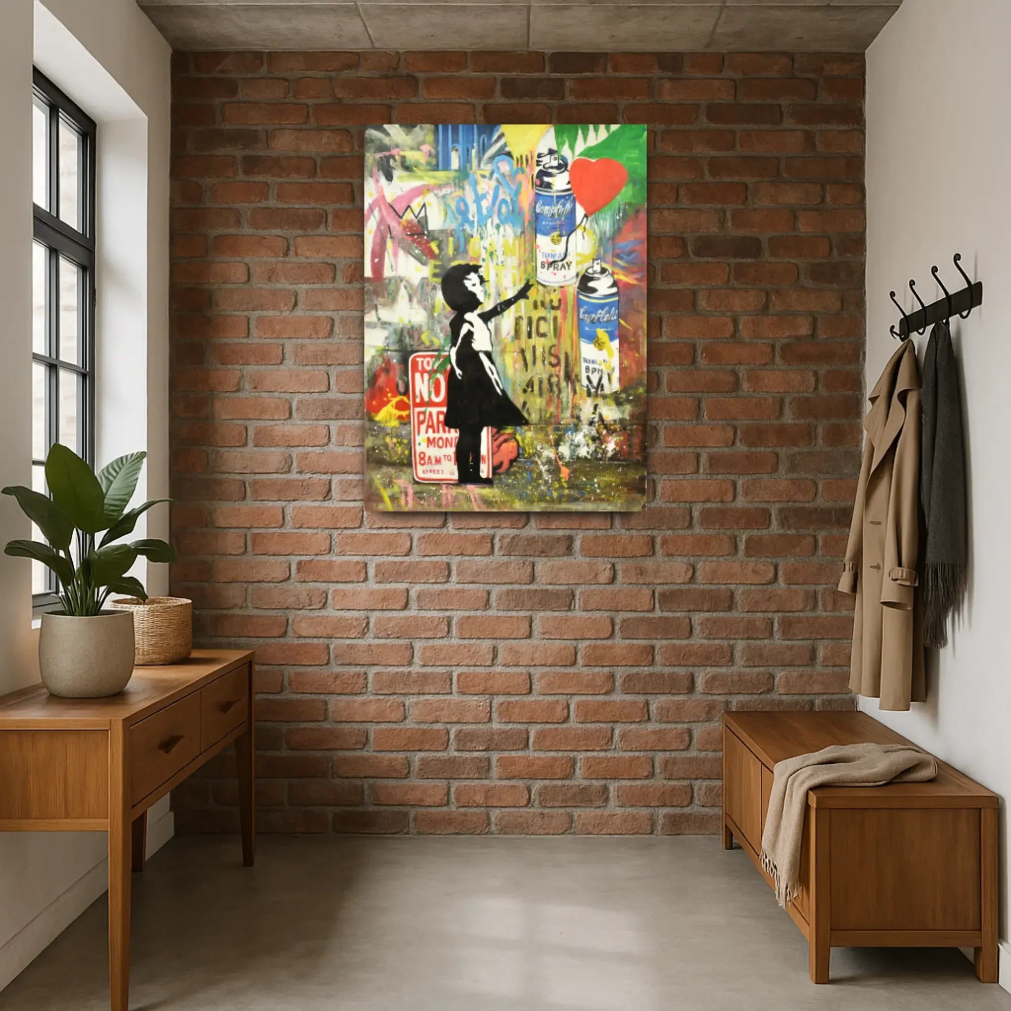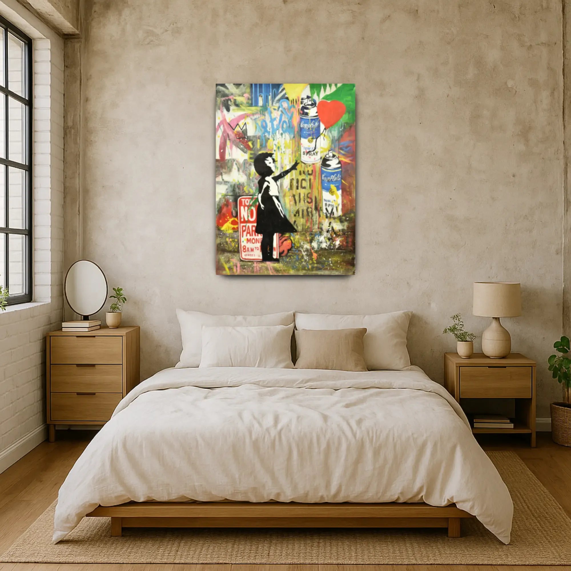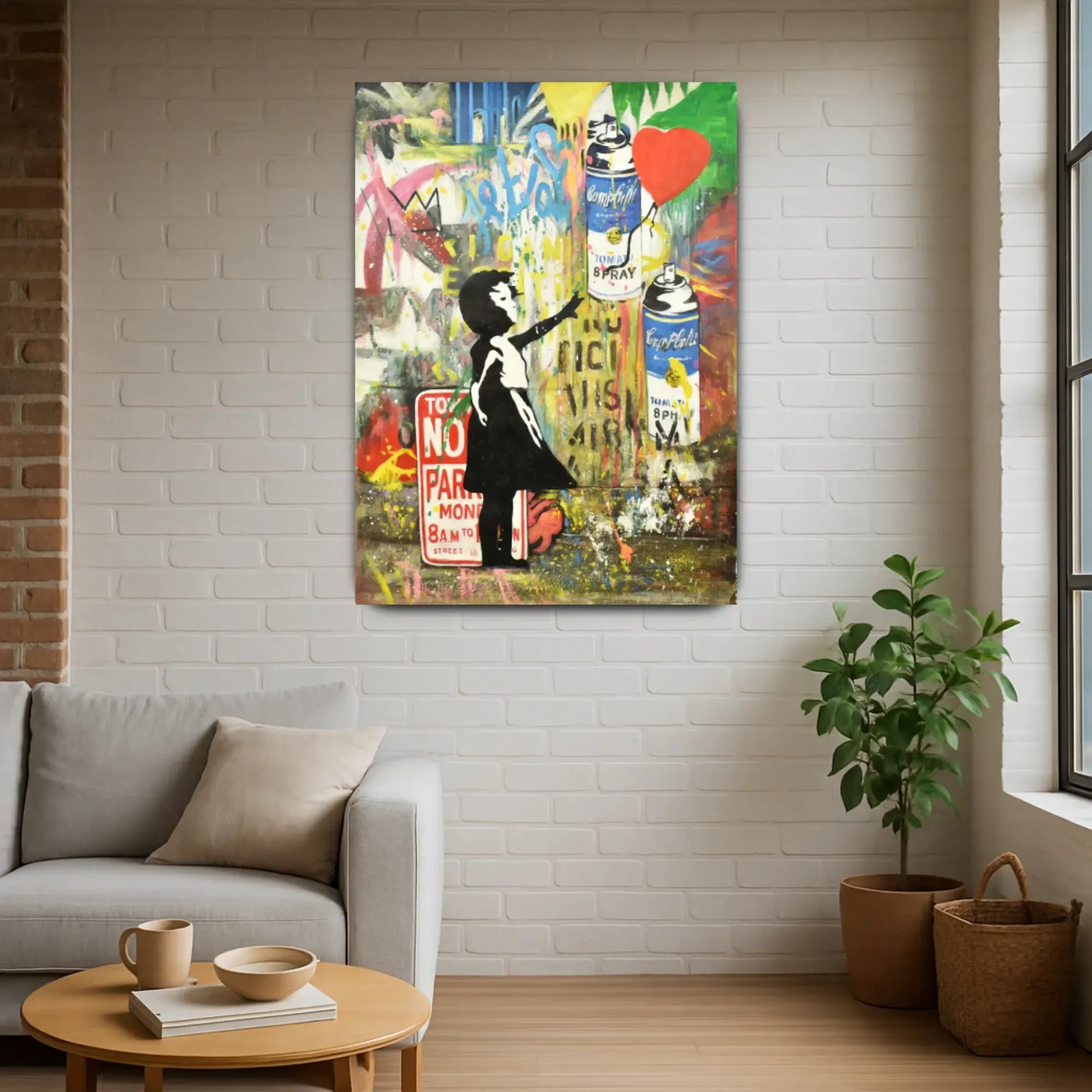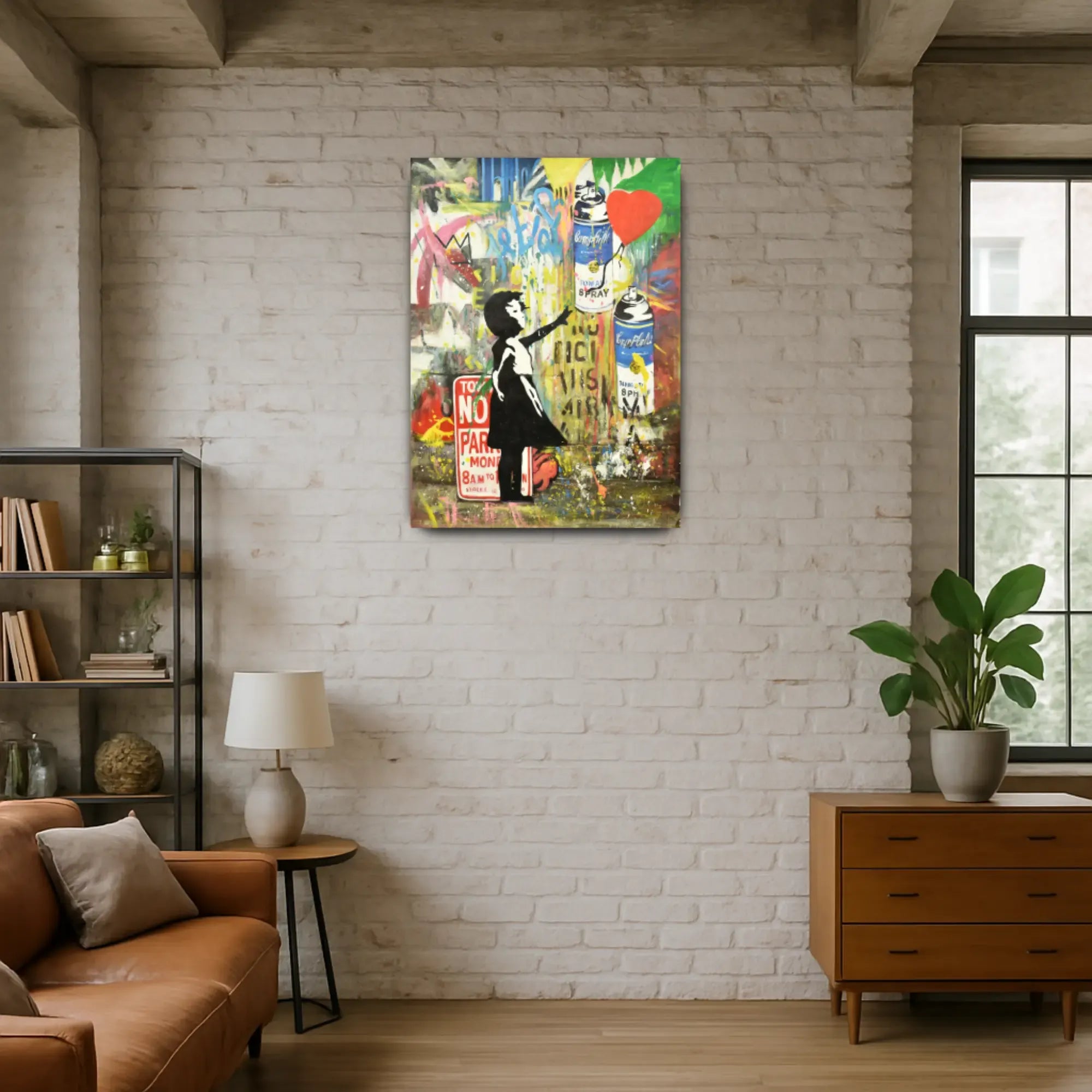 Künstler: DWD TeamTechnik: Acryl, Spraypaint & Stencil auf LeinwandStil: Urban Art / Street Art / Neo-PopFarbgebung: Kräftige Kontraste in Rot, Gelb, Blau, Schwarz, Weiß, Grün und Neonakzenten – typische Graffiti-Ästhetik mit dynamischer CollagewirkungMotiv: Mädchen mit Ballon, Spraydosen, Graffiti-Schriftzüge (LOVE, NO PARKING, FREEDOM)