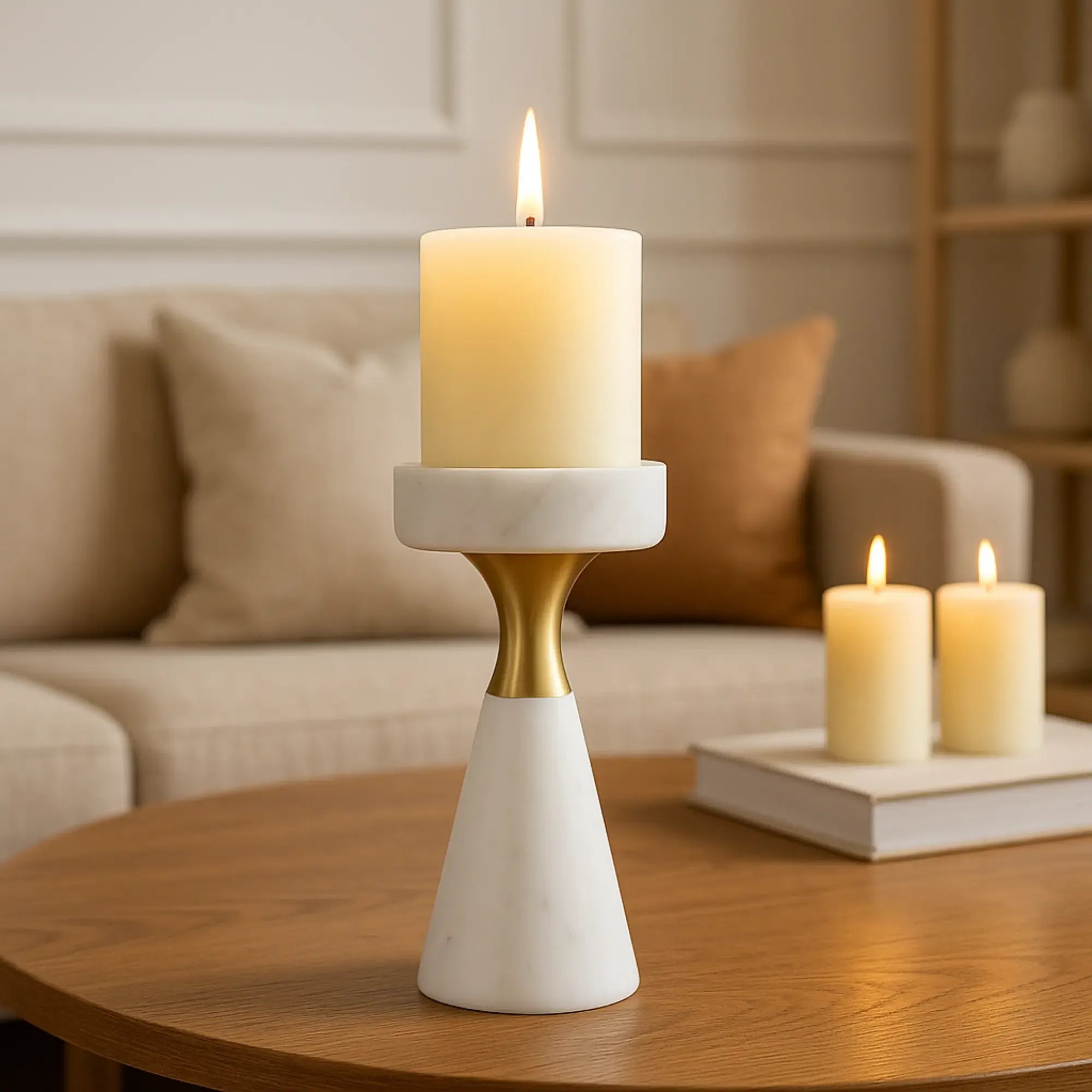 Kerzenhalter aus Marmor und Aluminium, stilvolles Wohnaccessoire, elegantes Dekoelement, hochwertig verarbeitet, passt zu allen Dekoideen, auch als exklusives Einweihungsgeschenk oder Geschenkidee für Designliebhaber.