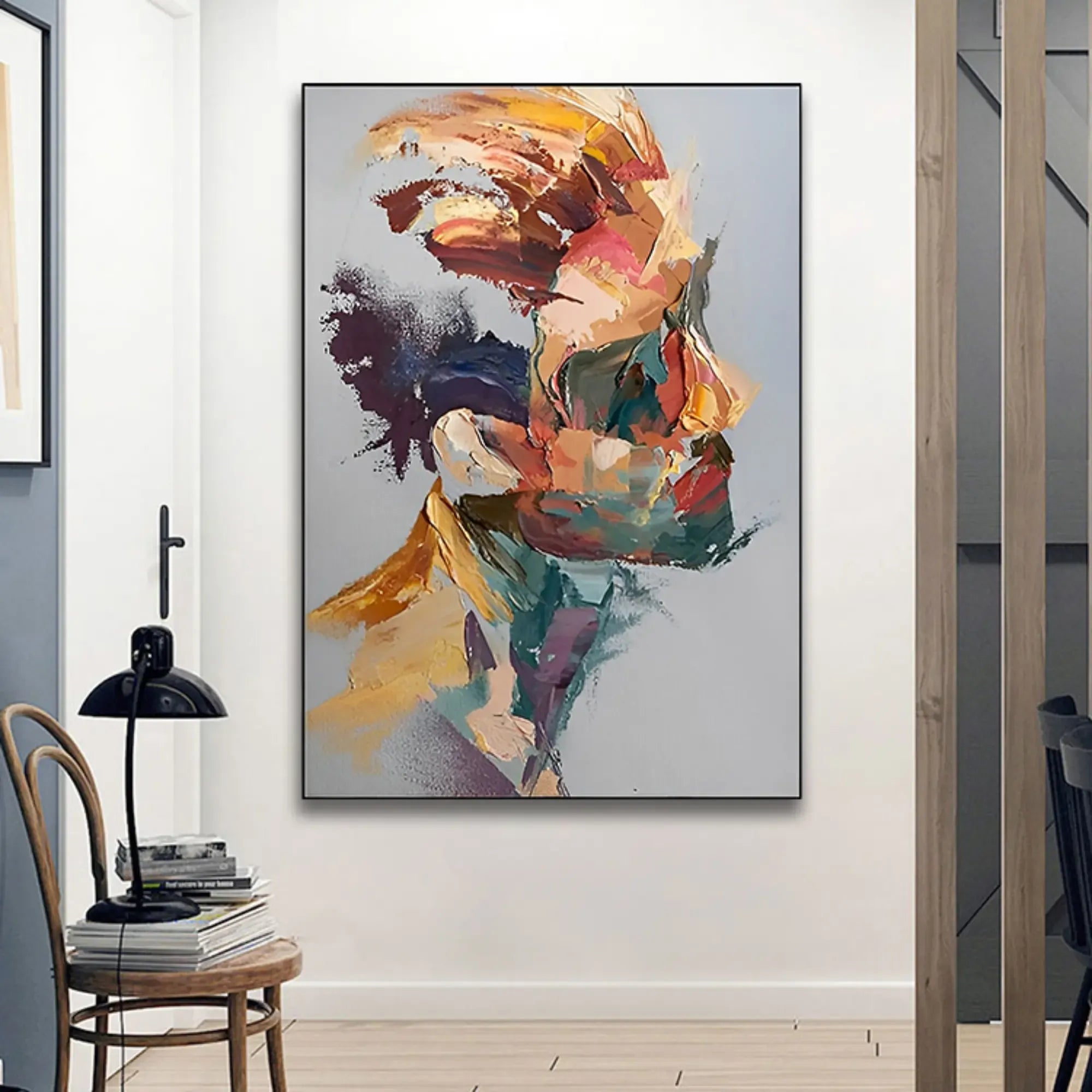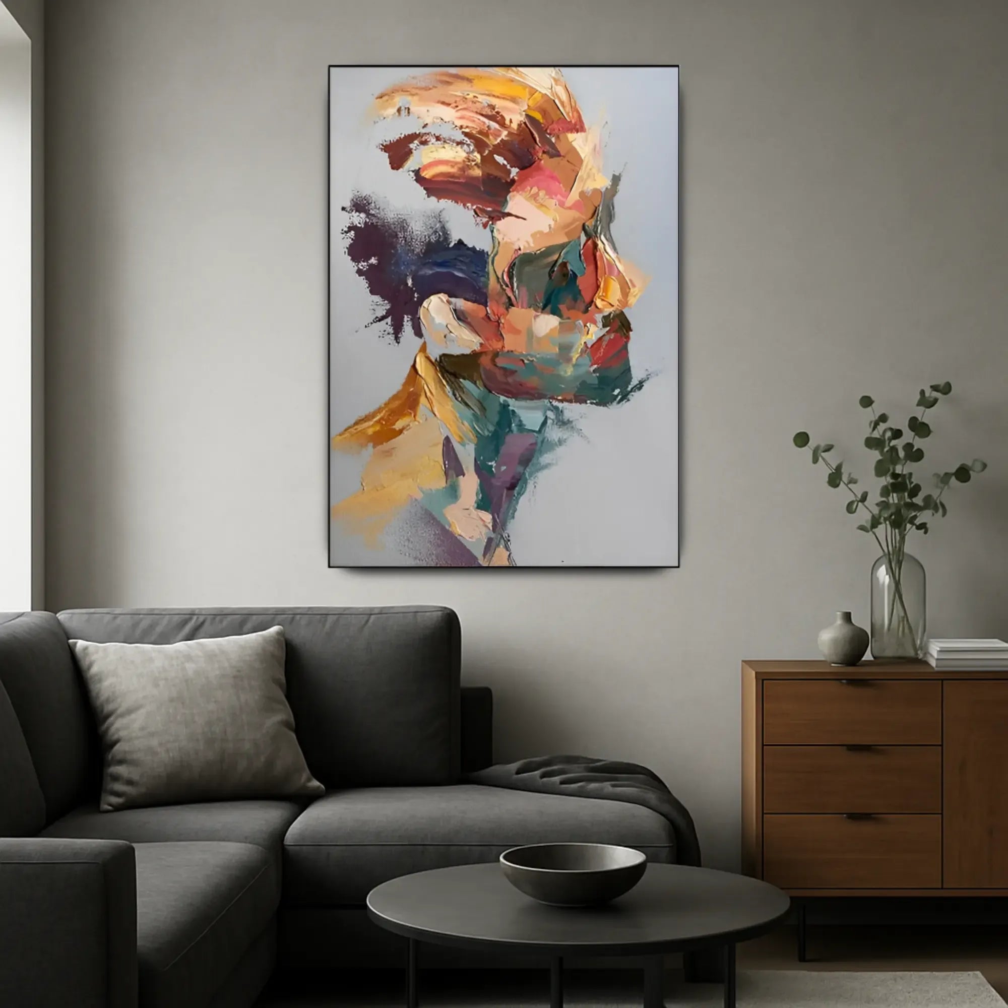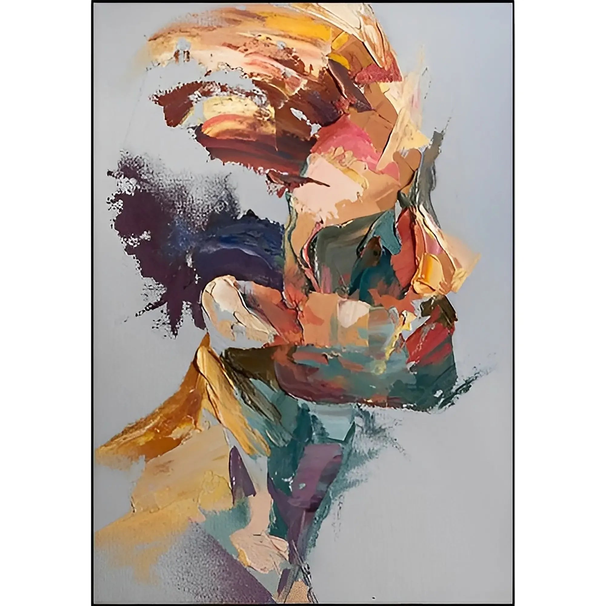 Künstler: DWD TeamTechnik: Öl und Acryl auf Leinwand mit Spachtel- und Lasurtechnik, pastos und impulsiv ausgeführtStil: Abstrakter Expressionismus / Fragmentiertes PorträtFarbgebung: Intensives Zusammenspiel aus Hauttönen, Dunkelviolett, Petrol, Siena, Koralle, Senfgelb und Türkis – lebendig geschichtet in bewegter StrukturMotiv: Fragmentierte Profilansicht eines menschlichen Gesichts – erkennbar, aber abstrahiert durch gestische Farbflächen, die Emotion statt Physiognomie zeigen