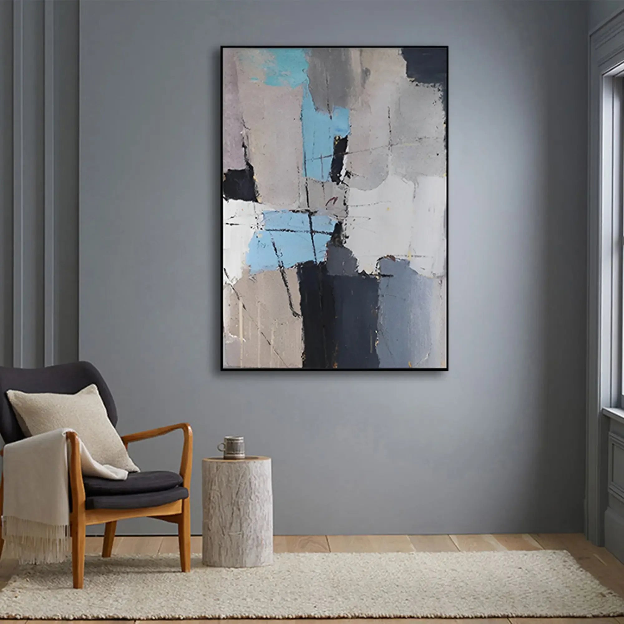 Ein kraftvoll-urbanes Originalgemälde in abstrahierender Formensprache – geometrisch fragmentiert und voller haptischer Präsenz. Die Komposition besteht aus kantigen Flächen in Schiefergrau, Taubenblau, gebrochenem Weiß und hellem Beige, durchzogen von feinen Linien, Rissen und Überlagerungen. Die Oberfläche wirkt wie eine verwitterte Mauer – roh, archaisch, ehrlich.