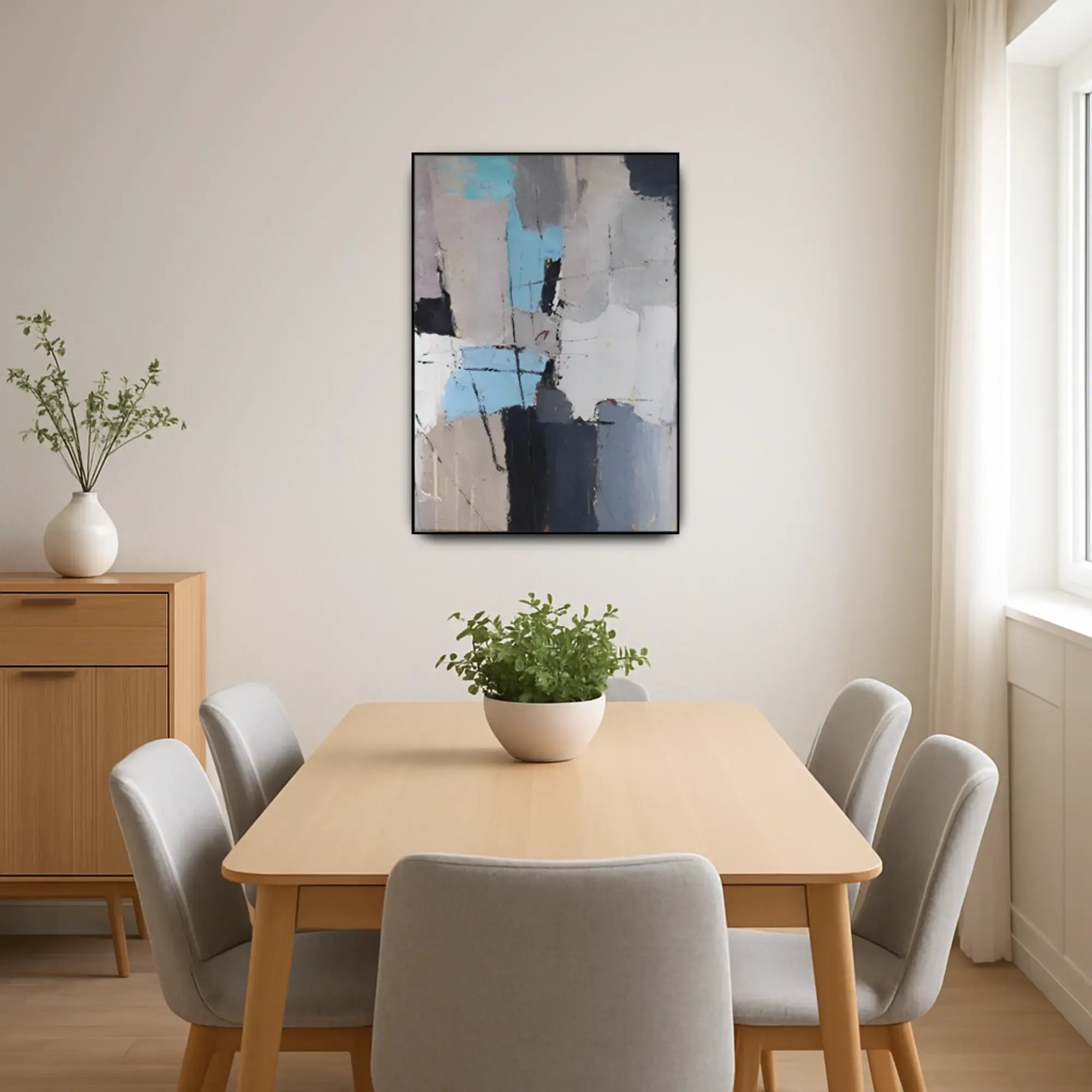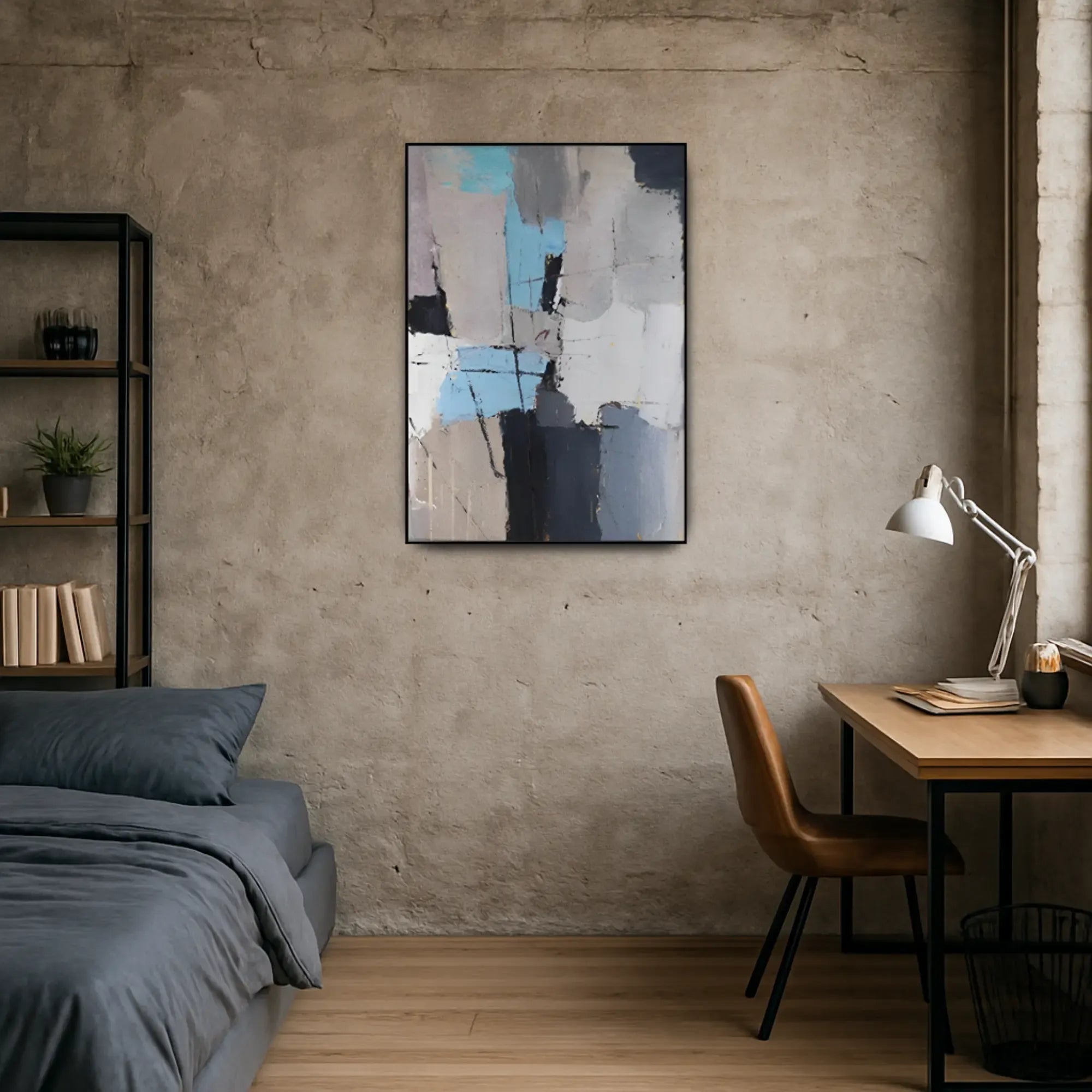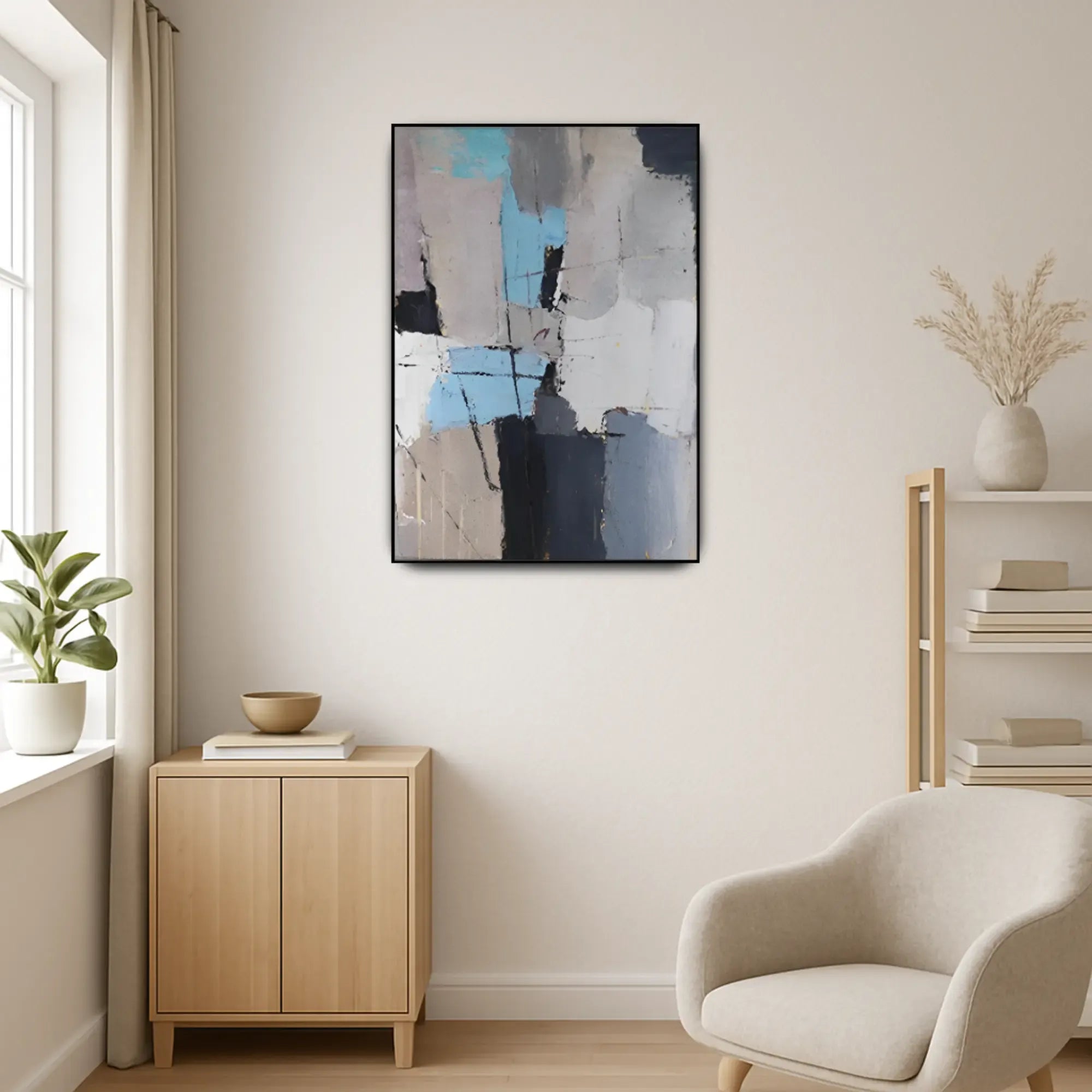 Trotz der Strenge im Aufbau strahlt das Bild emotionale Tiefe aus: Wie ein architektonisches Palimpsest offenbart es Spuren, Übermalungen und Einschreibungen. Die kühlen Farbtöne schaffen Ruhe, während feine Risse und Schattenlinien das Auge in Bewegung halten – ein stiller Dialog zwischen Fläche, Struktur und Intuition.