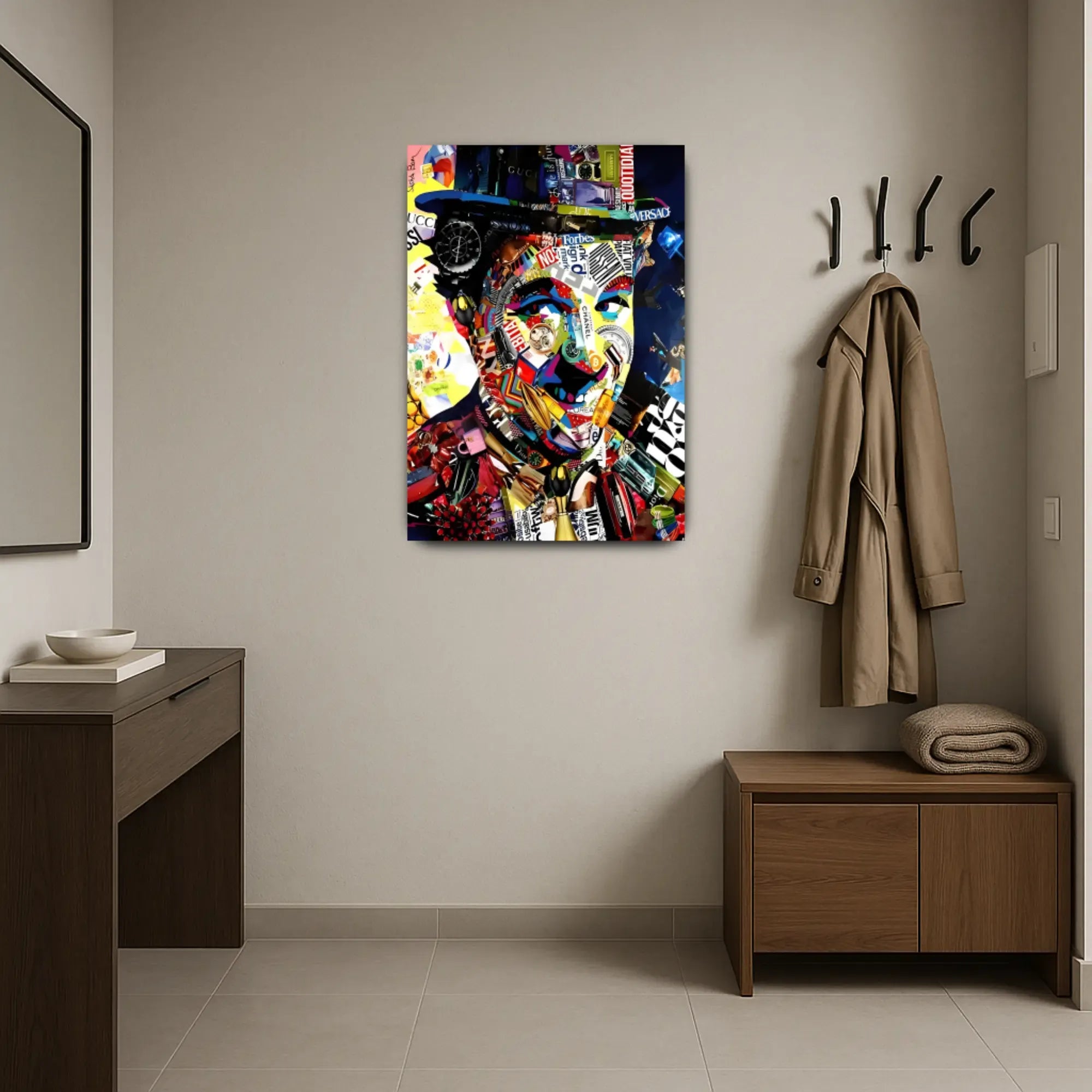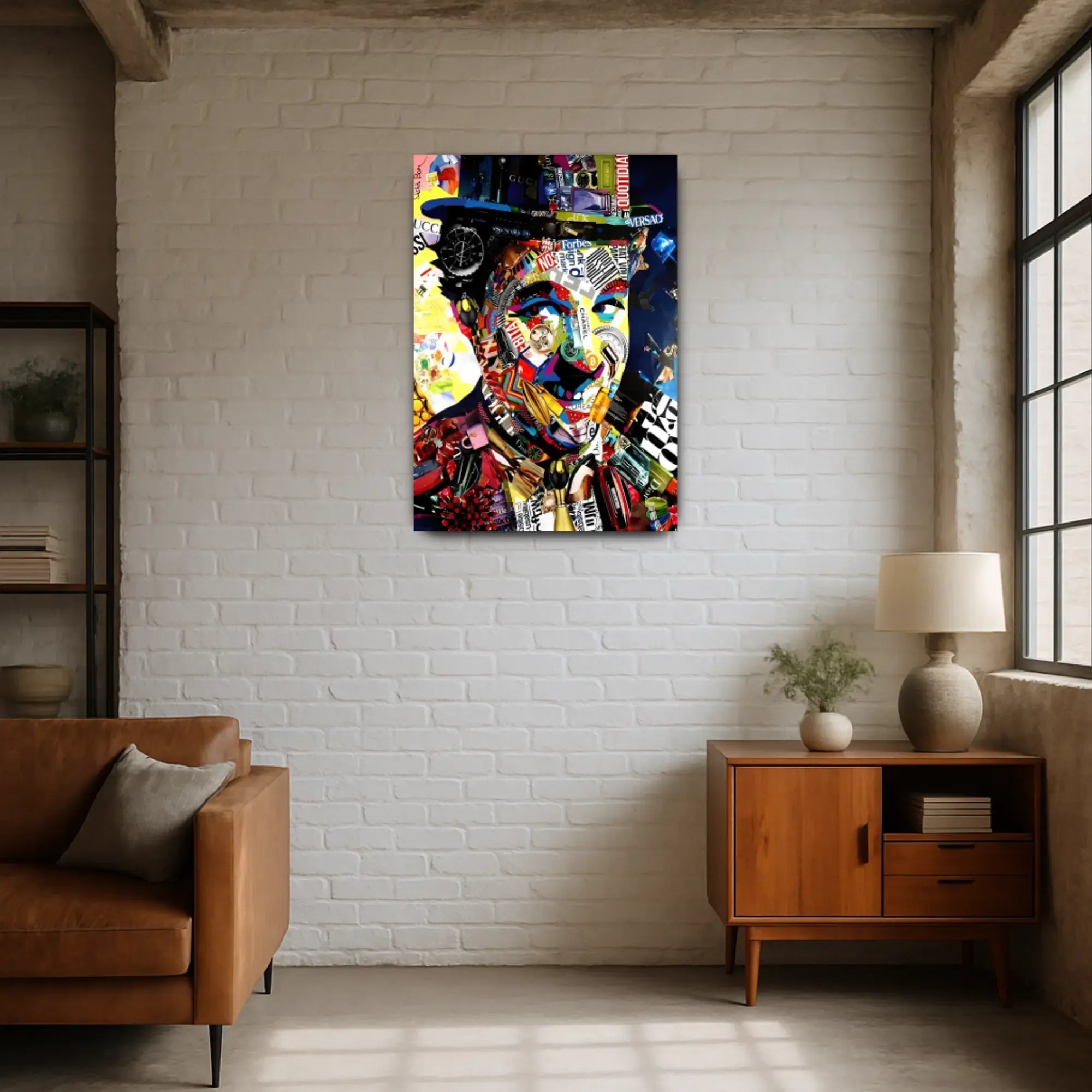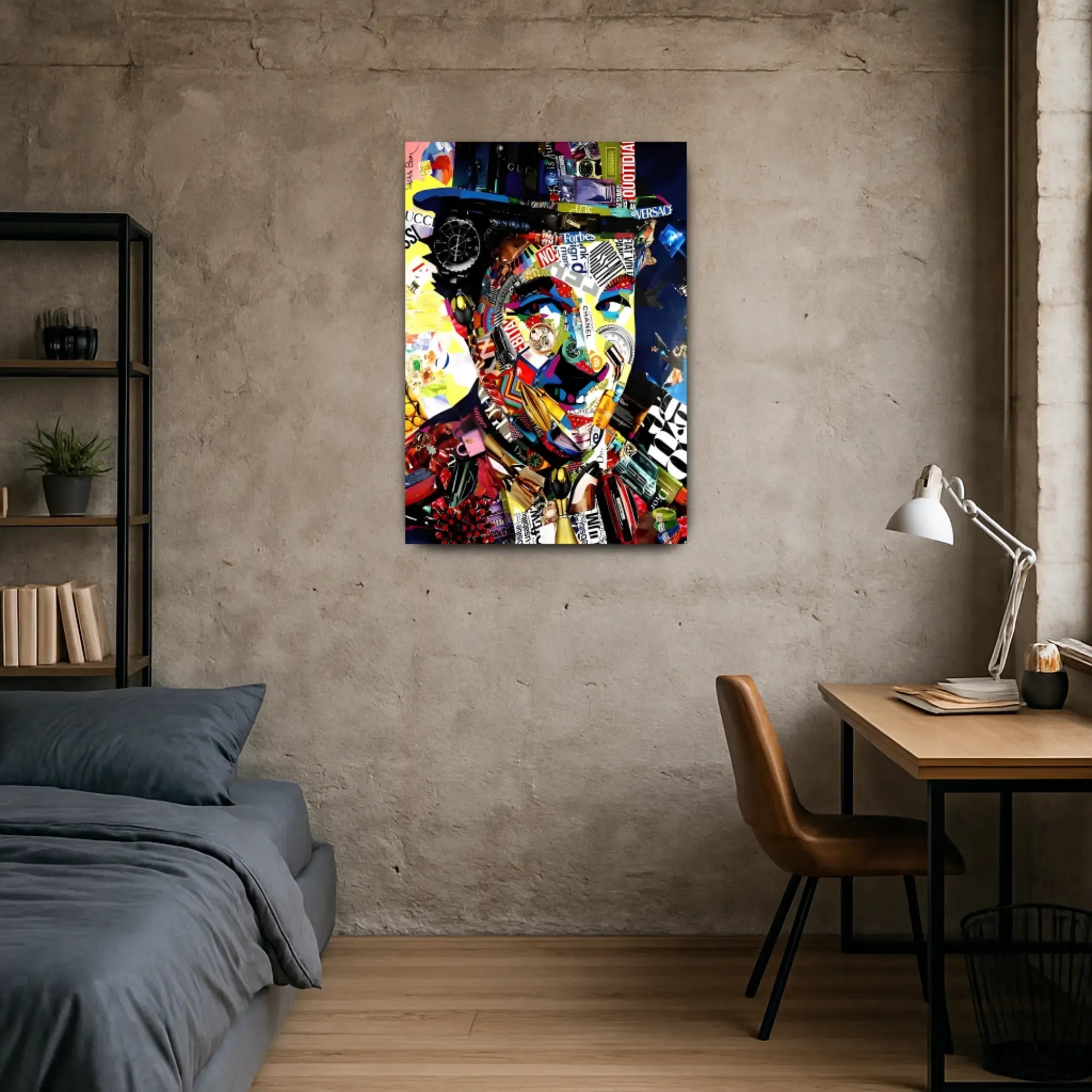 Das Gesicht entsteht aus ikonischen Markenzeichen: Rolex, Gucci, Chanel, Dior, Bitcoin und Versace – allesamt symmetrisch zu einem charismatischen Konterfei verwoben. Luxus, Statussymbole und Markenidentitäten verschmelzen zu einer ironischen Reflexion moderner Konsumkultur. Die Farbwelt ist laut, grell, plakativ – und dabei hochpräzise arrangiert.