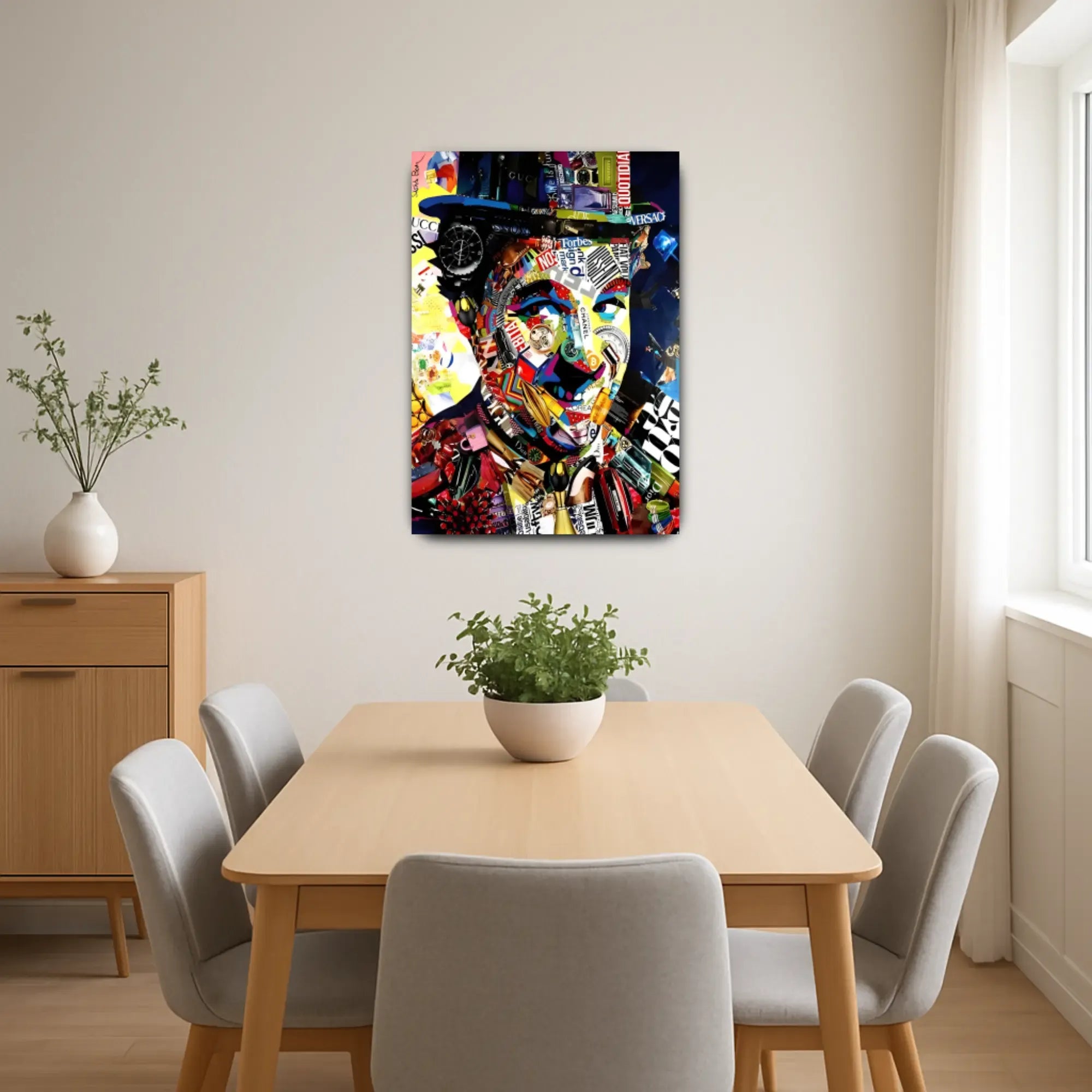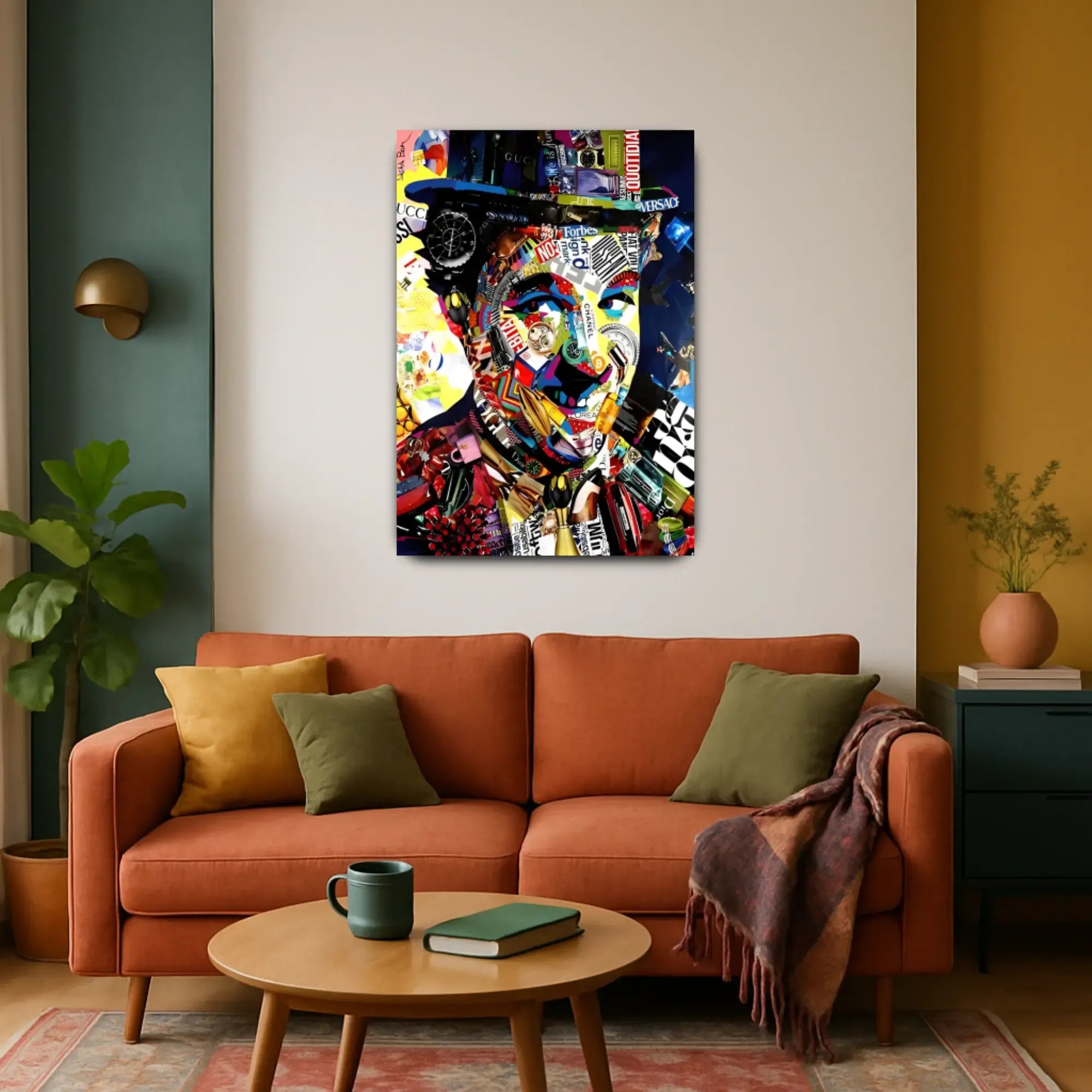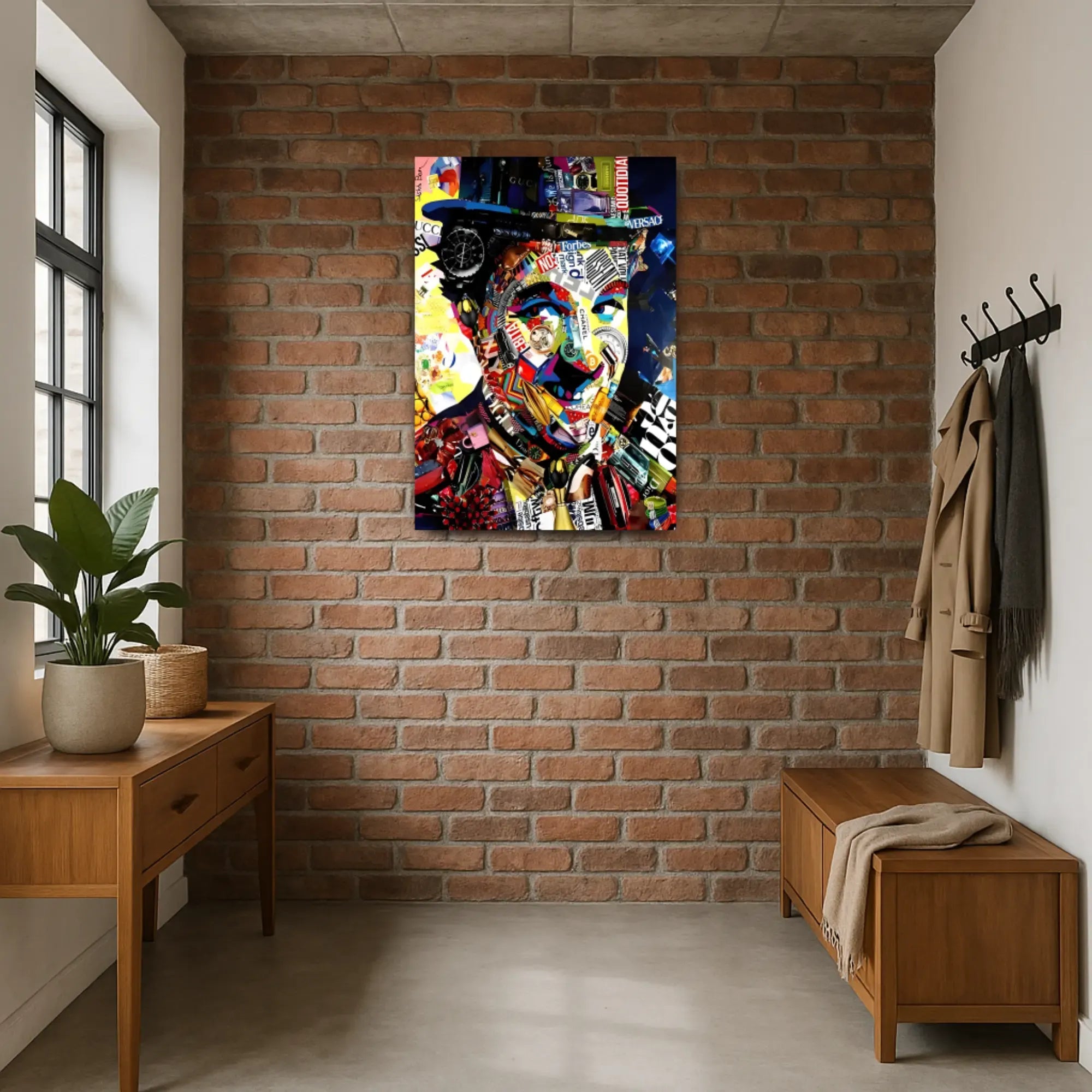 Das Gesicht entsteht aus ikonischen Markenzeichen: Rolex, Gucci, Chanel, Dior, Bitcoin und Versace – allesamt symmetrisch zu einem charismatischen Konterfei verwoben. Luxus, Statussymbole und Markenidentitäten verschmelzen zu einer ironischen Reflexion moderner Konsumkultur. Die Farbwelt ist laut, grell, plakativ – und dabei hochpräzise arrangiert.