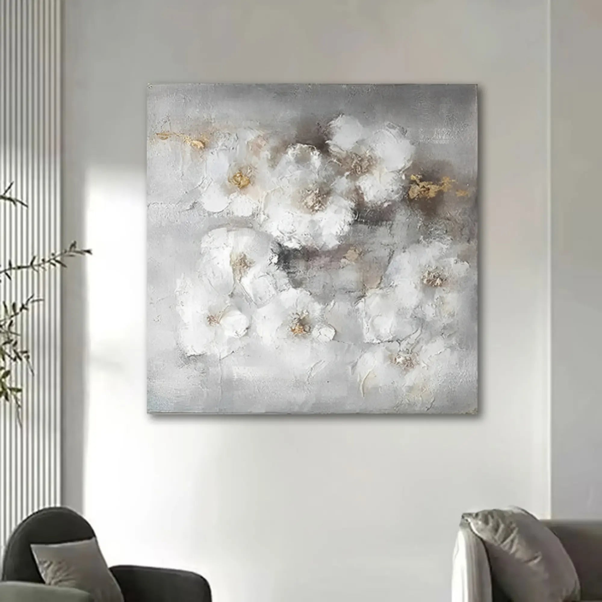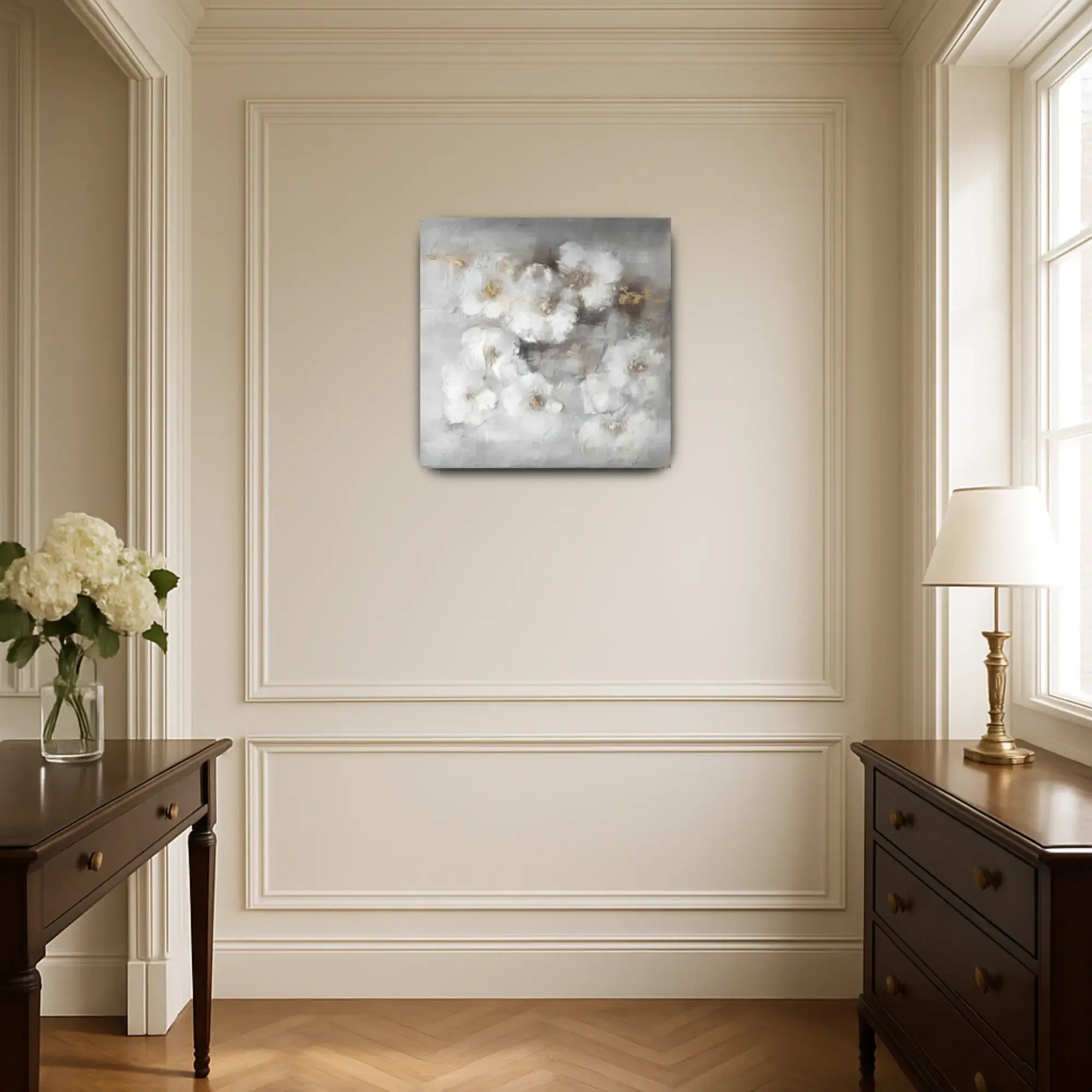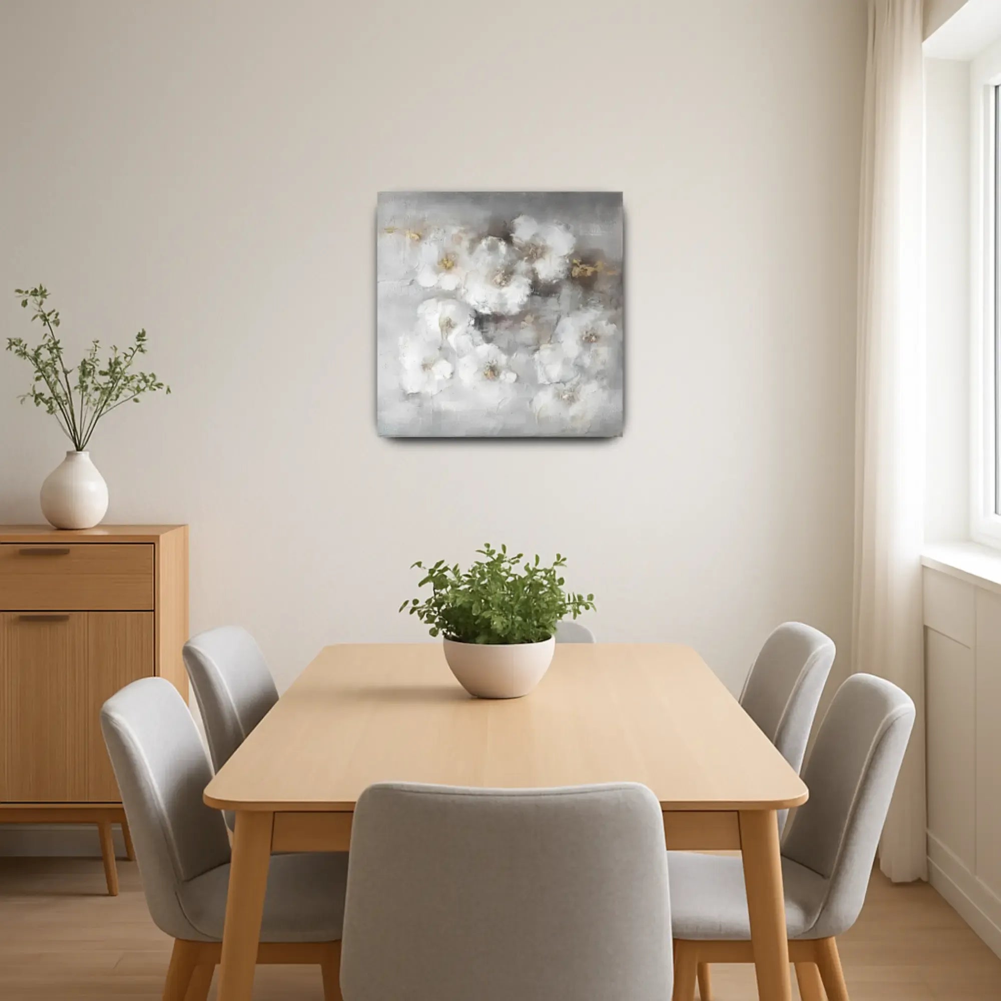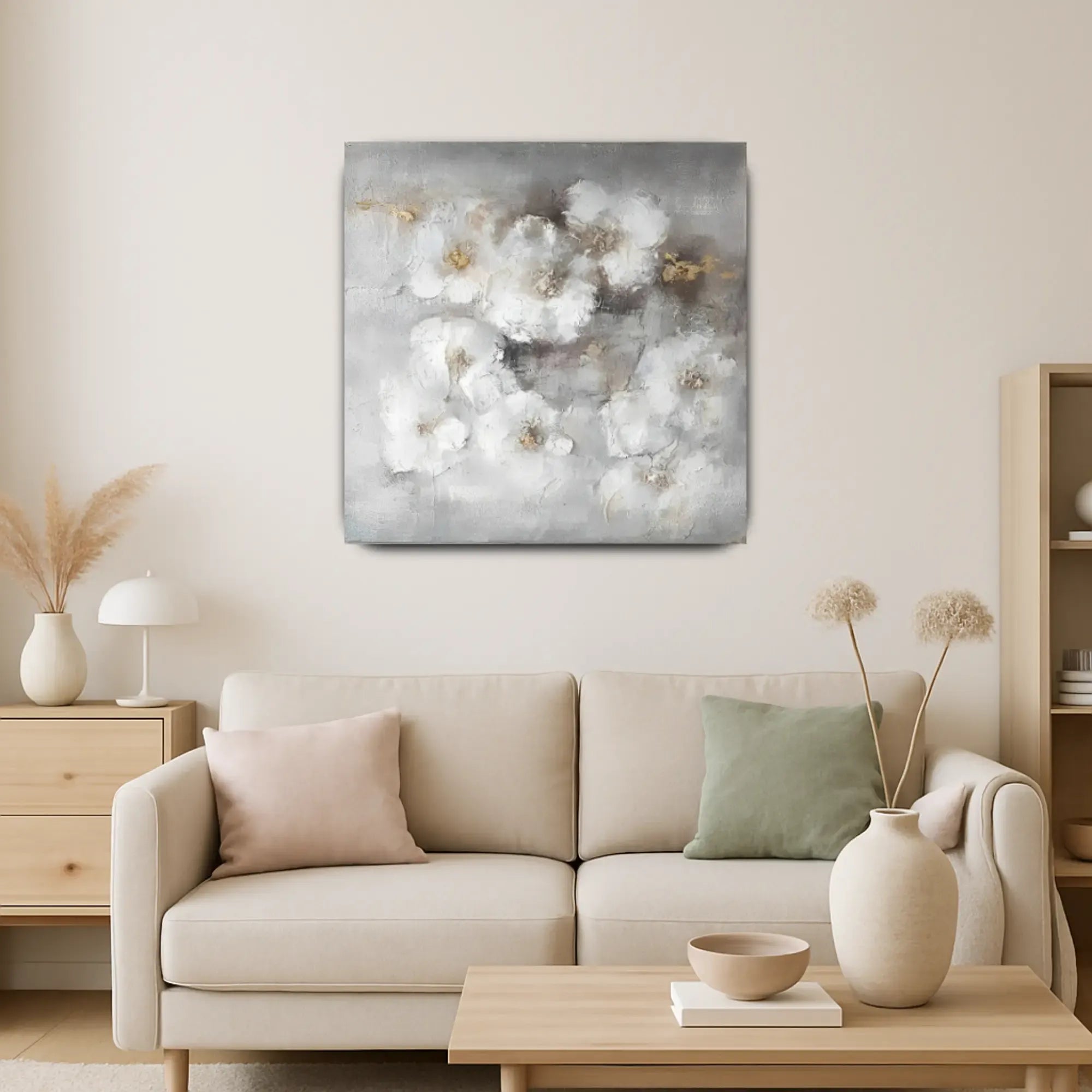 Künstler: DWD TeamTechnik: Mischtechnik auf Leinwand mit Strukturpaste und zarten SpachtelakzentenStil: Abstrakter Floralismus / Zeitgenössischer Textur-ExpressionismusFarbgebung: Zarte Töne aus Nebelweiß, Taubengrau, Beige und Akzenten in Gold – eine sanfte, fast schwebende Farbpalette mit eleganter ZurückhaltungMotiv: Locker abstrahierte Blüten in weicher Streuung, eingebettet in ein nebelhaftes Umfeld – floral angedeutet, aber traumhaft gelöst