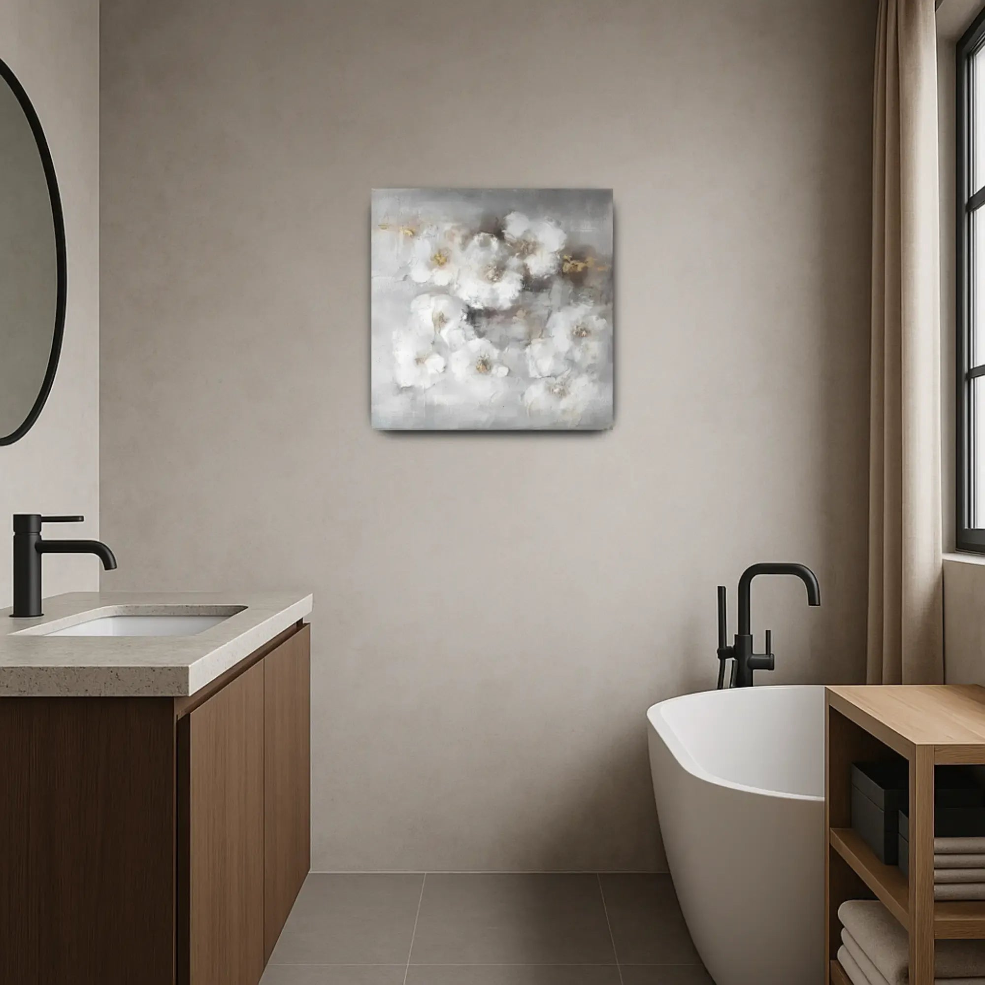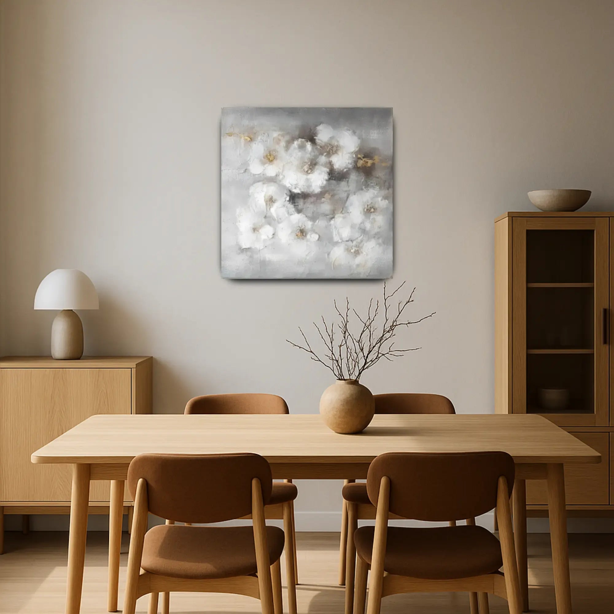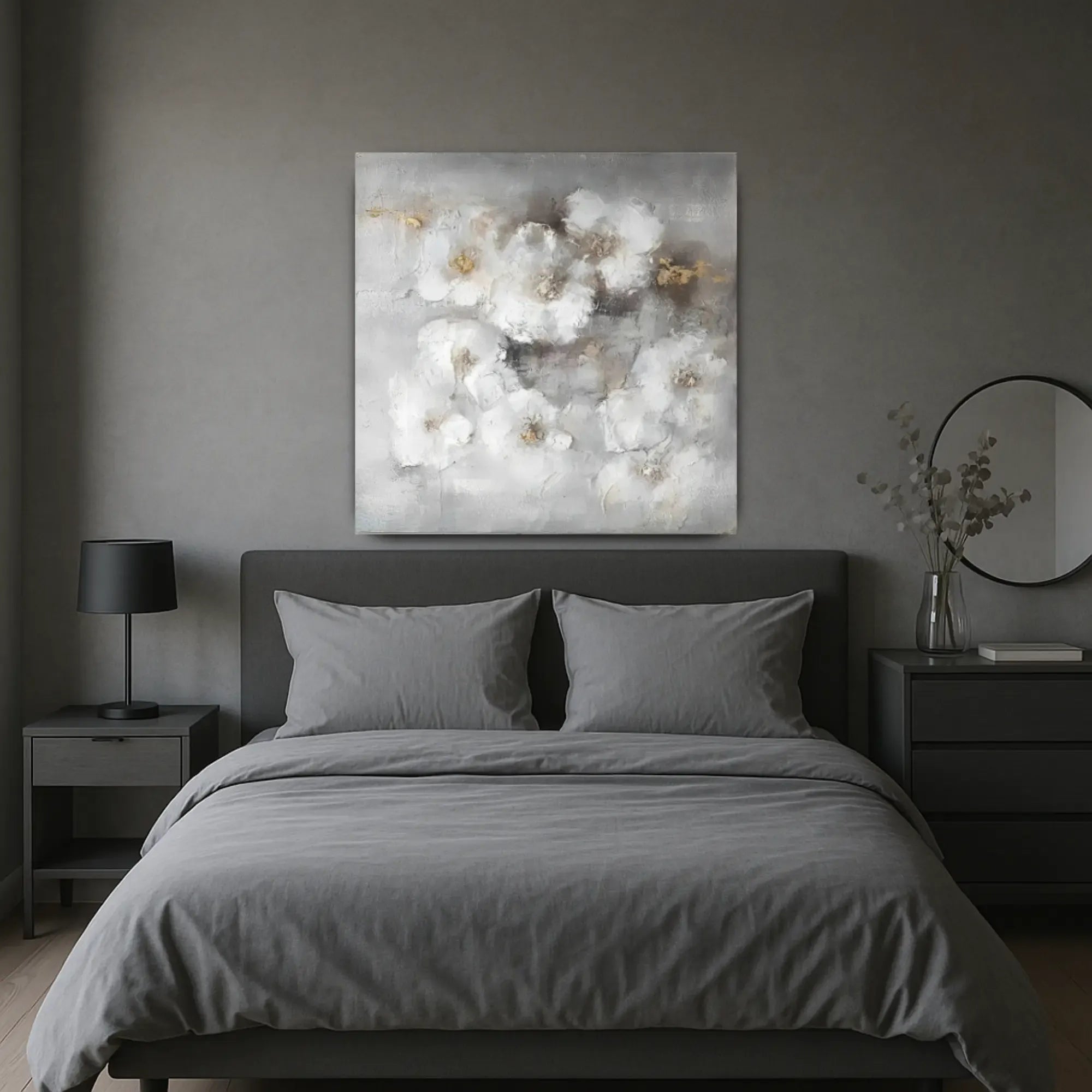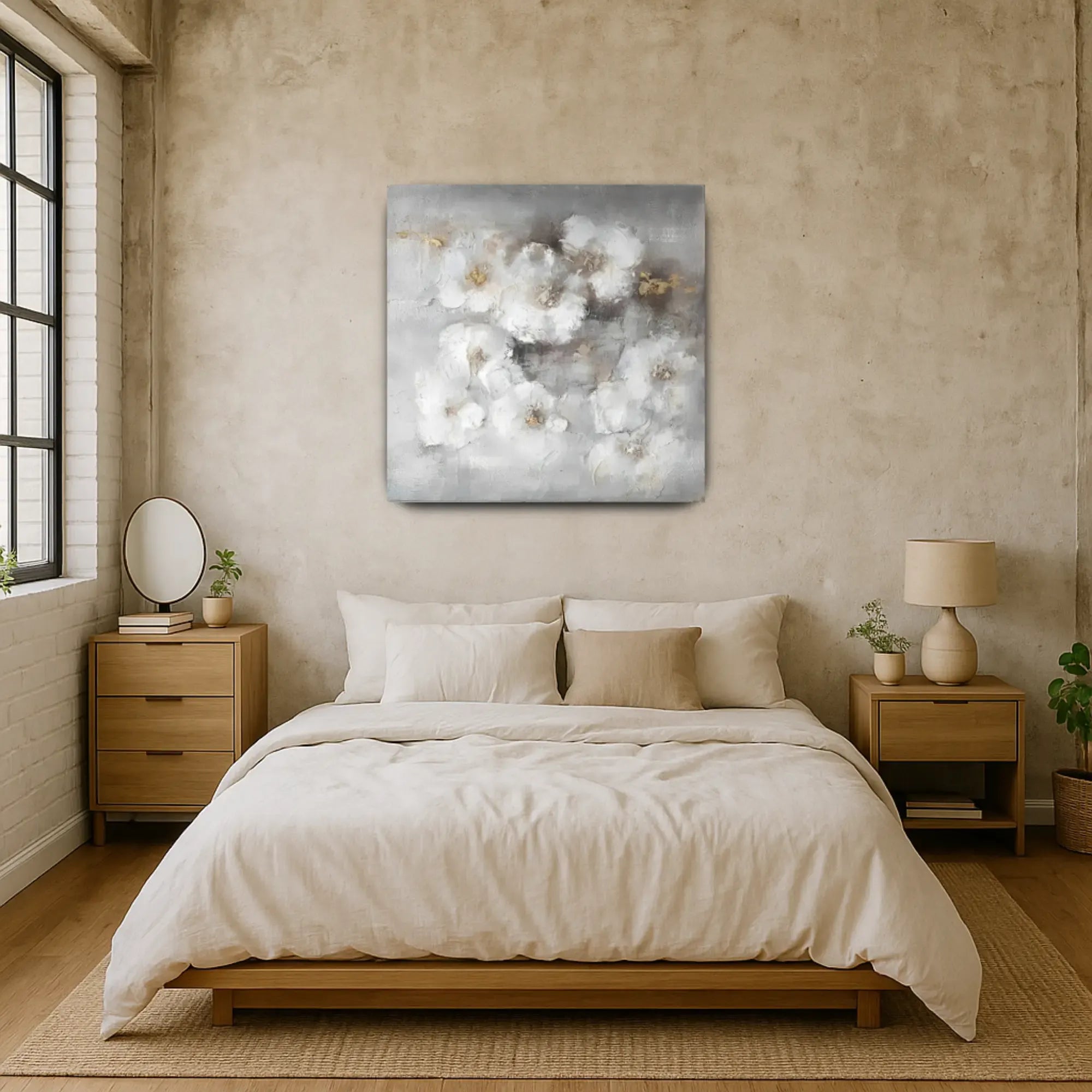 Künstler: DWD TeamTechnik: Mischtechnik auf Leinwand mit Strukturpaste und zarten SpachtelakzentenStil: Abstrakter Floralismus / Zeitgenössischer Textur-ExpressionismusFarbgebung: Zarte Töne aus Nebelweiß, Taubengrau, Beige und Akzenten in Gold – eine sanfte, fast schwebende Farbpalette mit eleganter ZurückhaltungMotiv: Locker abstrahierte Blüten in weicher Streuung, eingebettet in ein nebelhaftes Umfeld – floral angedeutet, aber traumhaft gelöst