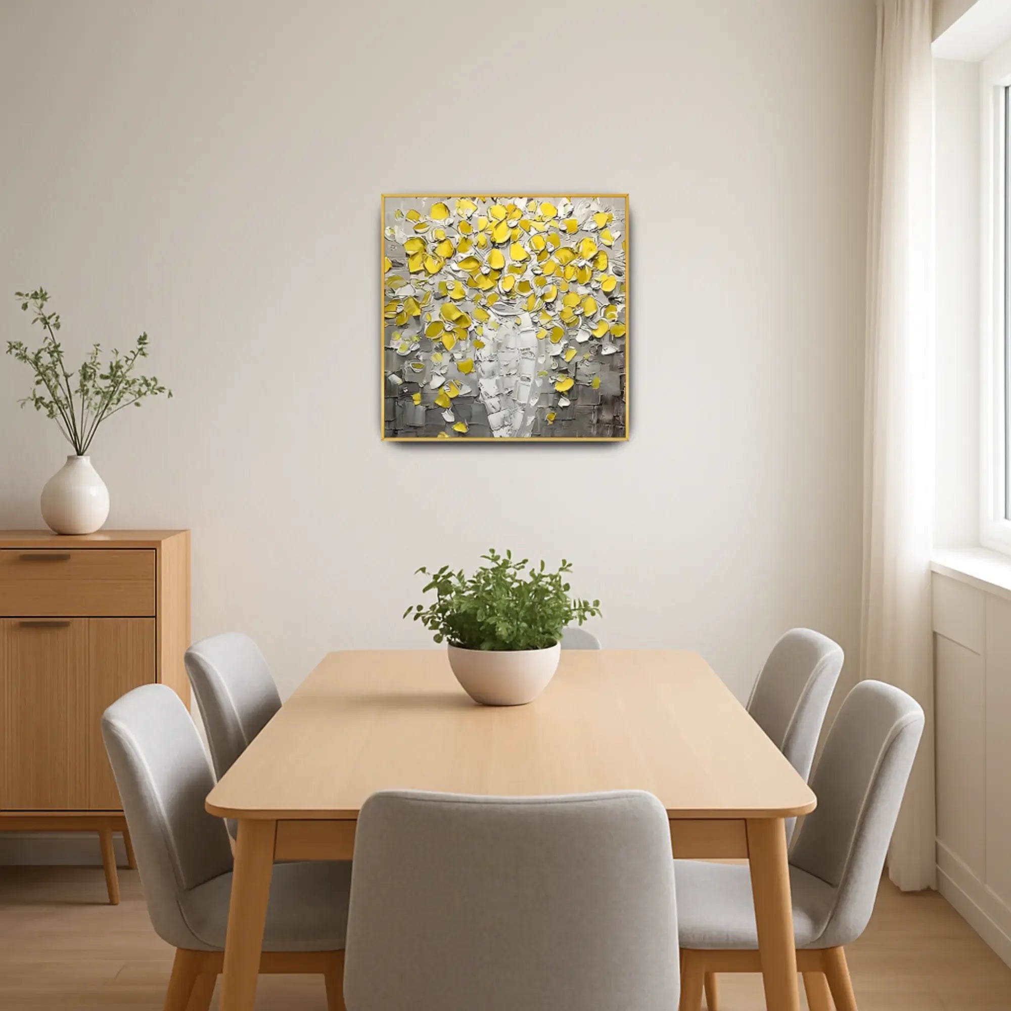 Die Farbgebung ist reduziert und zugleich wirkungsvoll: ein elegantes Spiel aus warmem Sonnengelb, gebrochenem Weiß und kühlem Silbergrau. Der Hintergrund bleibt bewusst dezent, um die leuchtende Energie der floralen Form noch stärker hervorzuheben – ein Dialog zwischen Klarheit und Poesie.