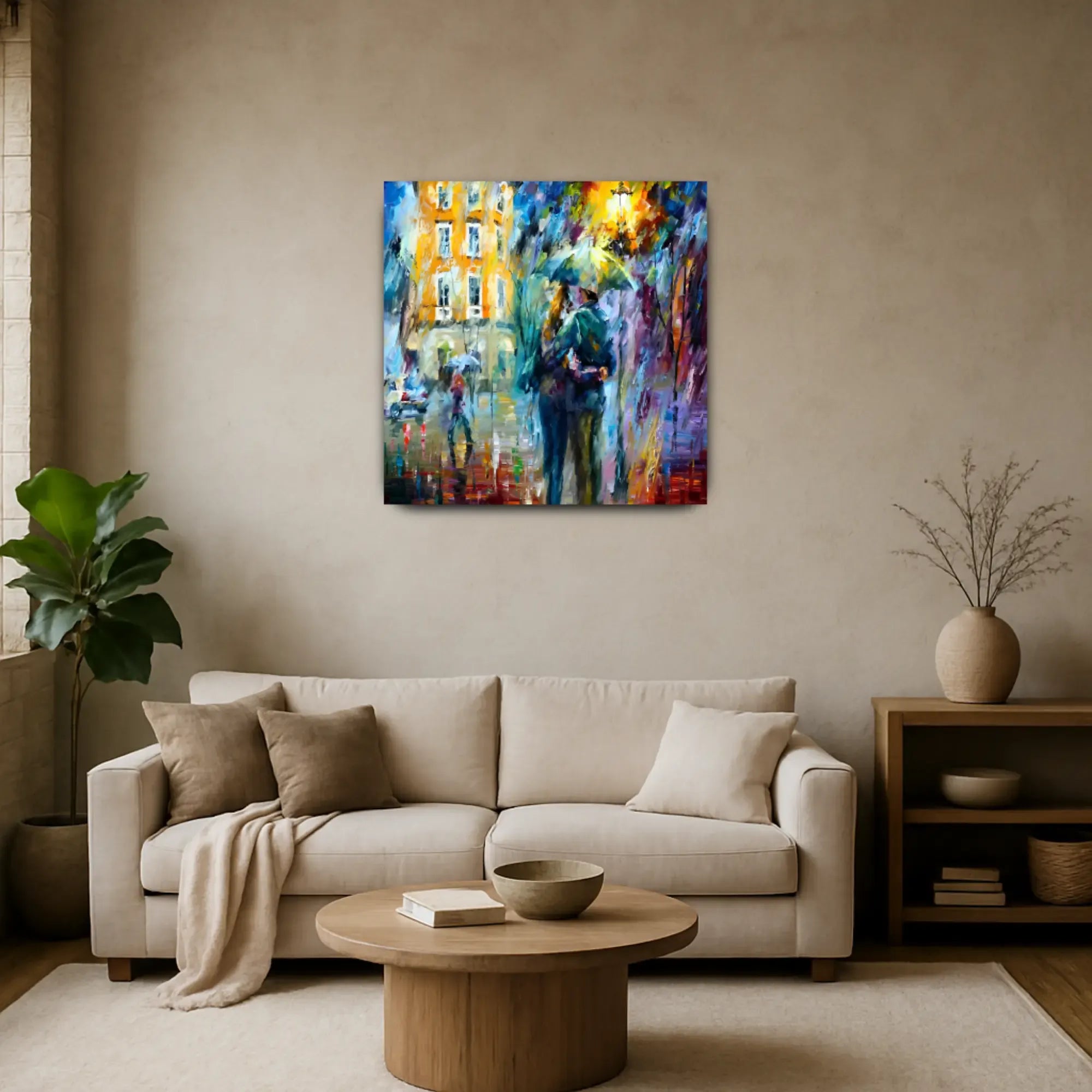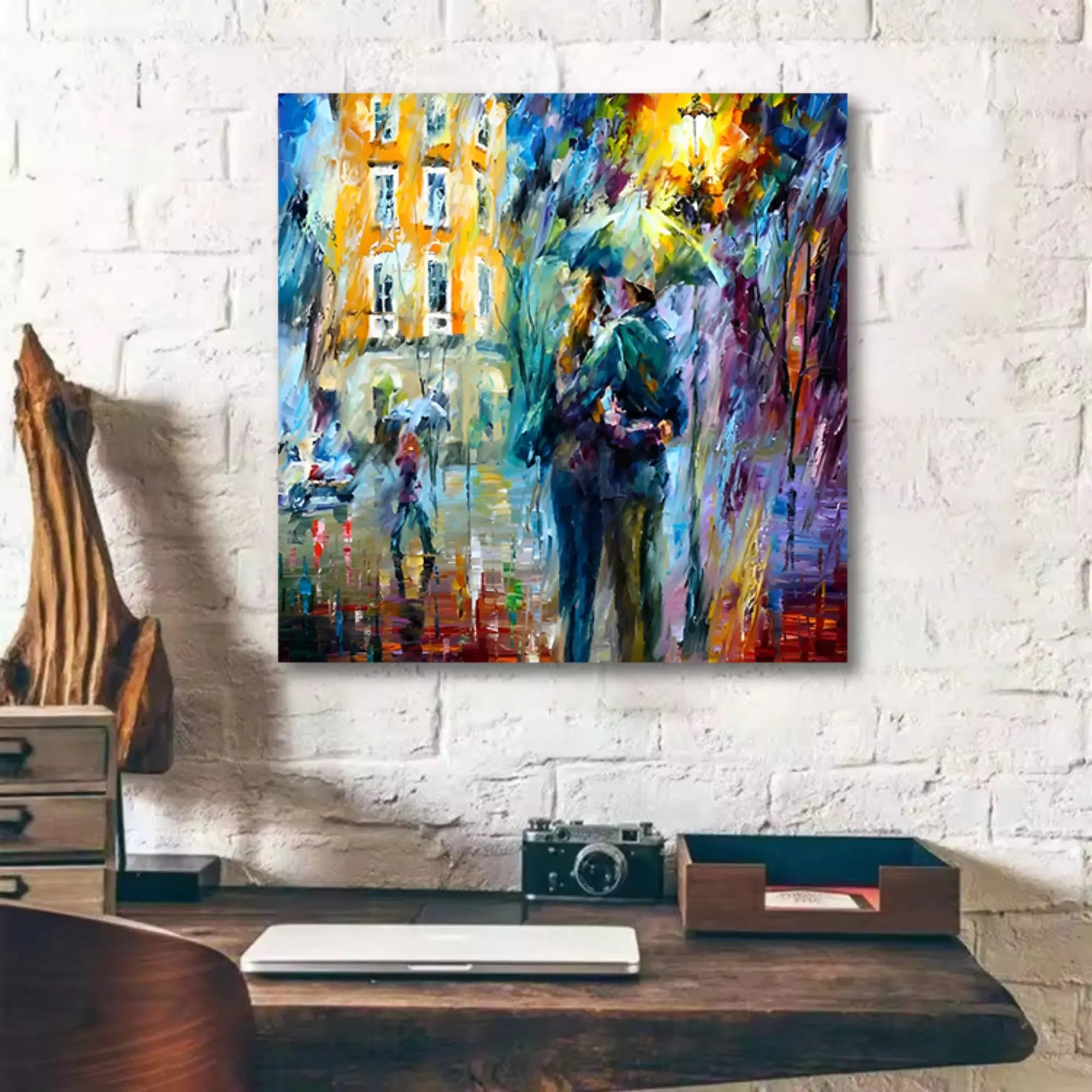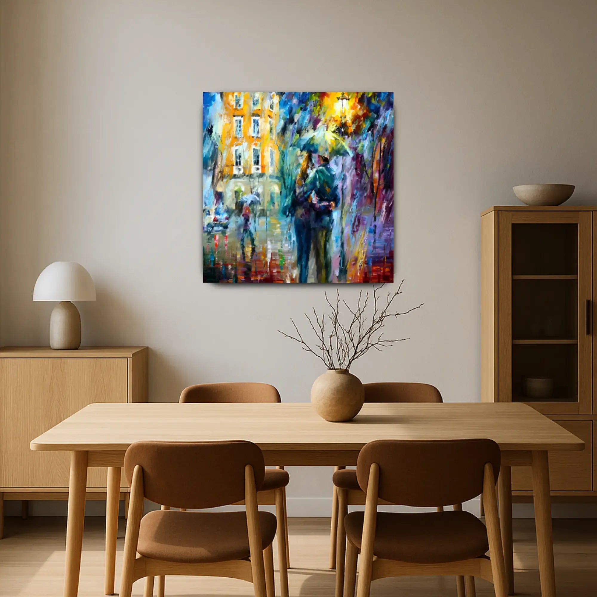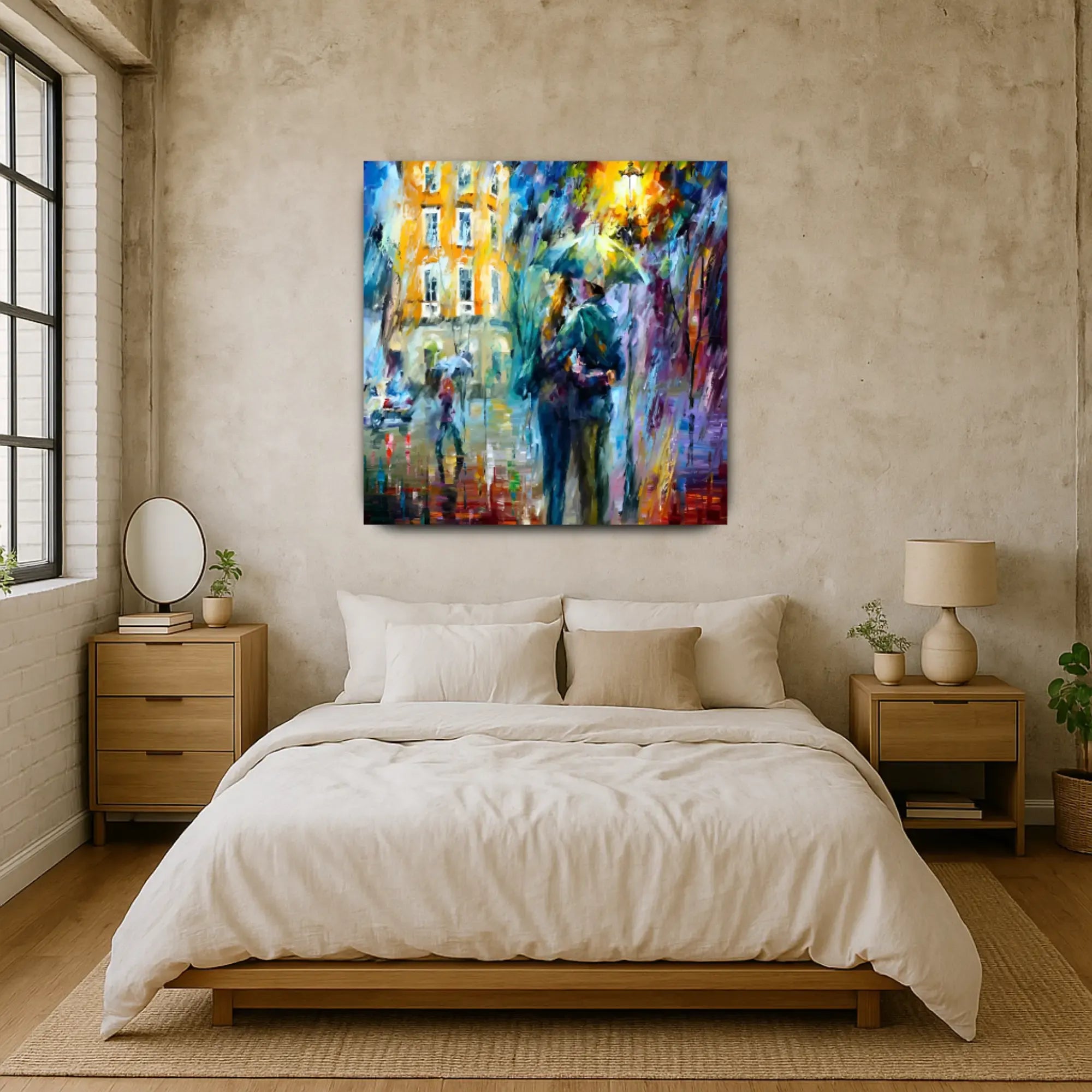 Frei interpretiert nach Afremovs ikonischen Regen-Szenen, stellt dieses Werk nicht den Regen selbst, sondern das Gefühl der Geborgenheit im Regen in den Mittelpunkt – eine Ode an Liebe, Licht und flüchtige Nähe.