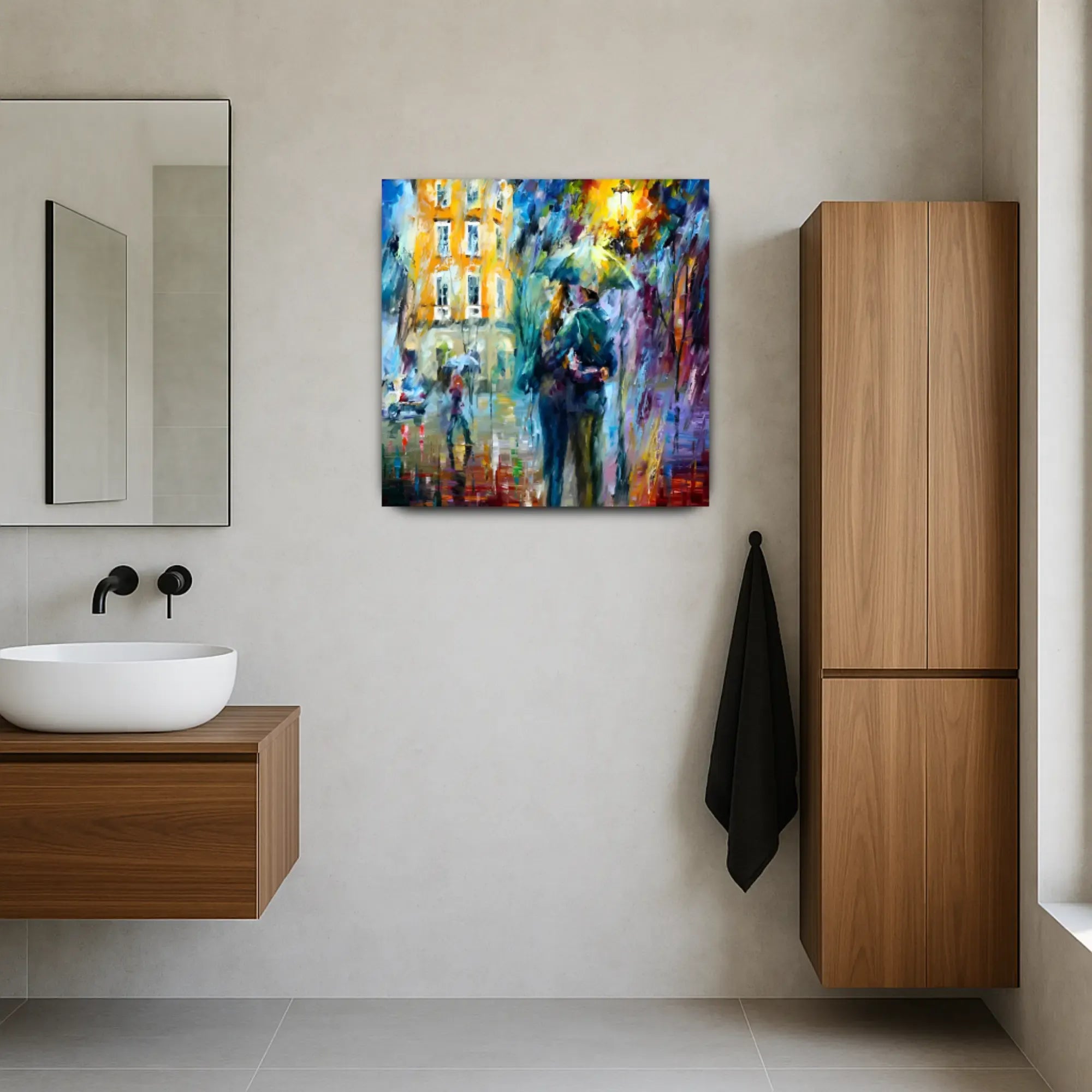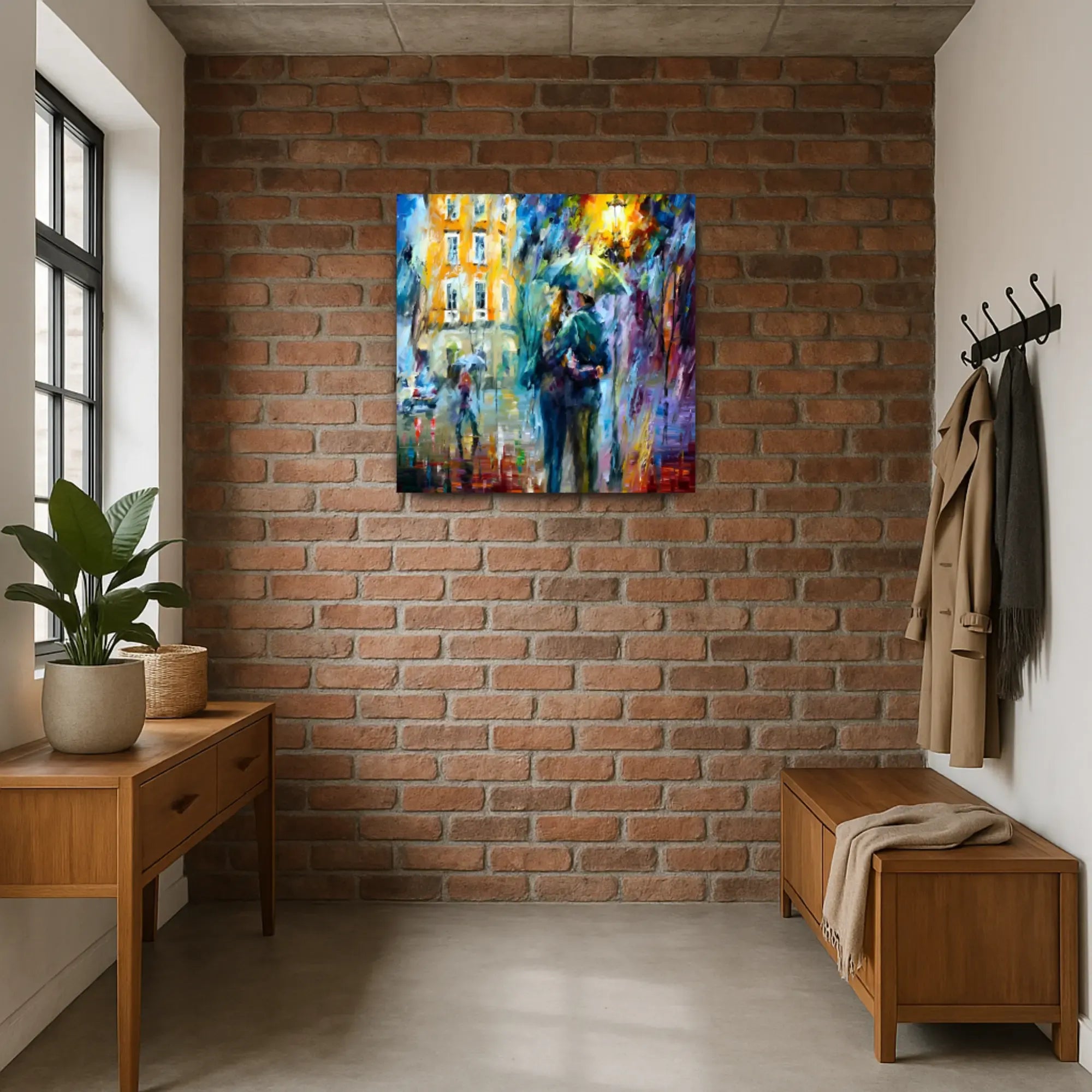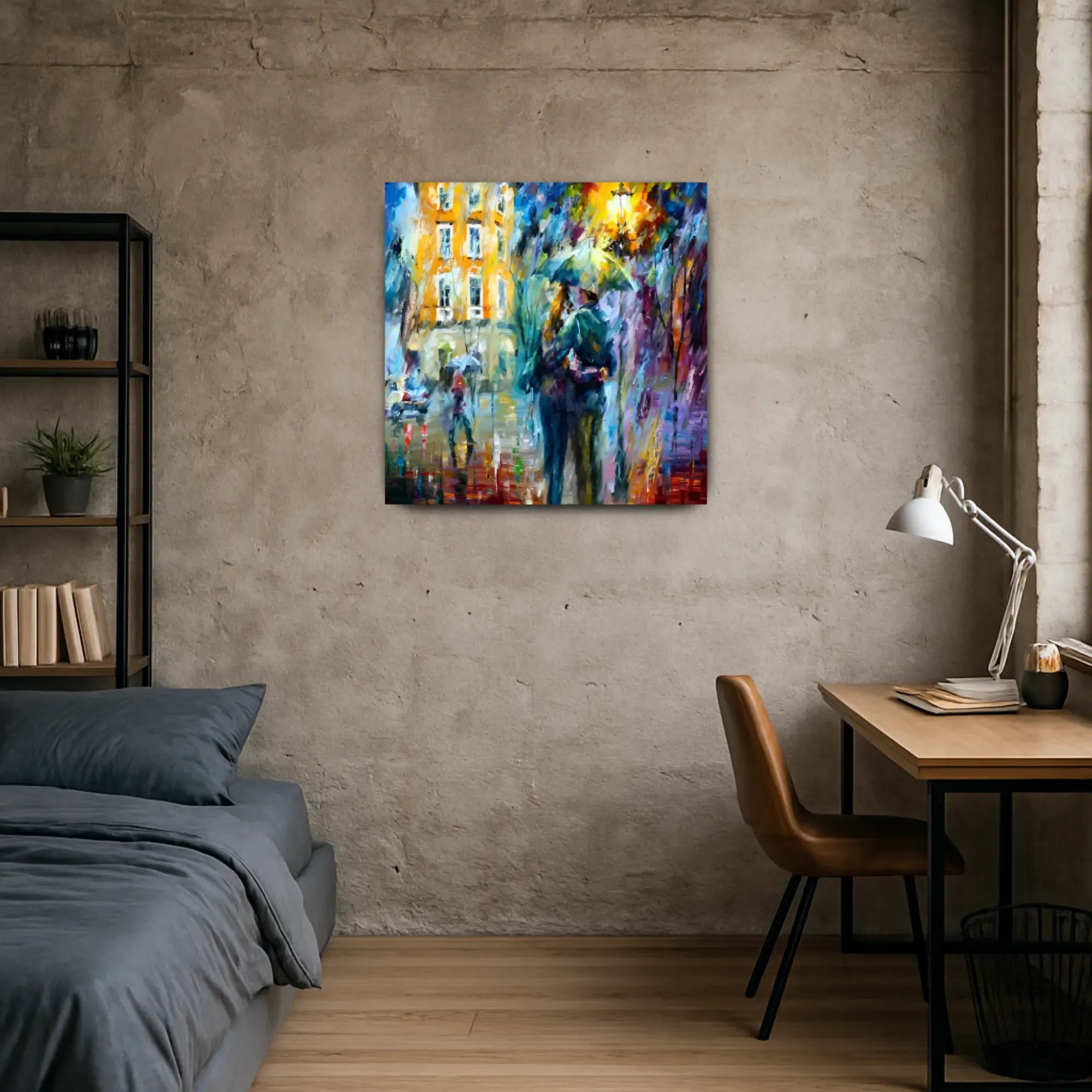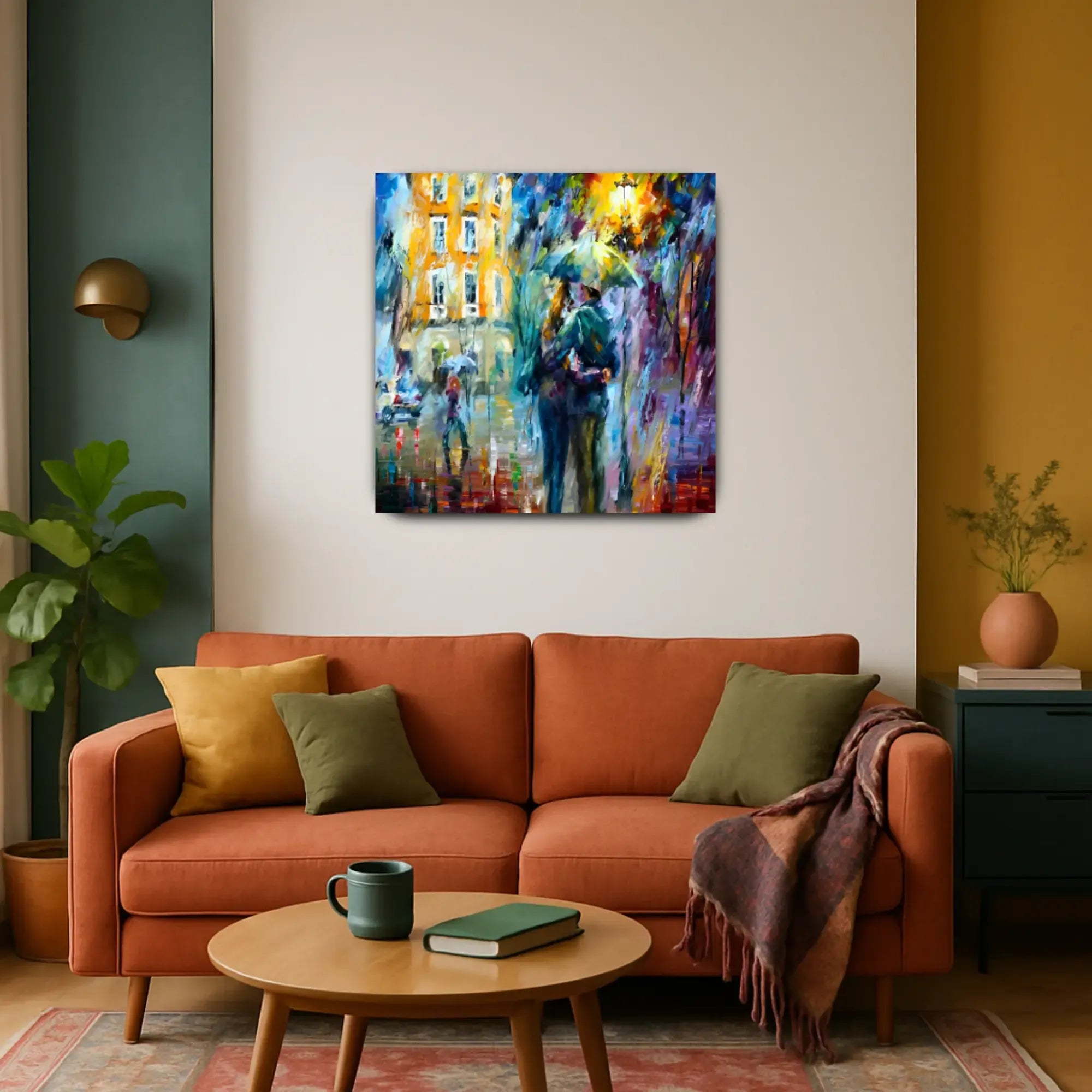Frei interpretiert nach Afremovs ikonischen Regen-Szenen, stellt dieses Werk nicht den Regen selbst, sondern das Gefühl der Geborgenheit im Regen in den Mittelpunkt – eine Ode an Liebe, Licht und flüchtige Nähe.