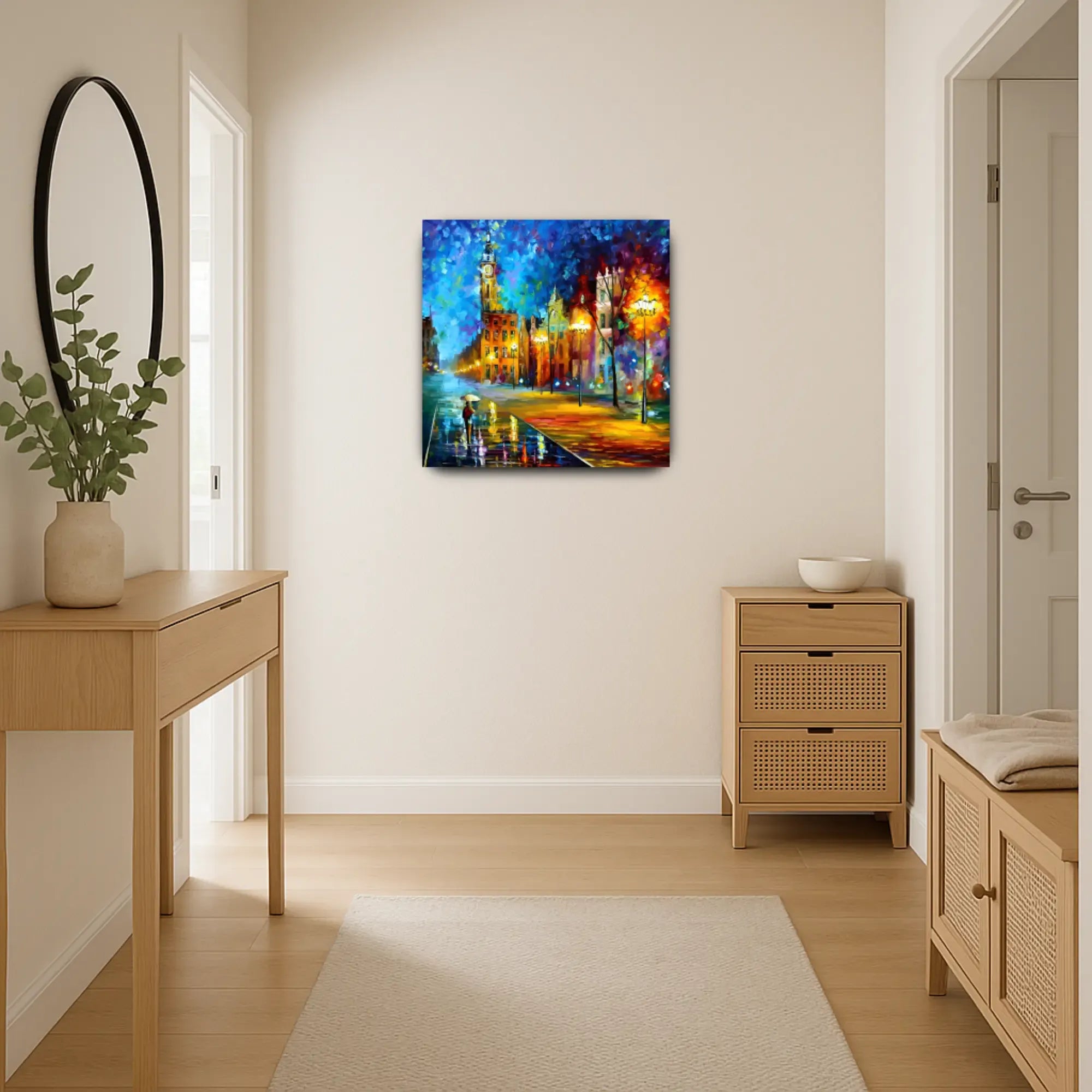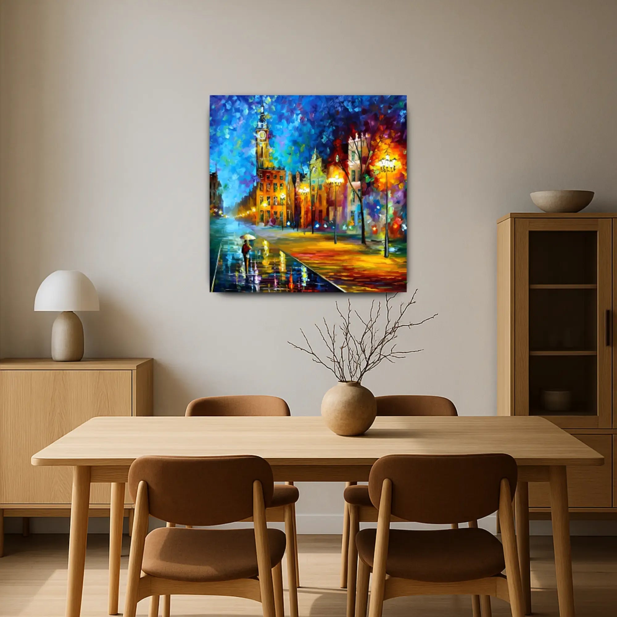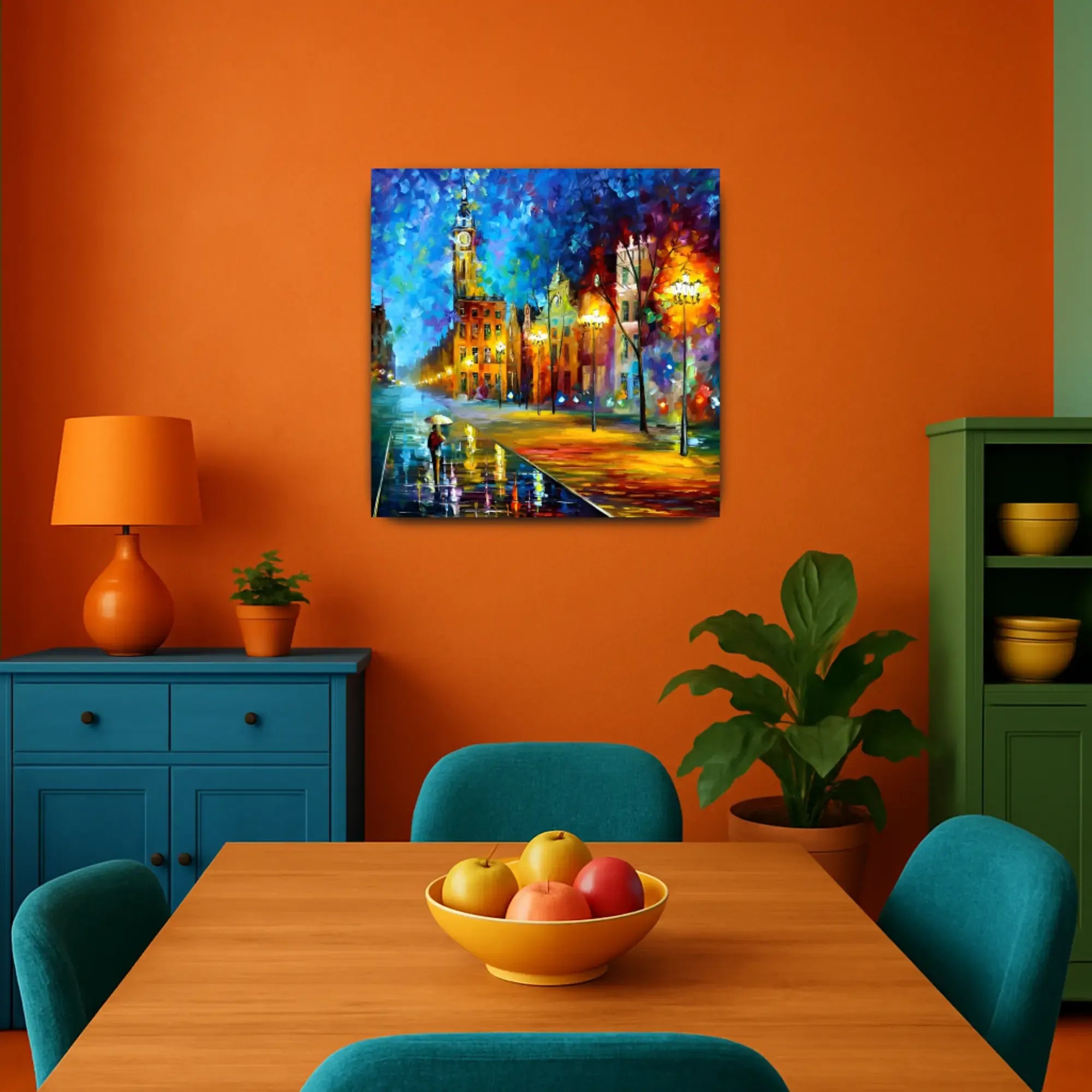 Künstler: Anna VorobevaTechnik: Öl auf Leinwand, pastose Spachteltechnik mit expressivem DuktusStil: Neo-Impressionismus / Urbaner FarbexpressionismusFarbgebung: Intensives Spiel aus Kobaltblau, Violett, Orange, Türkis und Lichtgelb – inspiriert vom unverkennbaren Farbspektrum Leonid Afremovs, das Lichtreflexe, Emotion und Bewegung in leuchtende Farbflächen übersetztMotiv: Abendliche Straßenszene mit historischer Architektur, hell erleuchteten Laternen und einer Person mit Regenschirm – Spiegelungen auf nasser Pflasterung