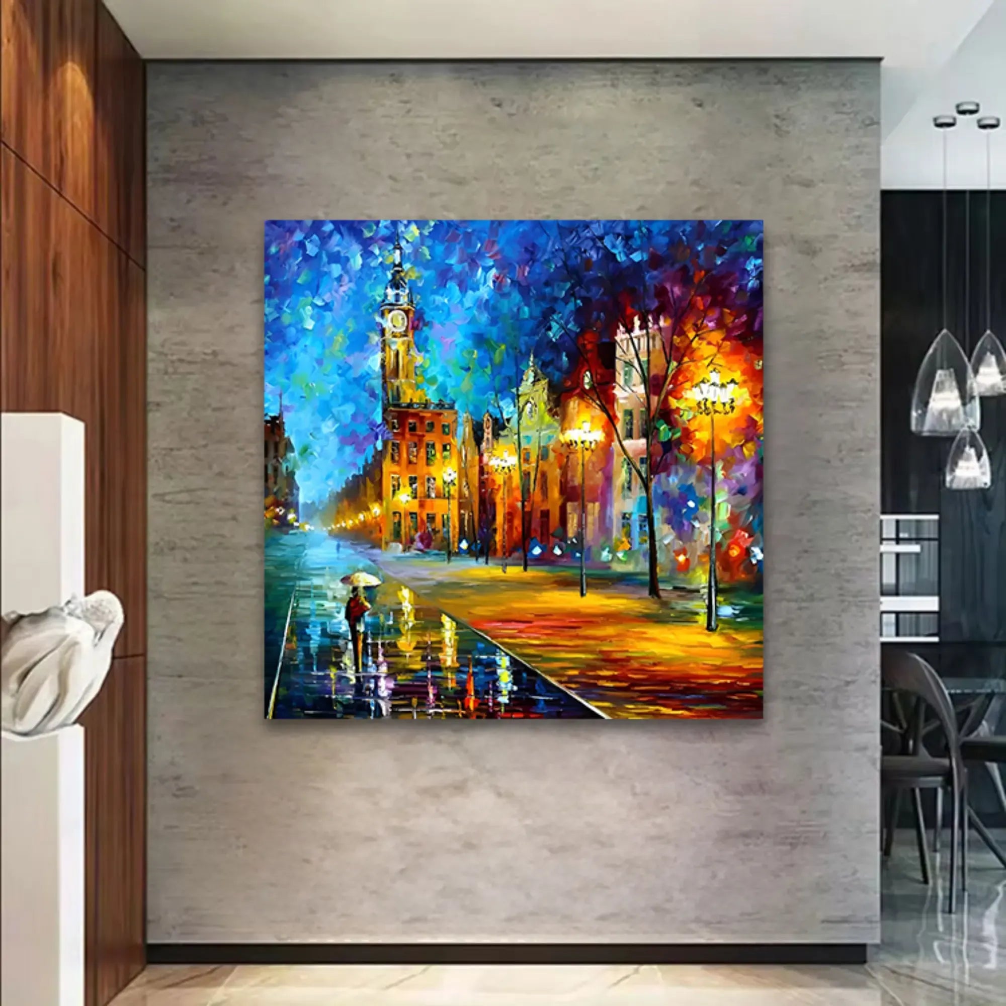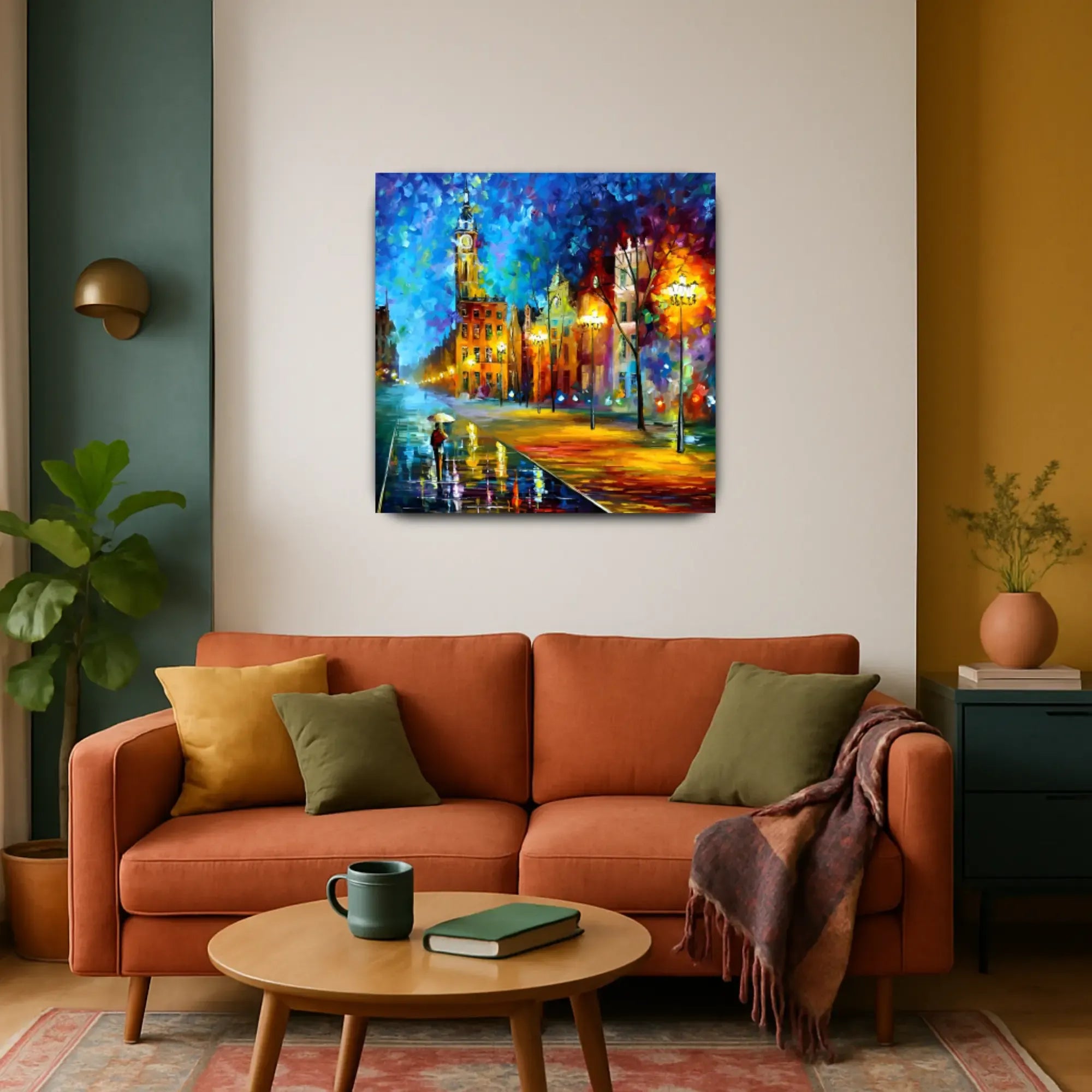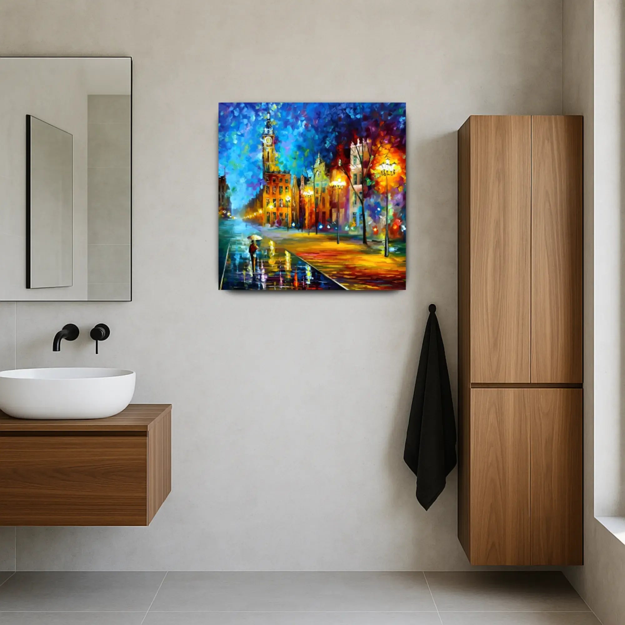Künstler: Anna VorobevaTechnik: Öl auf Leinwand, pastose Spachteltechnik mit expressivem DuktusStil: Neo-Impressionismus / Urbaner FarbexpressionismusFarbgebung: Intensives Spiel aus Kobaltblau, Violett, Orange, Türkis und Lichtgelb – inspiriert vom unverkennbaren Farbspektrum Leonid Afremovs, das Lichtreflexe, Emotion und Bewegung in leuchtende Farbflächen übersetztMotiv: Abendliche Straßenszene mit historischer Architektur, hell erleuchteten Laternen und einer Person mit Regenschirm – Spiegelungen auf nasser Pflasterung