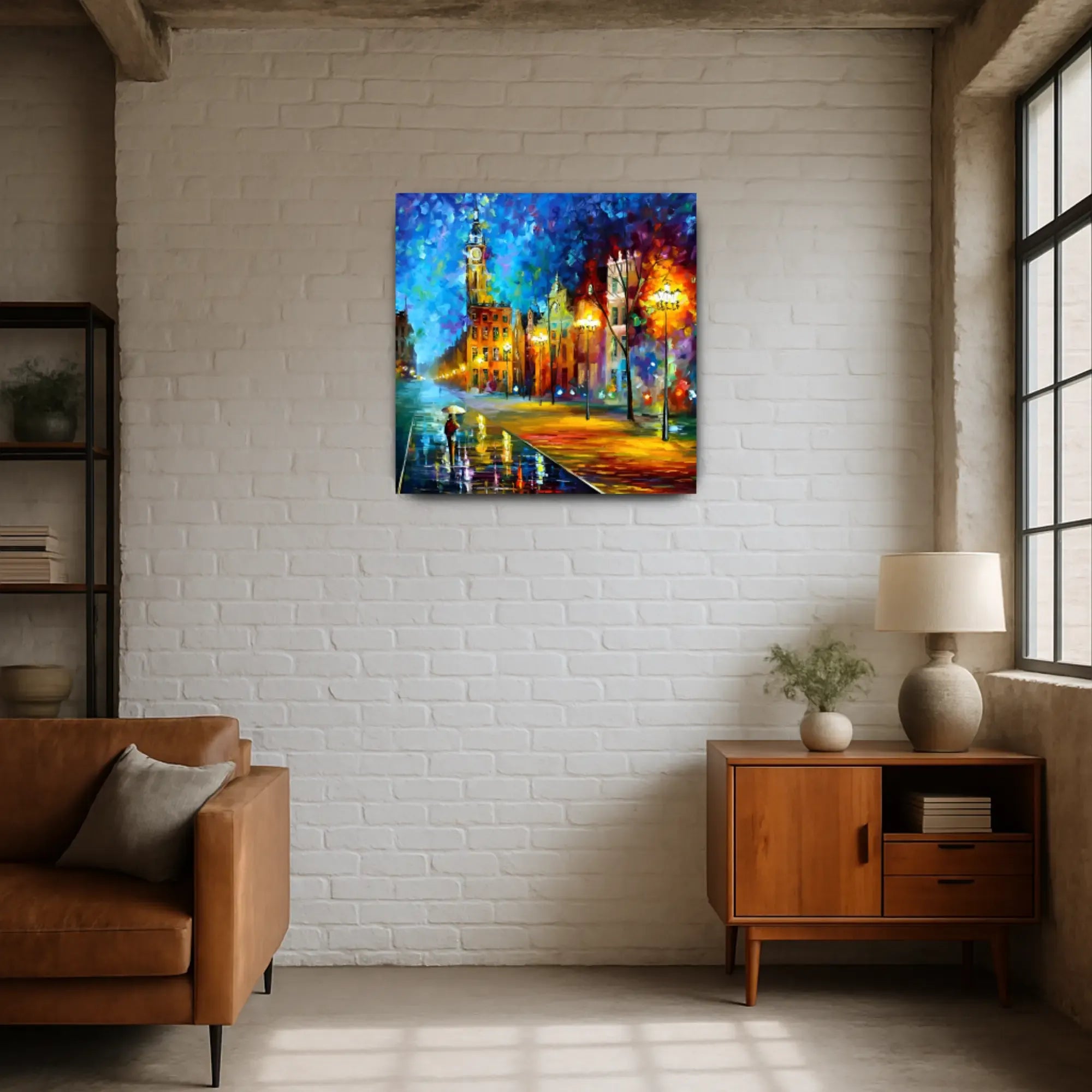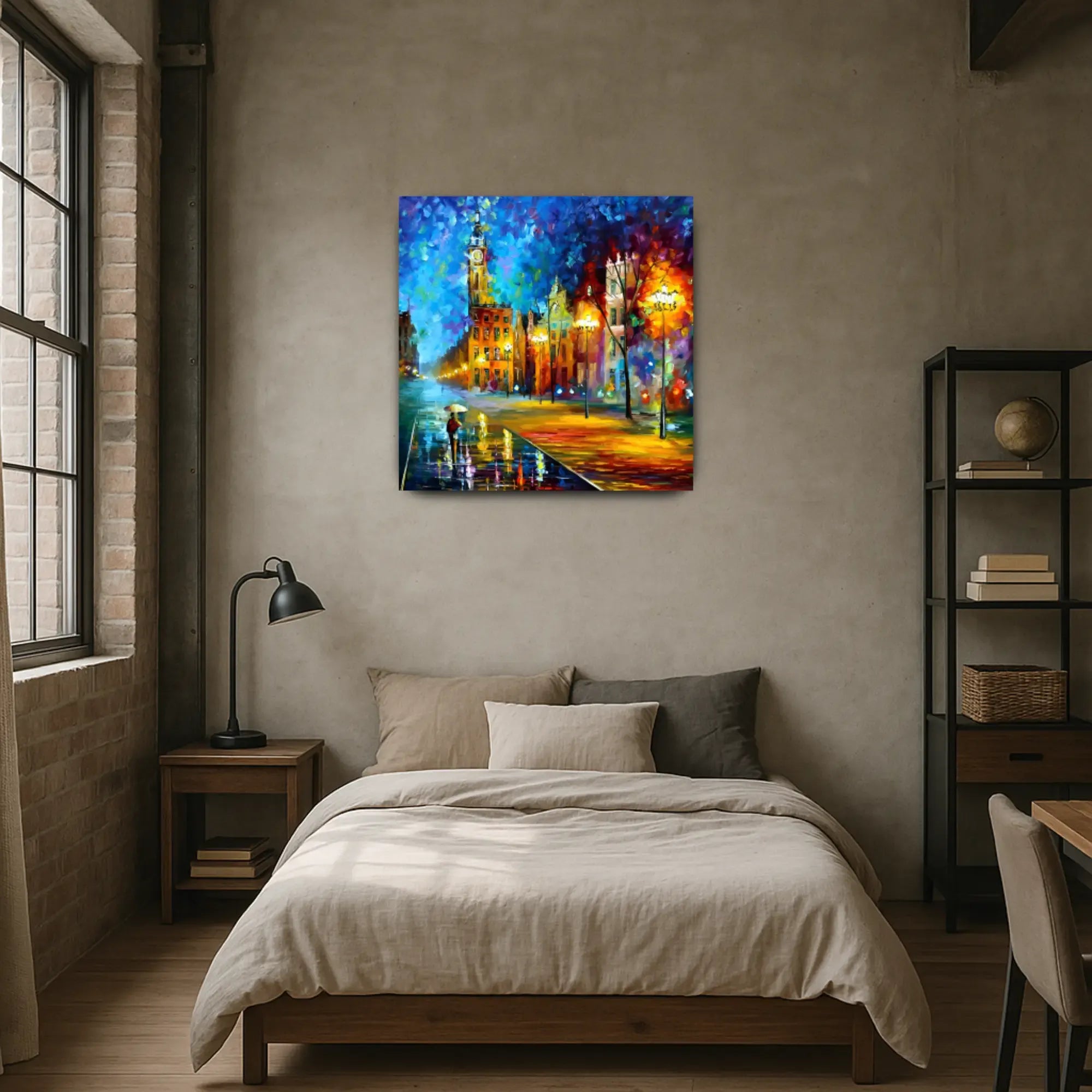 Frei nachempfunden der Handschrift Afremovs, lässt dieses Werk die Poesie des Alltäglichen aufleben – wo Licht die Nacht durchdringt und die Einsamkeit zur Kontemplation wird.