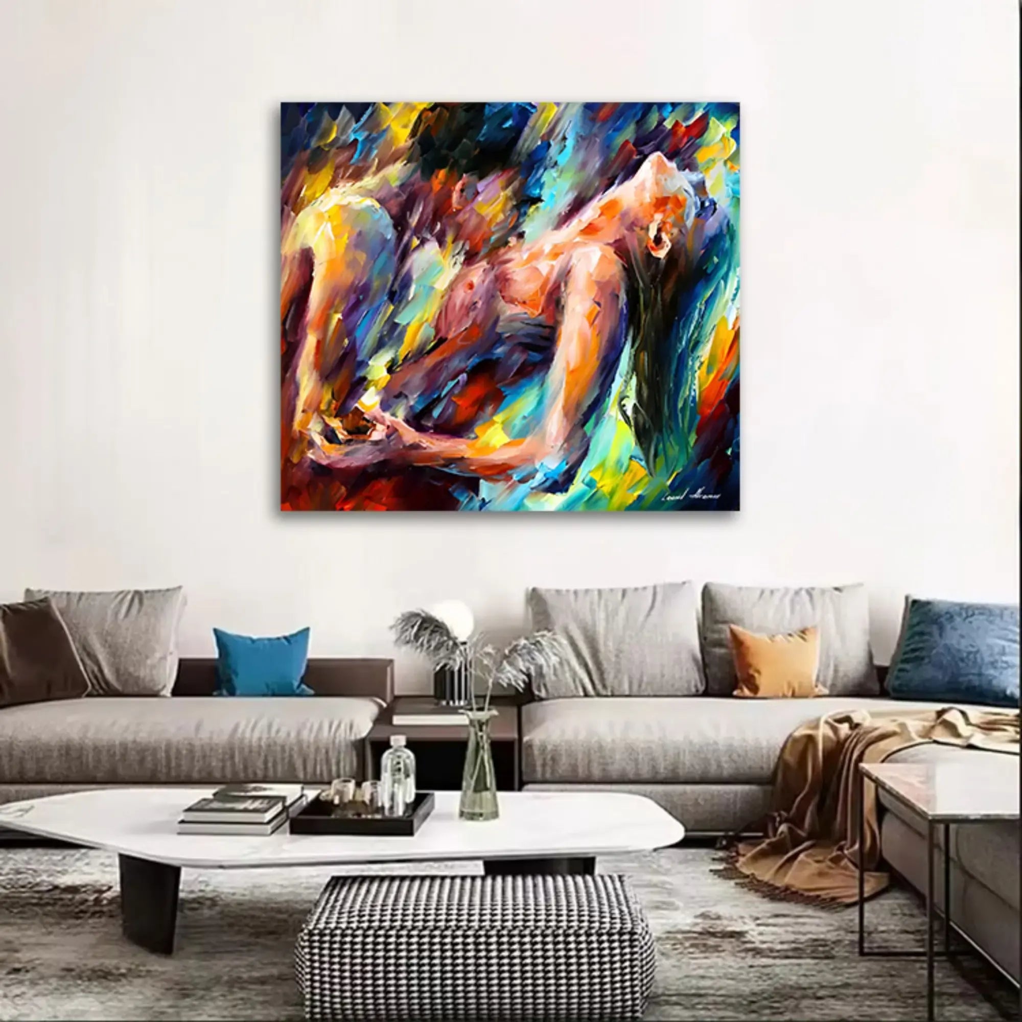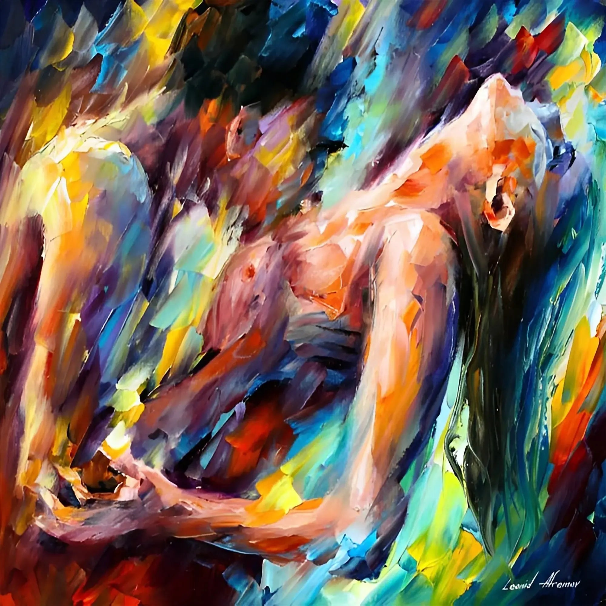 Die Farbpalette ist typisch für Leonid Afremovs Stil: feurige Rot- und Orangetöne mischen sich mit kühlem Kobaltblau, Smaragdgrün, Violett und sonnigem Gelb. Die Körperform ist nur angedeutet, fast flüchtig – ein Spiel aus Licht, Energie und Verlangen. Trotz der Intensität bleibt das Bild stilisiert und träumerisch – der Akt wird nicht voyeuristisch, sondern emotional, beinahe spirituell erzählt.