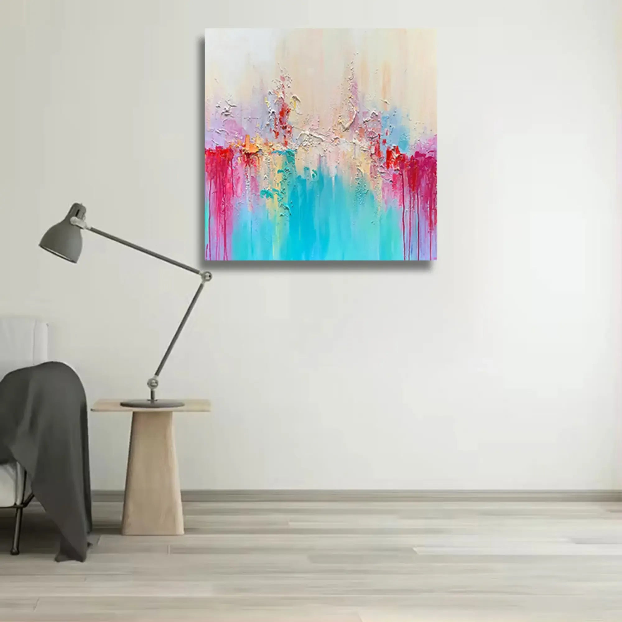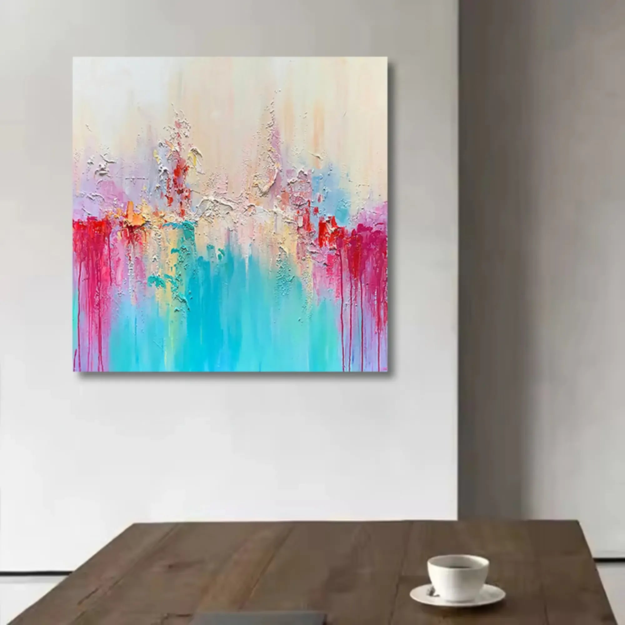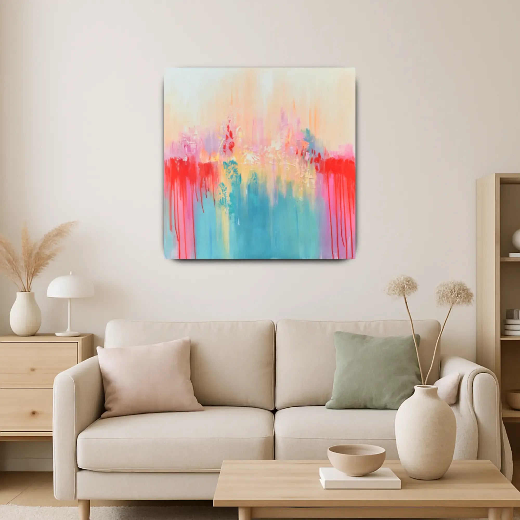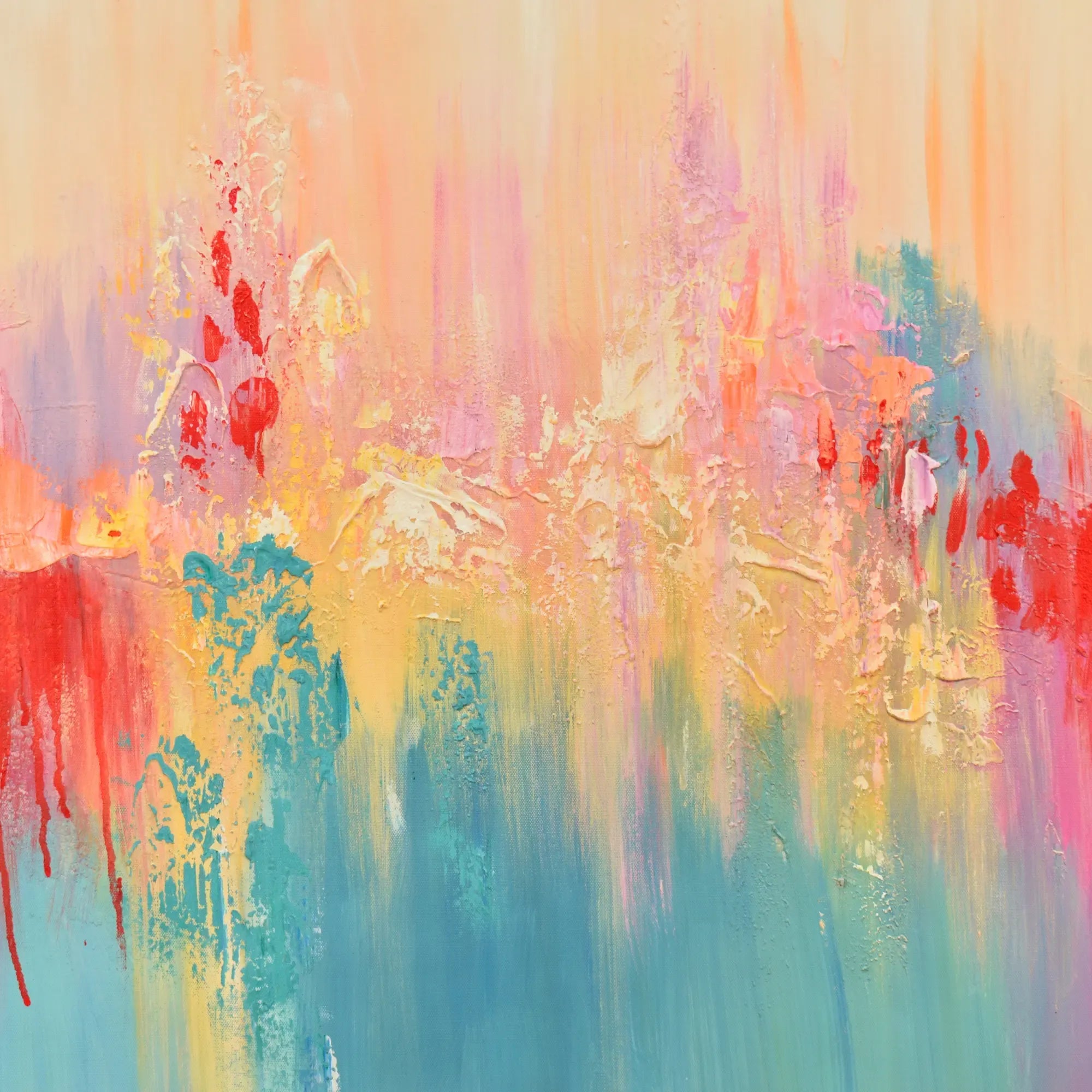 Künstler: Anna VorobevaTechnik: Öl auf Leinwand, mit Spachtelmasse und Lasurtechnik, teilweise pastosStil: Abstrakter Expressionismus / FarbfeldmalereiFarbgebung: Zarte Übergänge in Creme, Türkis, Violett, Rosa und Apricot – durchbrochen von impulsivem Karminrot und goldenen AkzentenKomposition: Horizontale Schichtung, dynamische Farbverläufe, bewusste Tropfenbildung und flächige Verläufe