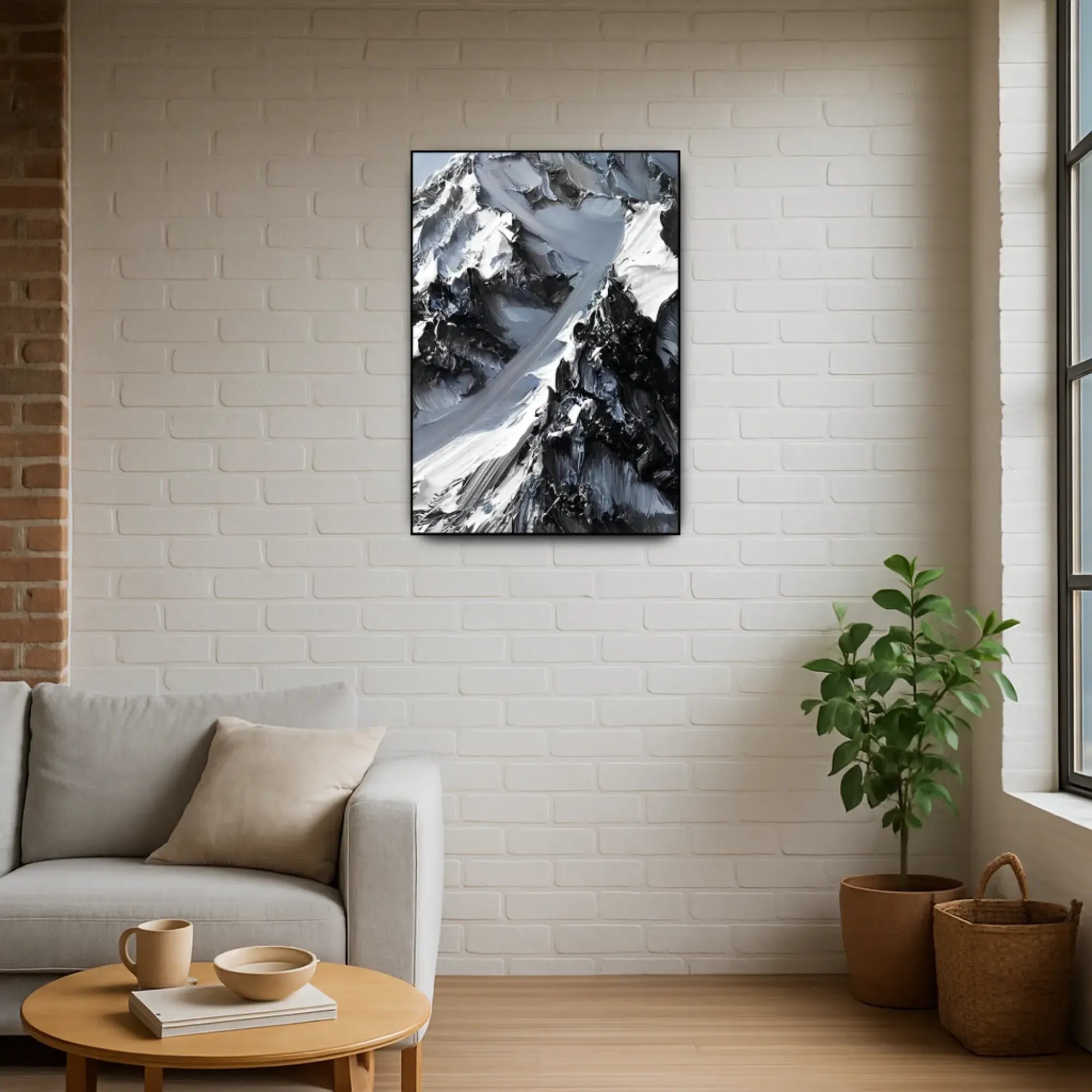 Bedeutung:„Schwarzweiß der Stille“ ist ein Gemälde der Extreme – von Höhe, Kälte, Struktur. Es zeigt keine Farbe, aber unendlich viele Zwischentöne. Die kräftige Textur fängt Wind, Eis und Gestein ein – roh, erhaben, ungezähmt. Ein visuelles Erlebnis zwischen Naturgewalt und Meditation – wie ein Blick in eine stille, mächtige Winterwelt.