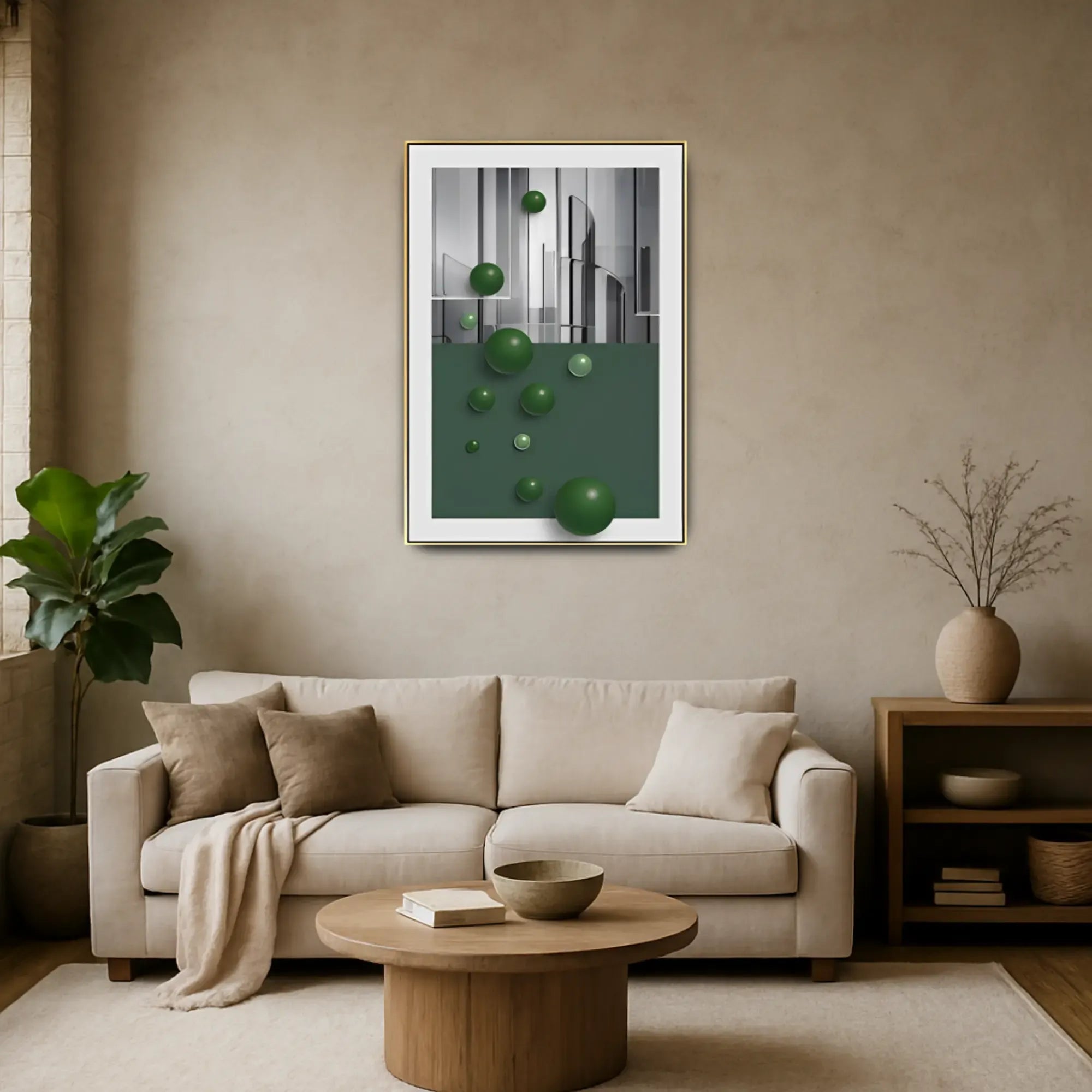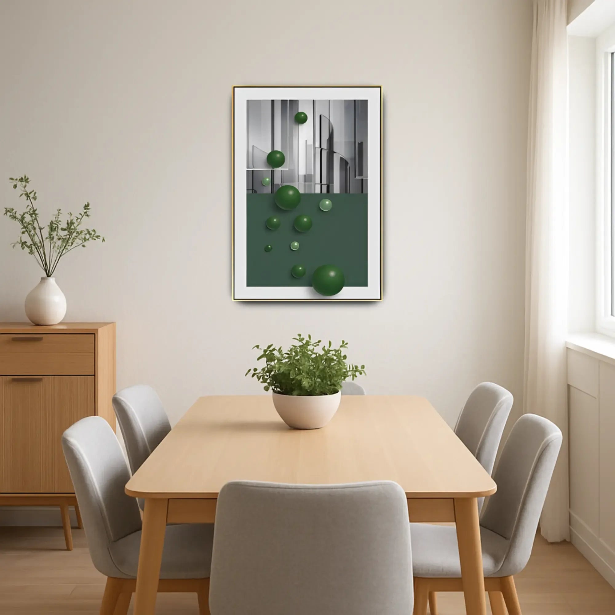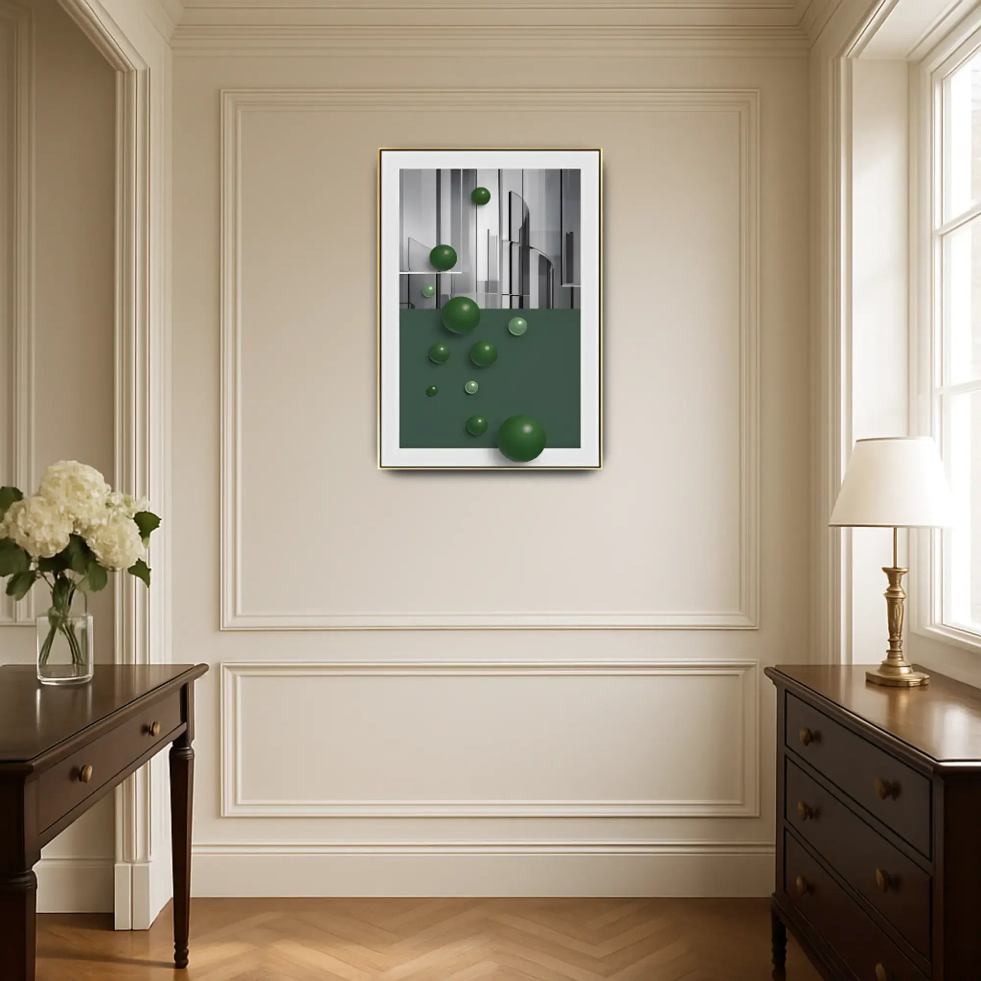 Beschreibung:Dieses Werk des DWD Teams besticht durch seine klare Komposition aus sphärischen Formen und einem architektonisch anmutenden Hintergrund. Die grün glänzenden Kugeln scheinen im Raum zu schweben und erzeugen durch Licht und Schatten eine plastische Tiefe. Ein Kunstwerk mit moderner Eleganz – perfekt für minimalistische Interieurs mit Designanspruch und grafischem Feingefühl.