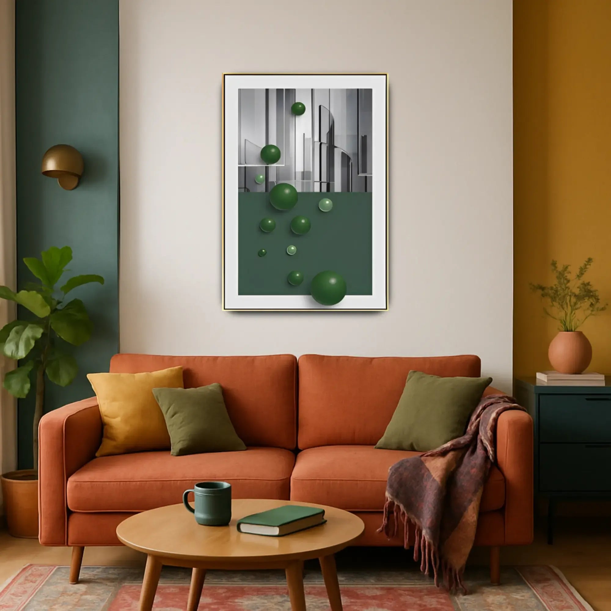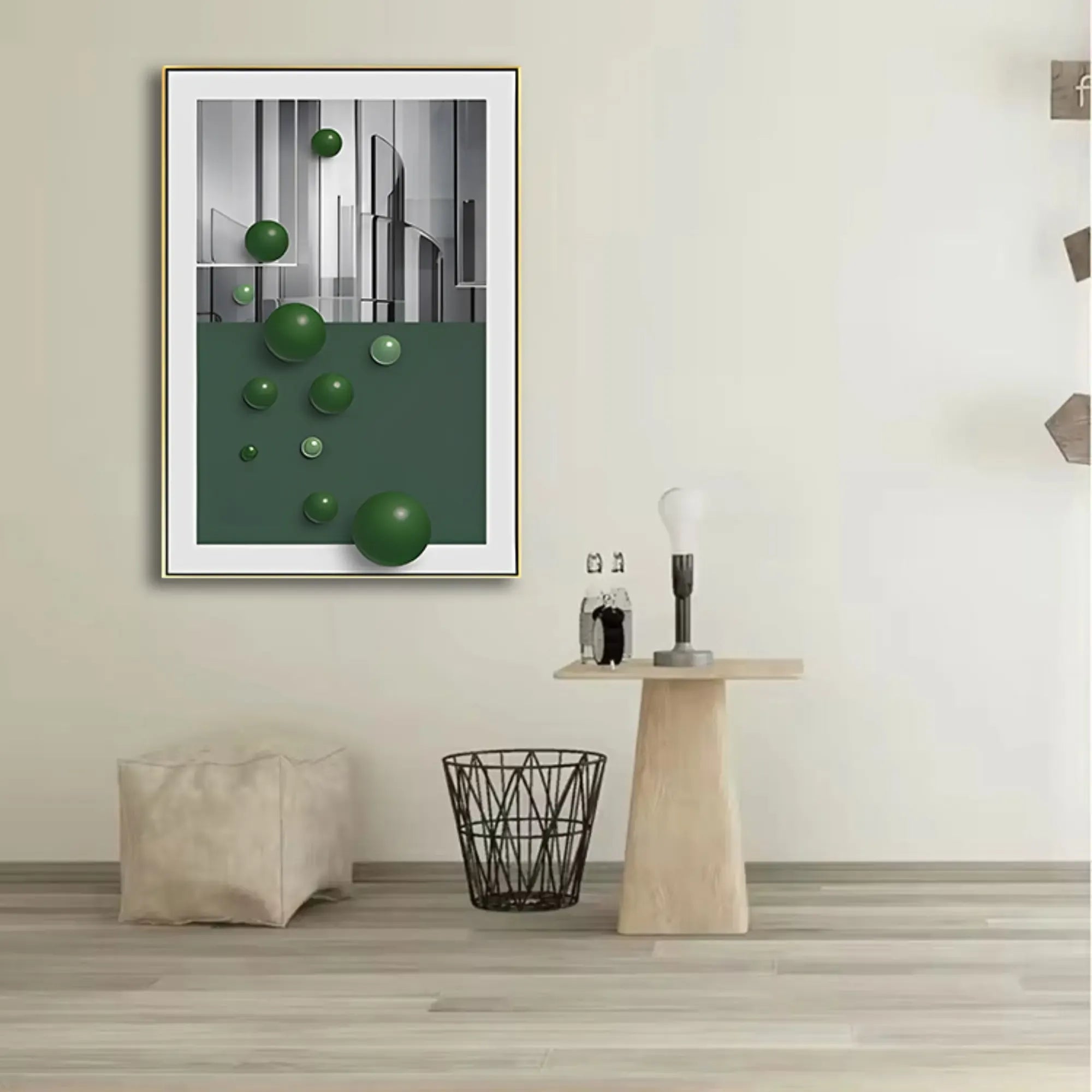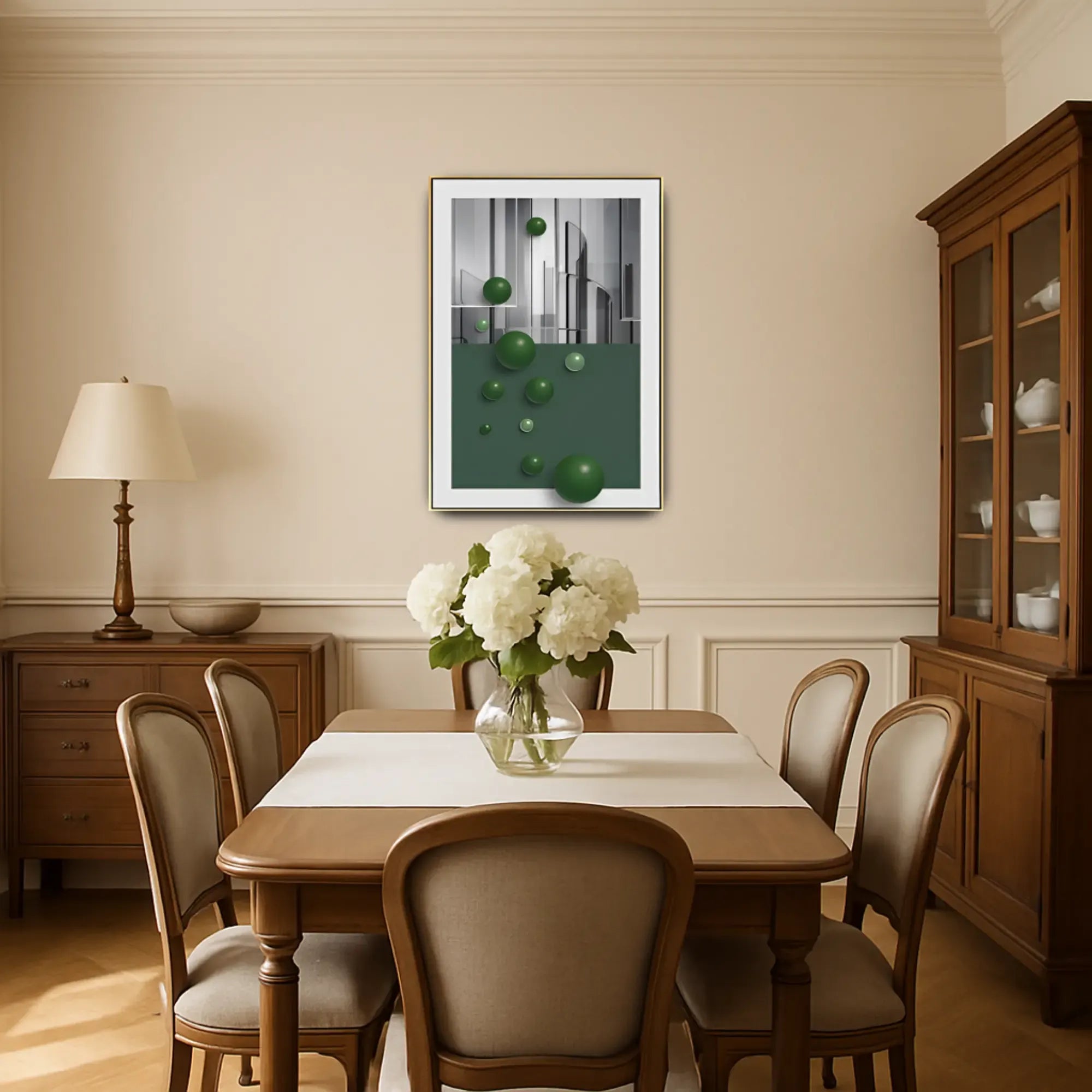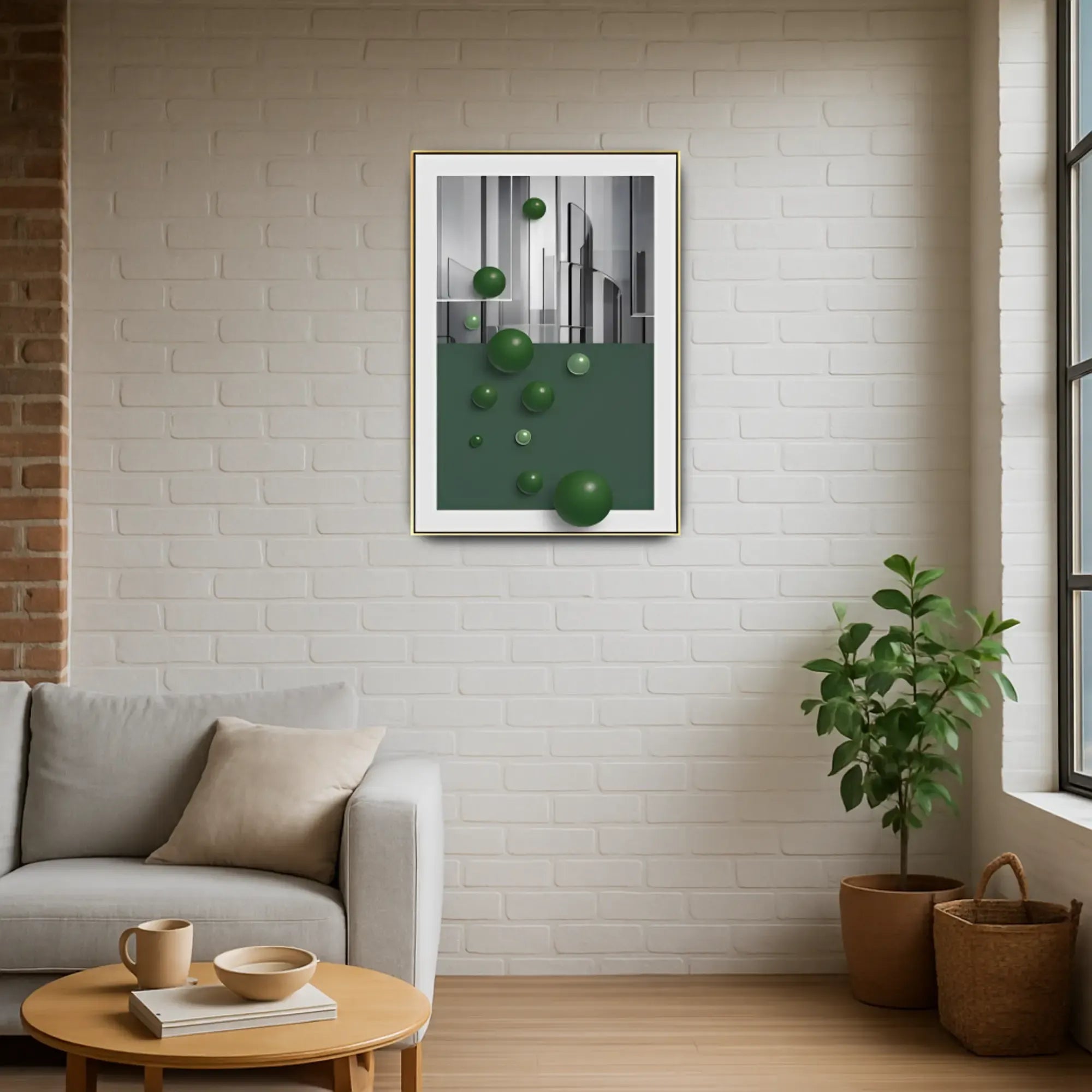 Beschreibung:Dieses Werk des DWD Teams besticht durch seine klare Komposition aus sphärischen Formen und einem architektonisch anmutenden Hintergrund. Die grün glänzenden Kugeln scheinen im Raum zu schweben und erzeugen durch Licht und Schatten eine plastische Tiefe. Ein Kunstwerk mit moderner Eleganz – perfekt für minimalistische Interieurs mit Designanspruch und grafischem Feingefühl.