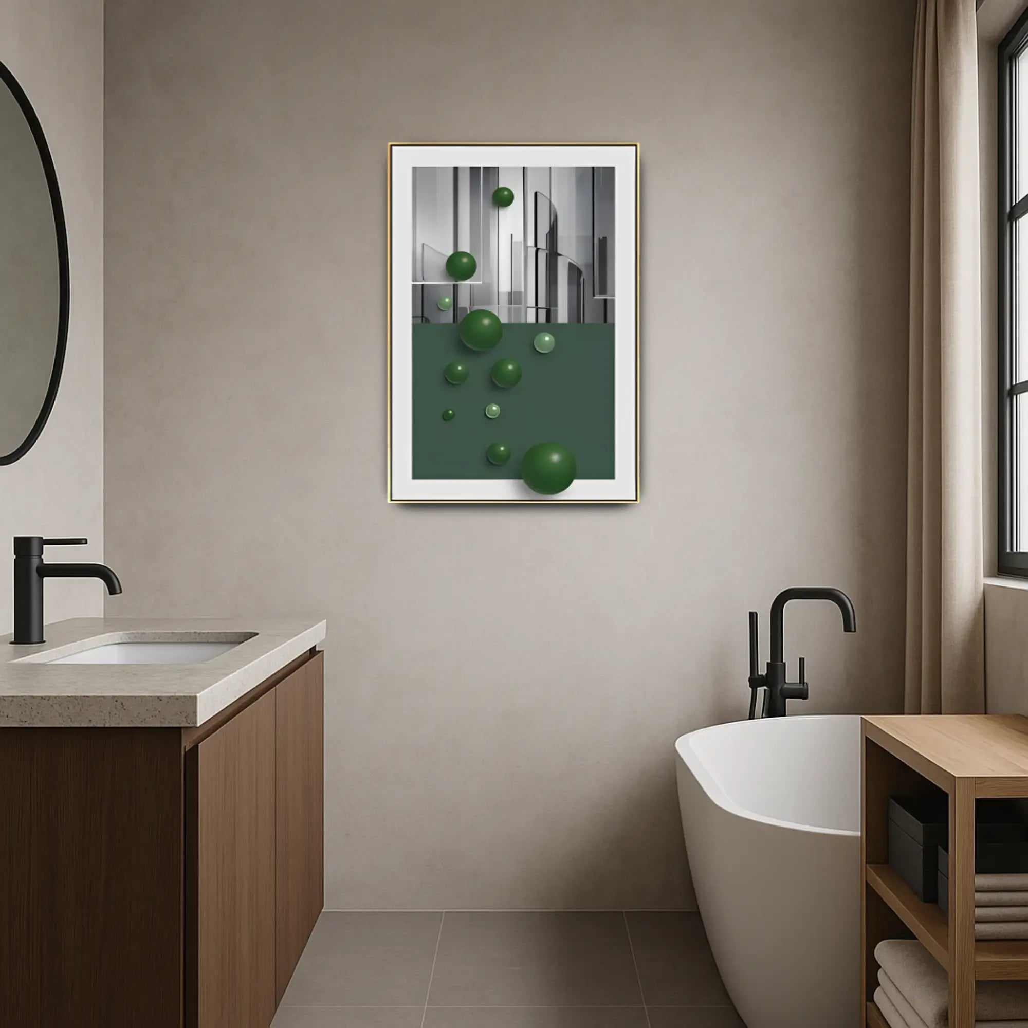 Ein modernes Spiel aus Form, Raum und Volumen: Dieses abstrakte Kunstwerk verbindet architektonische Linien mit sphärischen Elementen zu einer visuellen Komposition zwischen Rationalität und Leichtigkeit. Die untere Bildhälfte wird von matten, tiefgrünen Kugeln belebt, die sich plastisch vom glatten Fond abheben – fast schwebend, wie in einem stillen Dialog mit der Umgebung.
